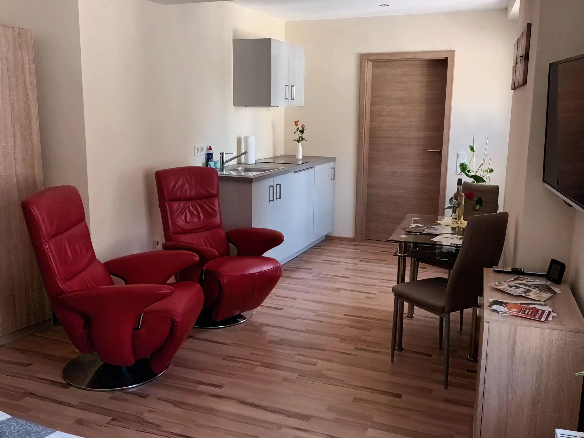Unser Appartment besteht aus einem Wohn-Schlafraum mit bequemer Sitzgelegenheit, kleiner Küchenzeile mit Kühlschrank und Kaffeemaschine. Küchenwäsche, Spülmittel und Küchenrolle sind vorhanden.
