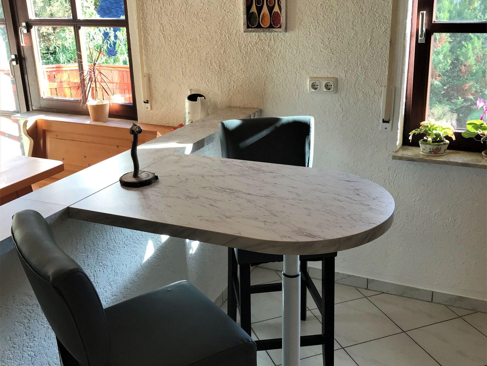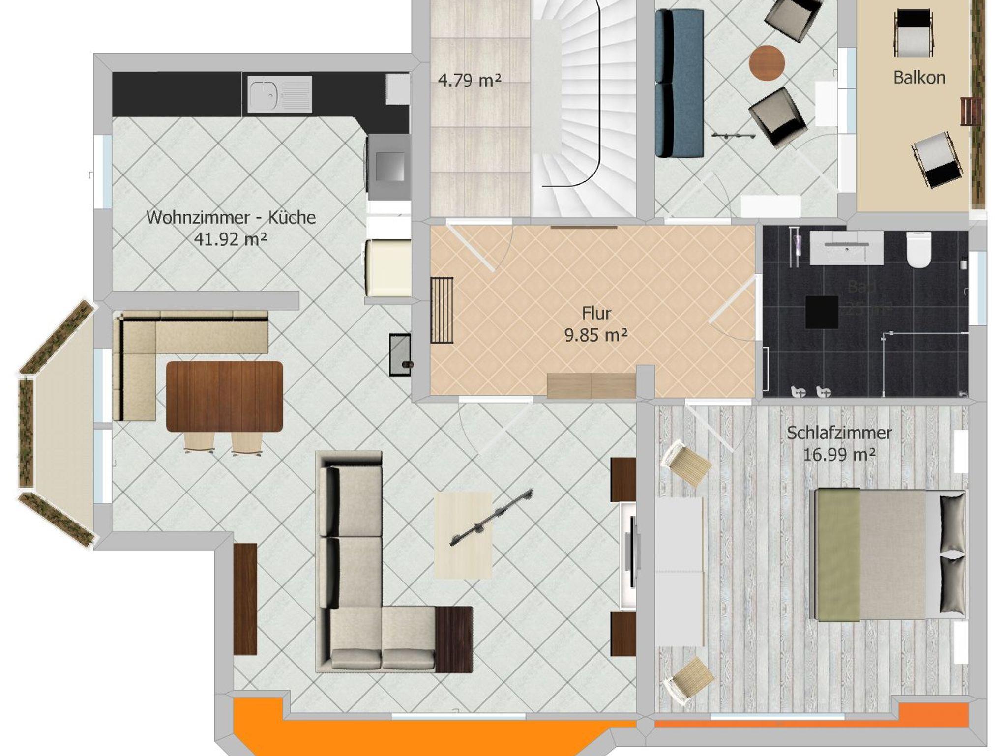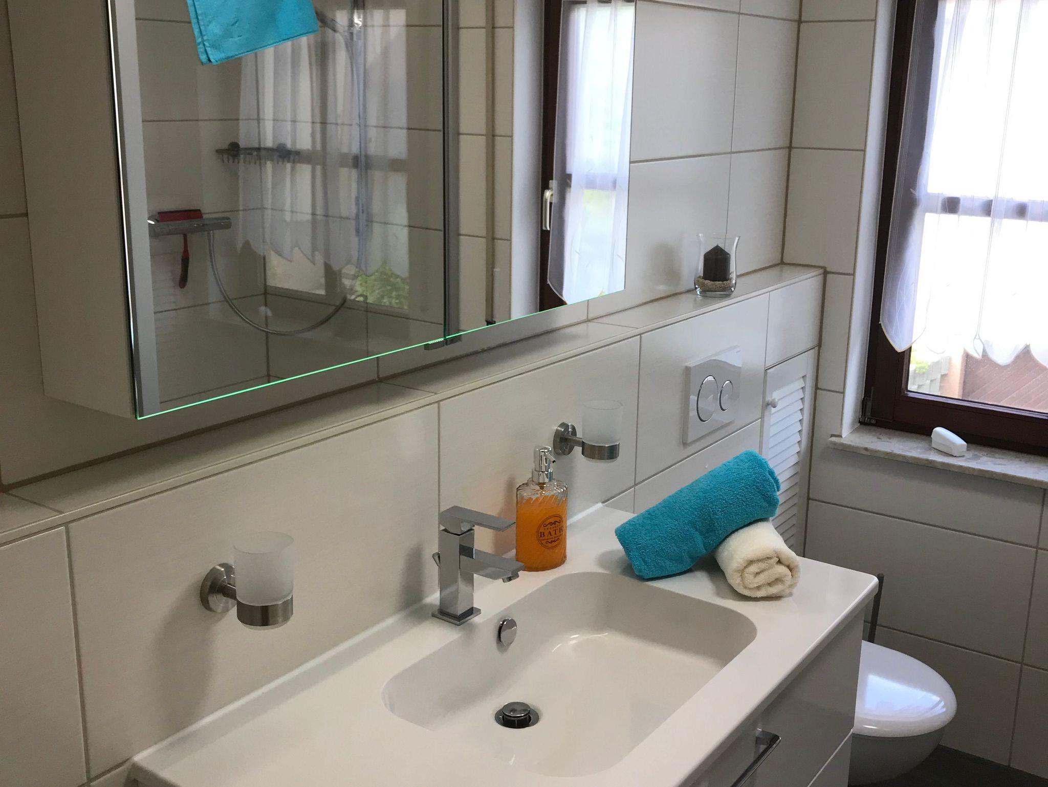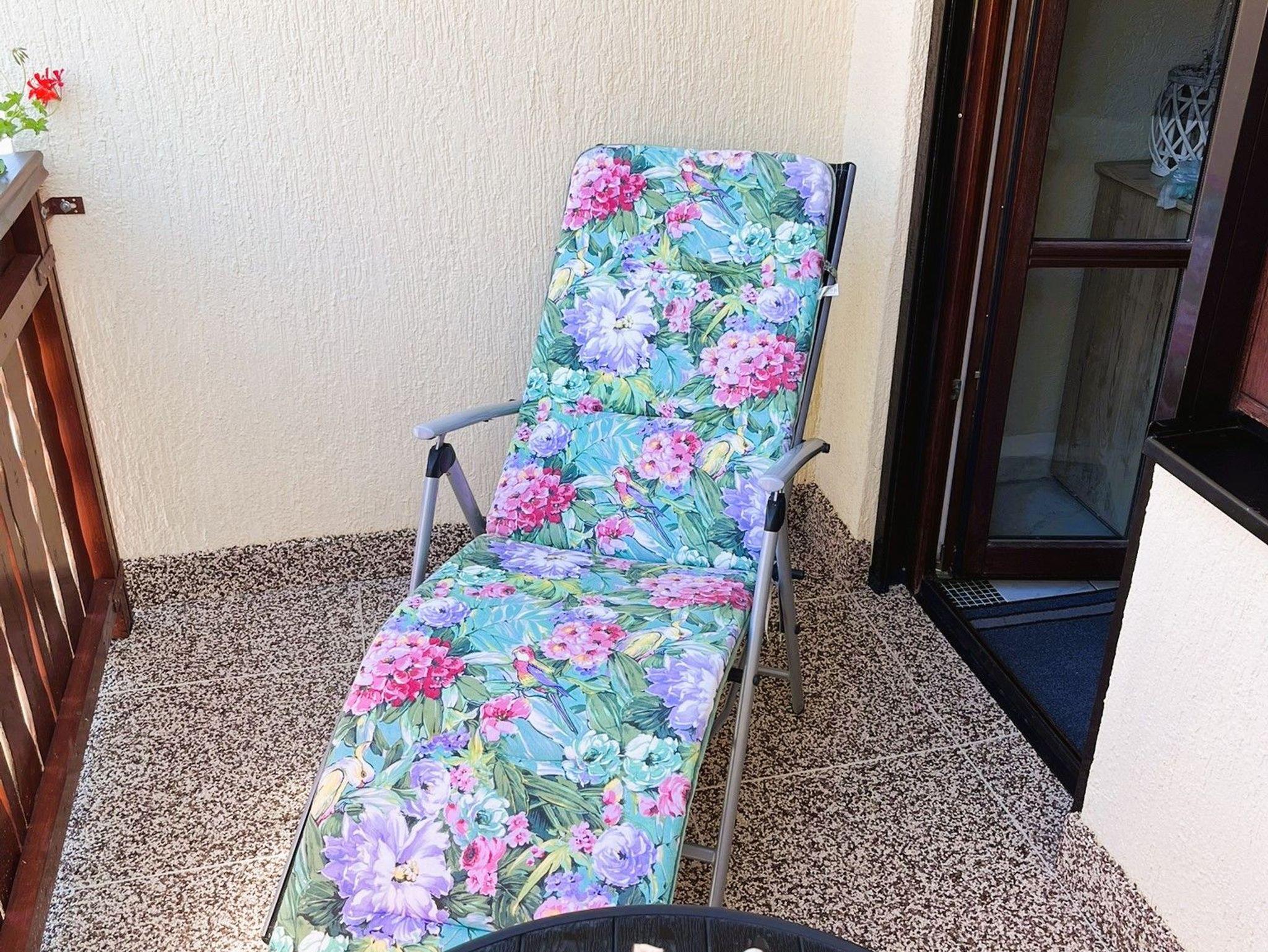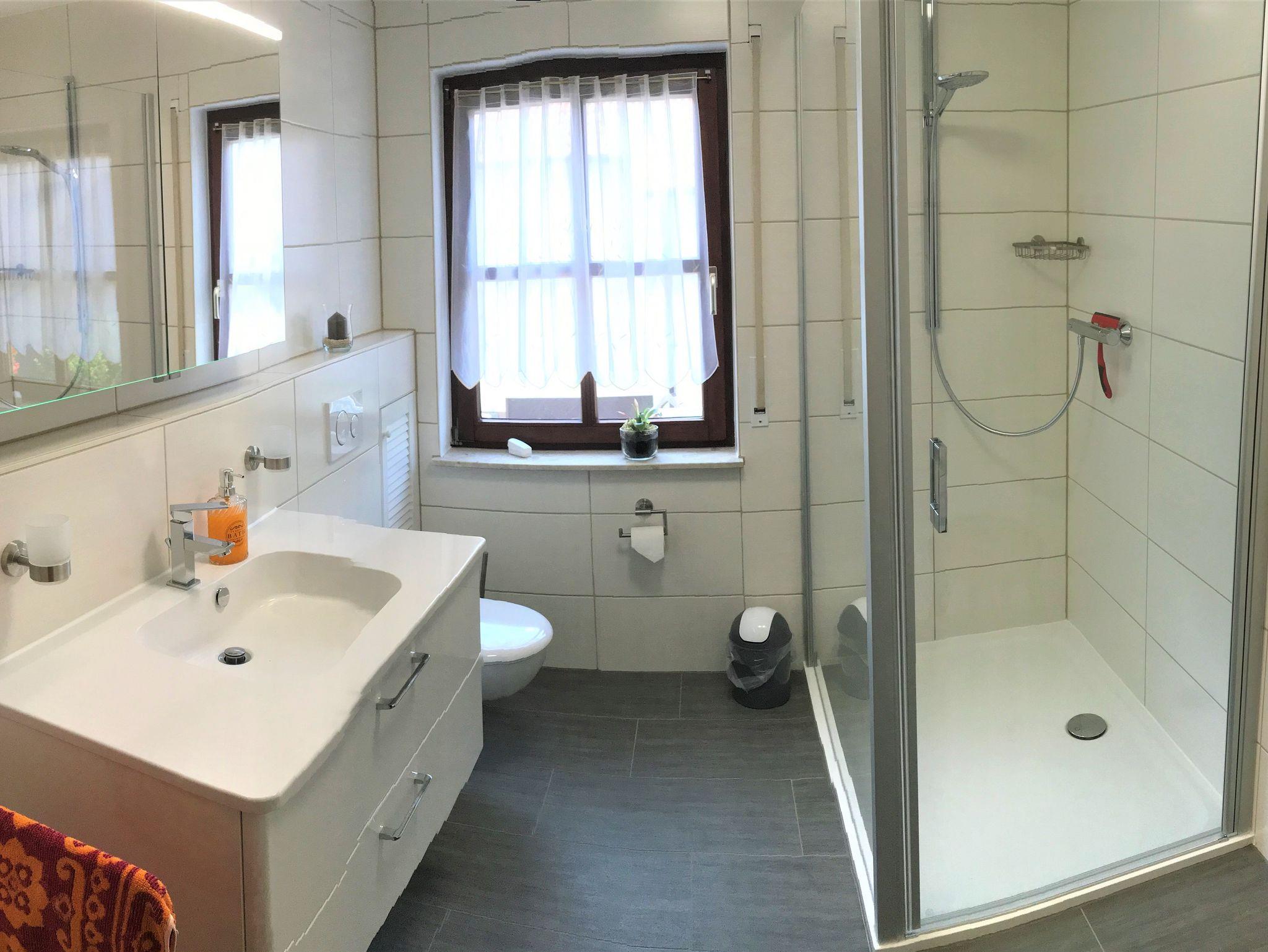 Die Ferienwohnung befindet sich im 1. OG bestehend aus Wohnzimmer mit Essbereich und offener Küche und einer Schlafcouch (ca. 2,00 m x 1,40 m), Schlafzimmer mit Doppelbett (ca. 2,00 m x 1,80 m), Relaxzimmer mit Klappcouch (ca. 1,90 m x 1,05 m), Bad mit geräumiger Dusche, Flur und 2 Balkonen.