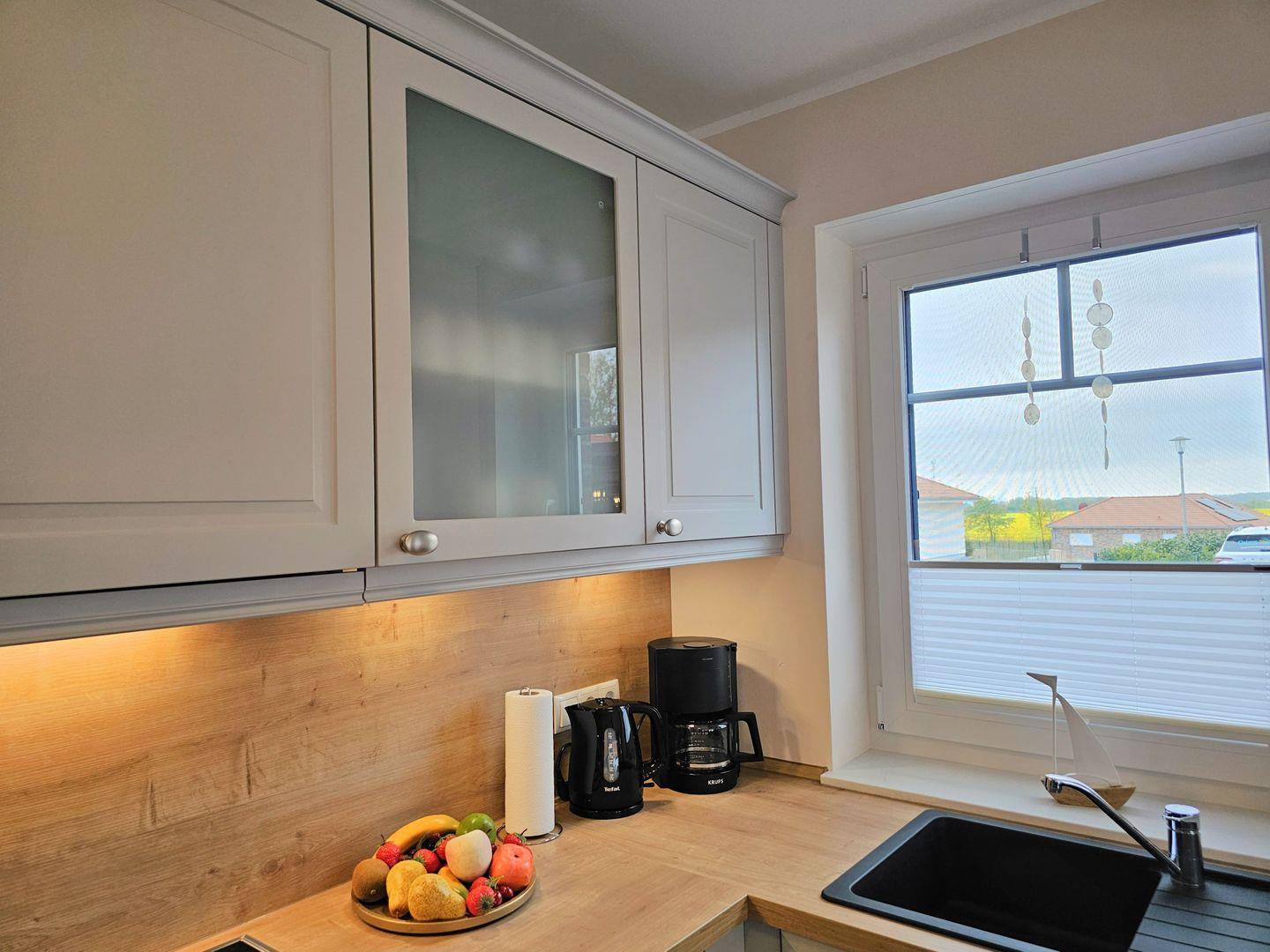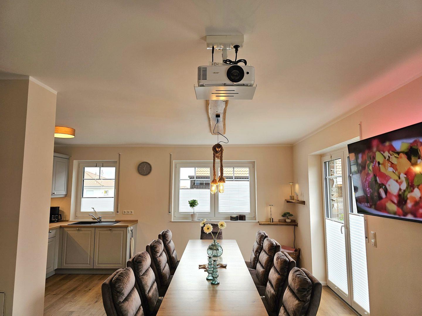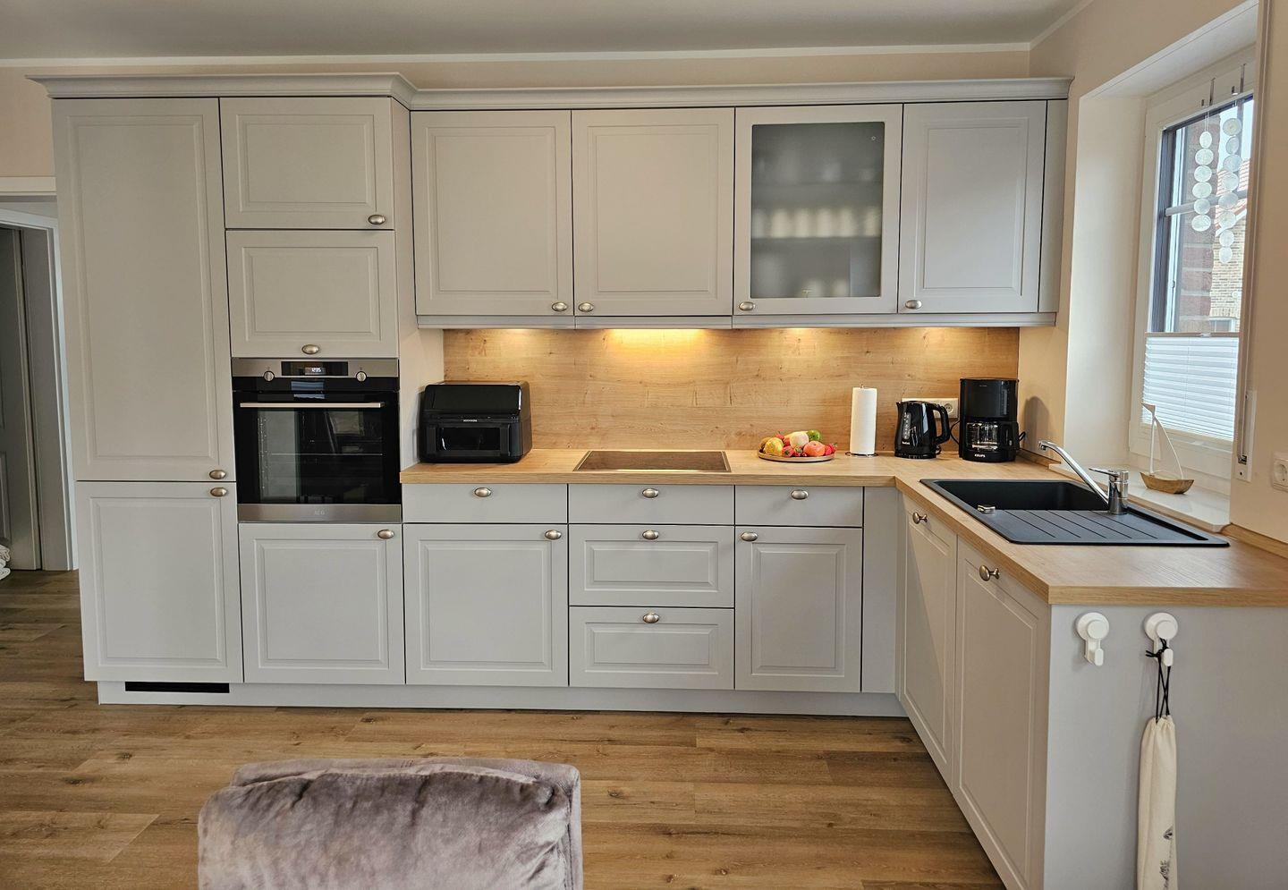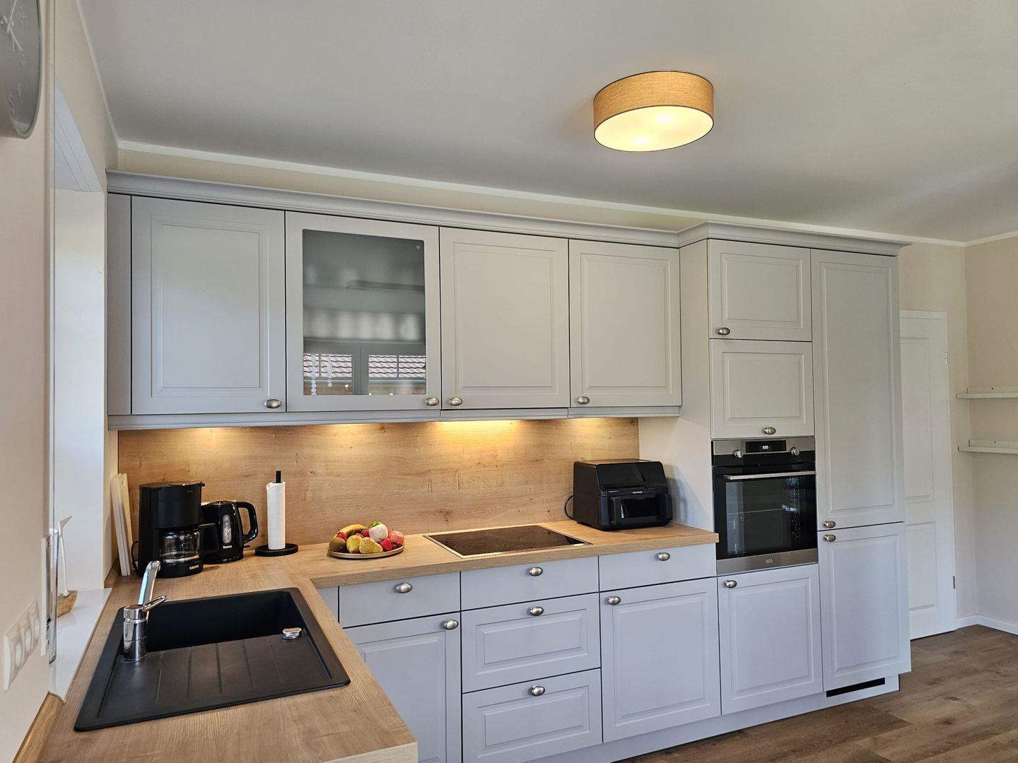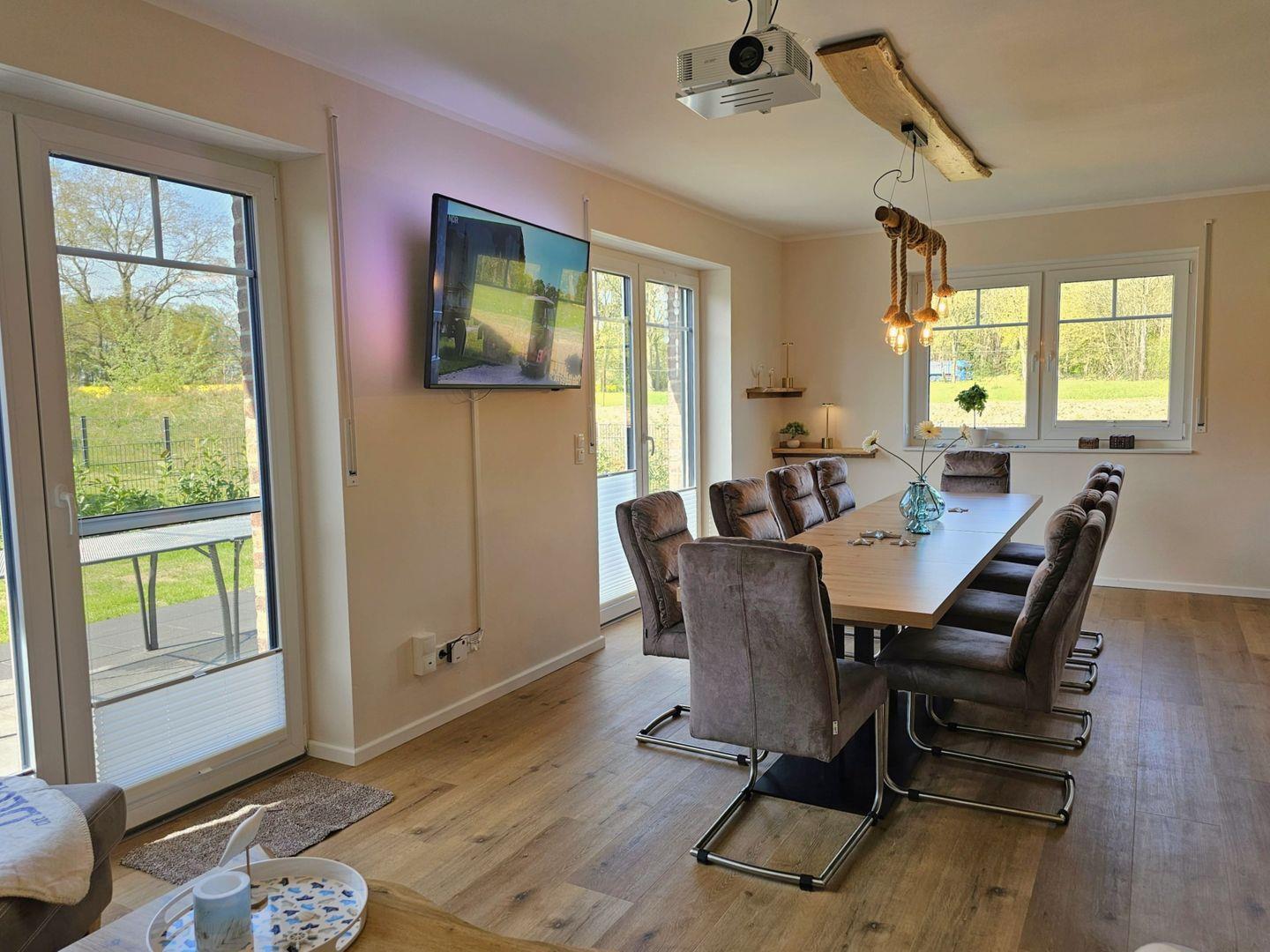 Die beiden modernen und offenen Küchen des Ferienhauses sind jeweis voll ausgestattet und lassen keine Wünsche offen. Sie verfügen jeweils über einen Herd, eine Mikrowelle, einen Kühlschrank mit Gefrierfach, eine Spülmaschine, eine Doppelheißluftfriteuse, sowie zahlreiche Küchenutensilien. Der Essbereich in unmittelbarer Nähe lädt Sie ein, gemeinsam zu kochen, beisammen zu sein und zu klönen. Genießen Sie Ihre Freizeit mit den vorhandenen Spielen und Büchern oder schauen Sie einen Film auf einem der 6 Smart-TV, die über Satellitenanschluss verfügen.