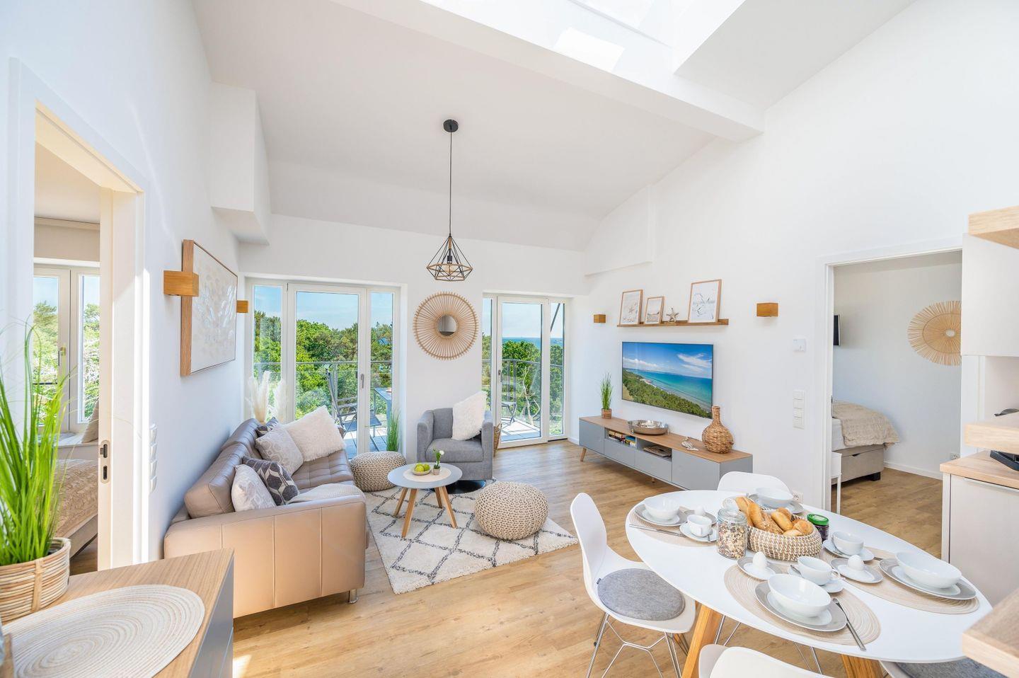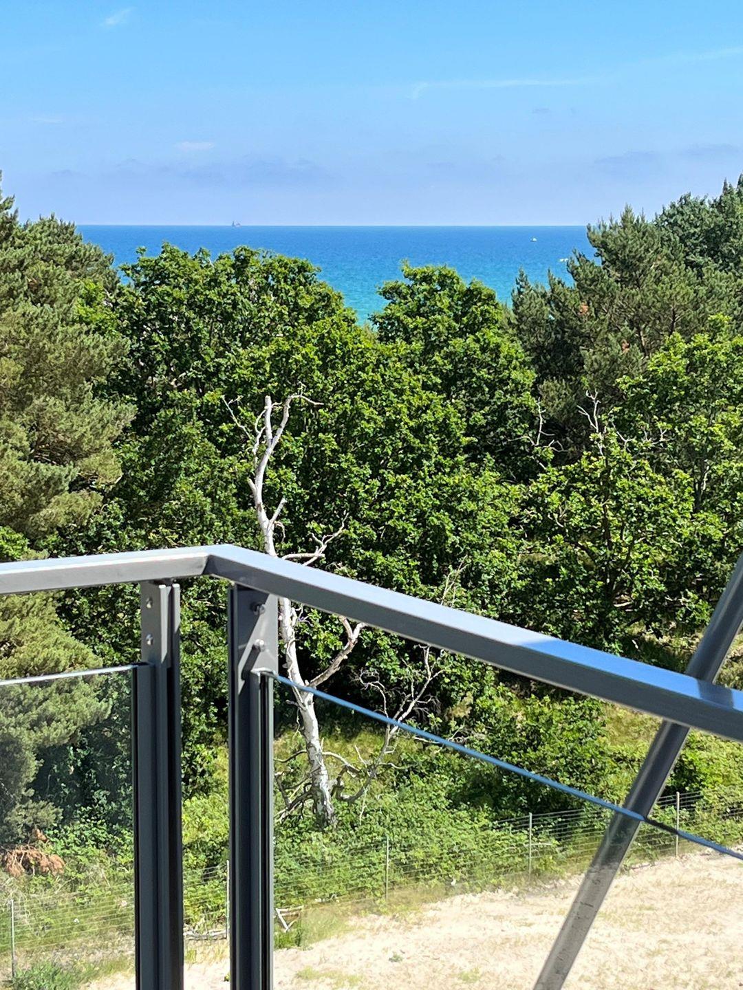 Moderne Ferienwohnung "Wellenblick" in Prora mit Meerblick, Sauna, Balkon und eigenem Strandkorb nur 100 m vom Strand entfernt.