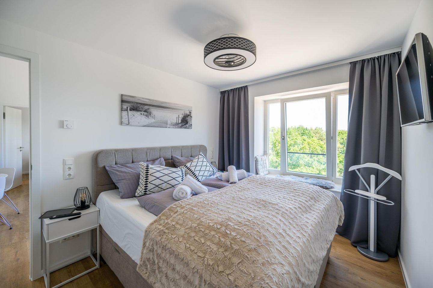 - Schlafzimmer 1: Doppelbett (180x200), Kleiderschrank, Smart-TV, Lampe mit eingebautem Ventilator