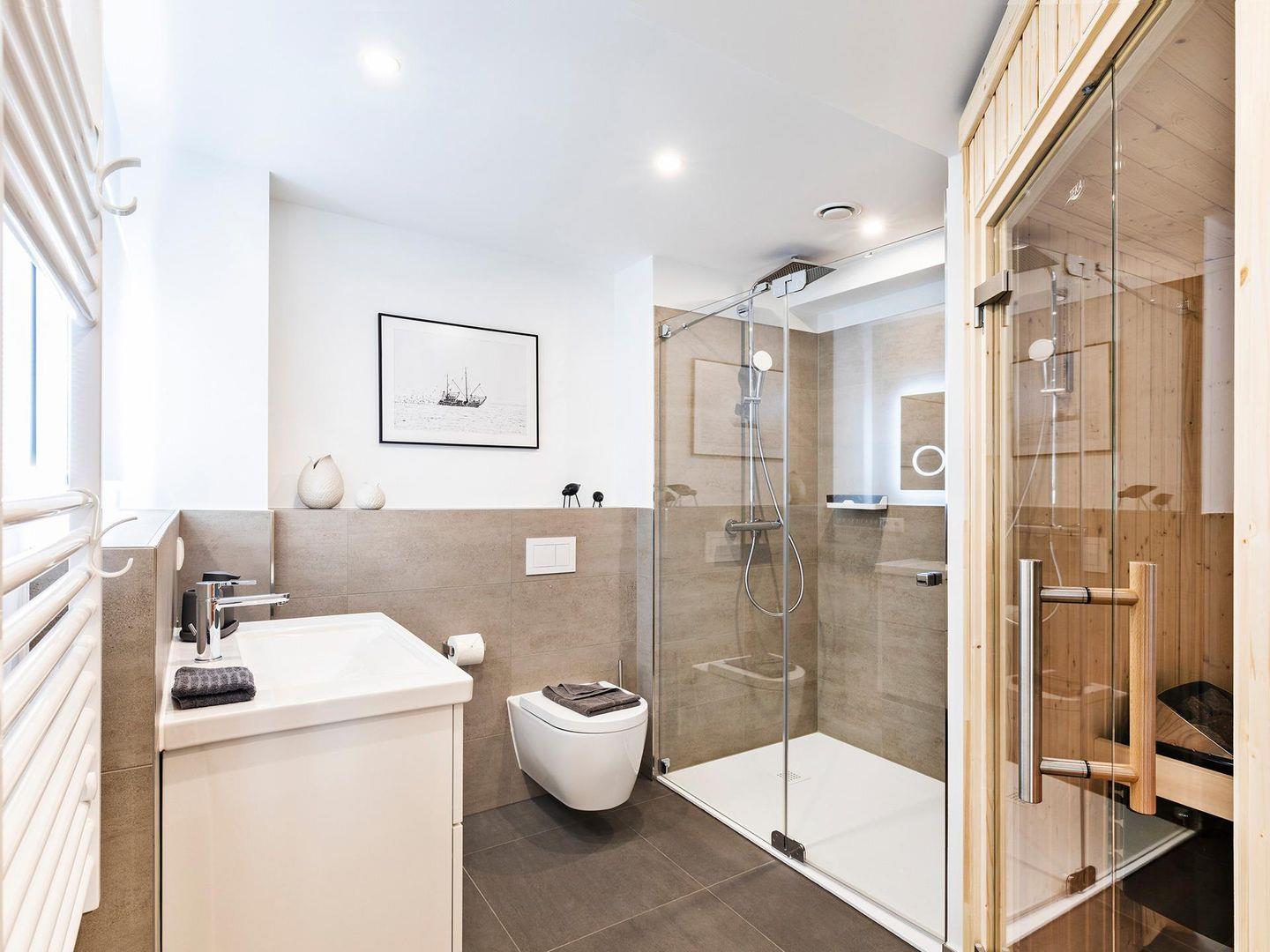 - Badezimmer 1: Regendusche, WC, Haartrockner, Sauna
