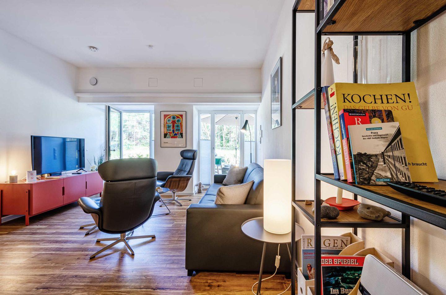 Die "Dünenterrasse" im Erdgeschoss des Hauses Stubnitz erinnert an einen Loft. Ein offenes, kreatives Wohn-Ess-Konzept und freigelegtes Mauerwerk sind eher untypisch für die mondäne Bäderarchitektur, passt aber bestens zu dieser Ferienwohnung. Von hier aus fällt der Blick auf eine große Terrasse mit XL-Strandkorb, dahinter eine Dünenlandschaft und der Kiefernwald. Wenige Schritte hinter der eigenen Terrasse beginnt der Spaziergang am Meer (direkter Strandzugang).