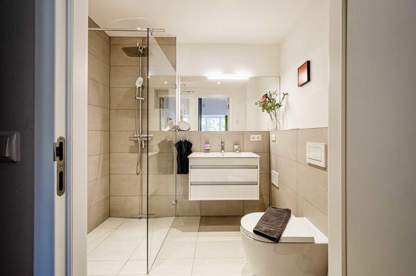 Zwei separate und modern ausgestattete Badezimmer, eines davon en Suite, mit bodengleichen Regenduschen sorgen für einen entspannten Start in den Tag.