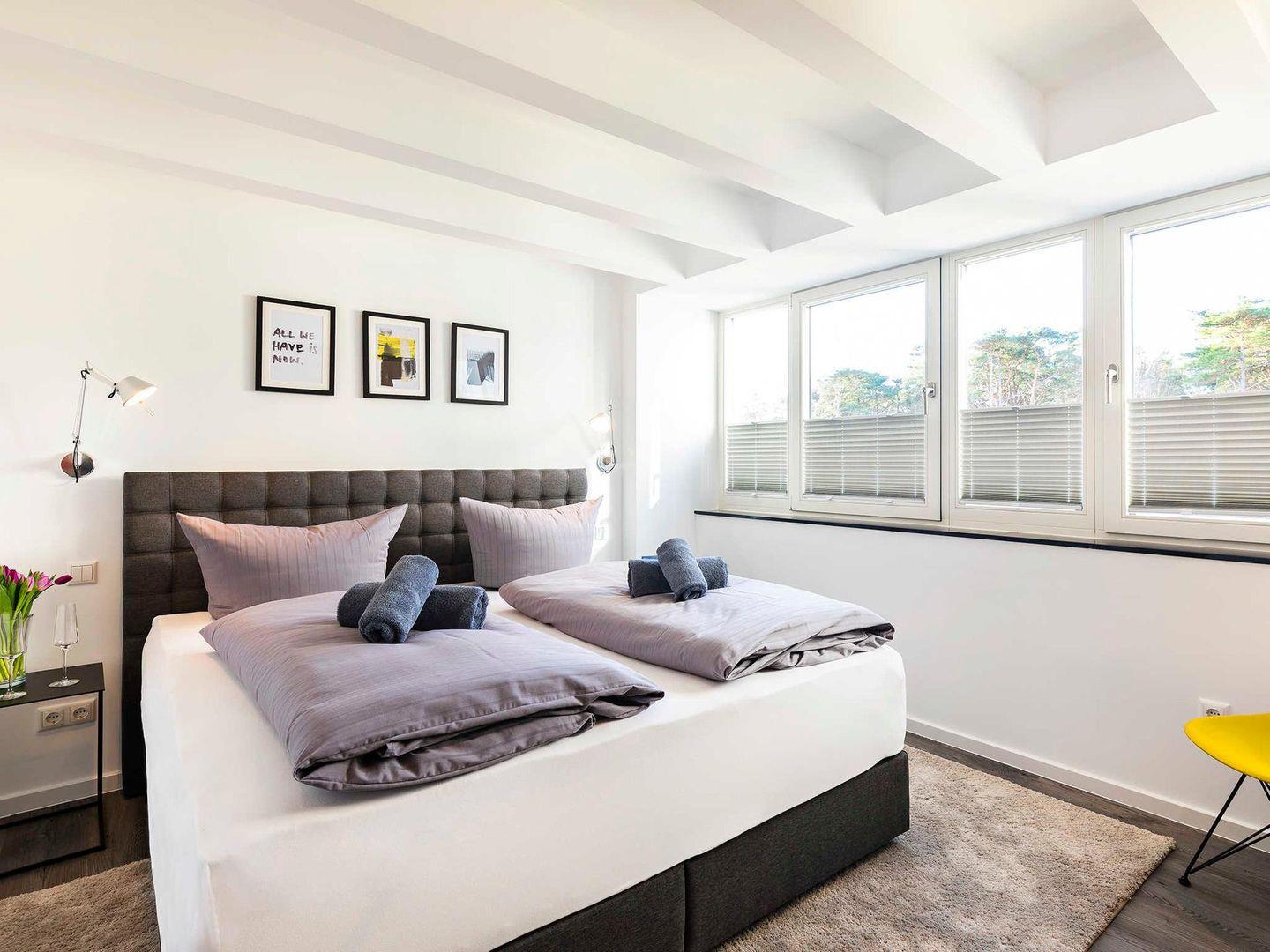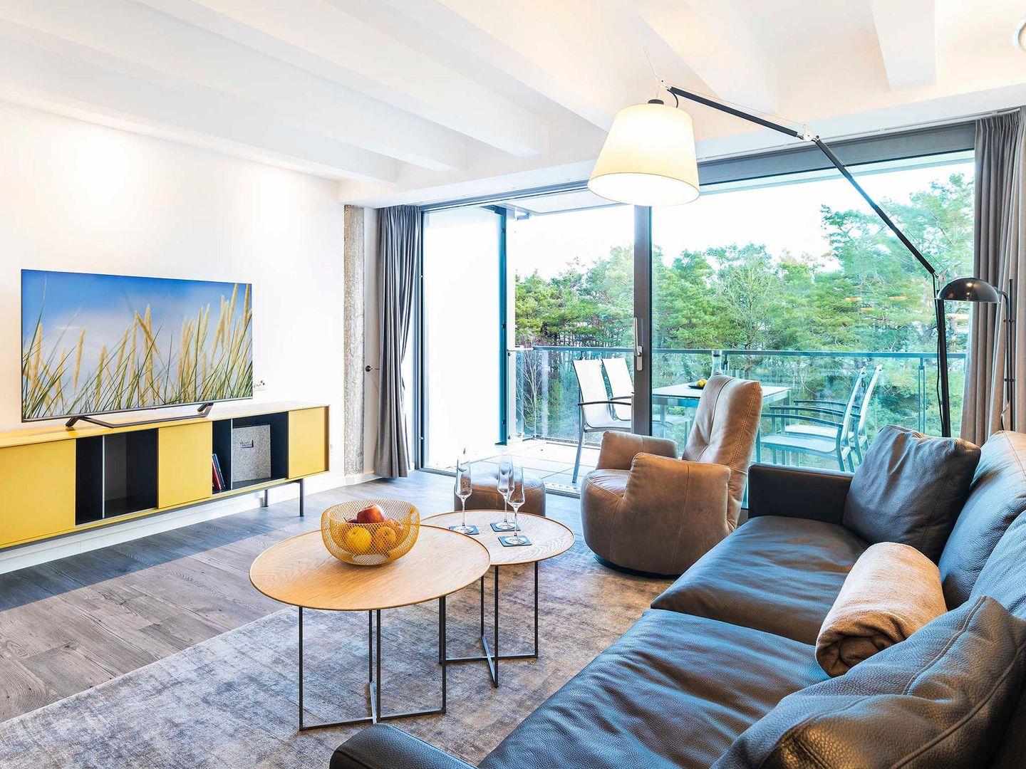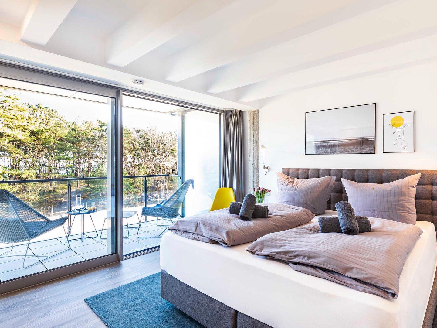 - Schlafzimmer 2: Doppelbett (180 x 200), Kleiderschrank, Kommode, Smart-TV, Panoramafenster mit Ausgang zum Balkon, Blick auf die Ostsee
