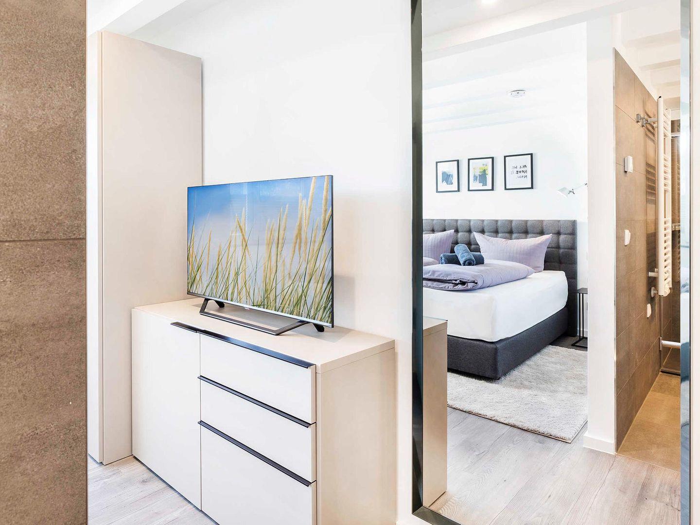 - Schlafzimmer 1: Doppelbett (180 x 200), Kleiderschrank, Kommode, Smart-TV, Blick Binnenseite, Plissees
