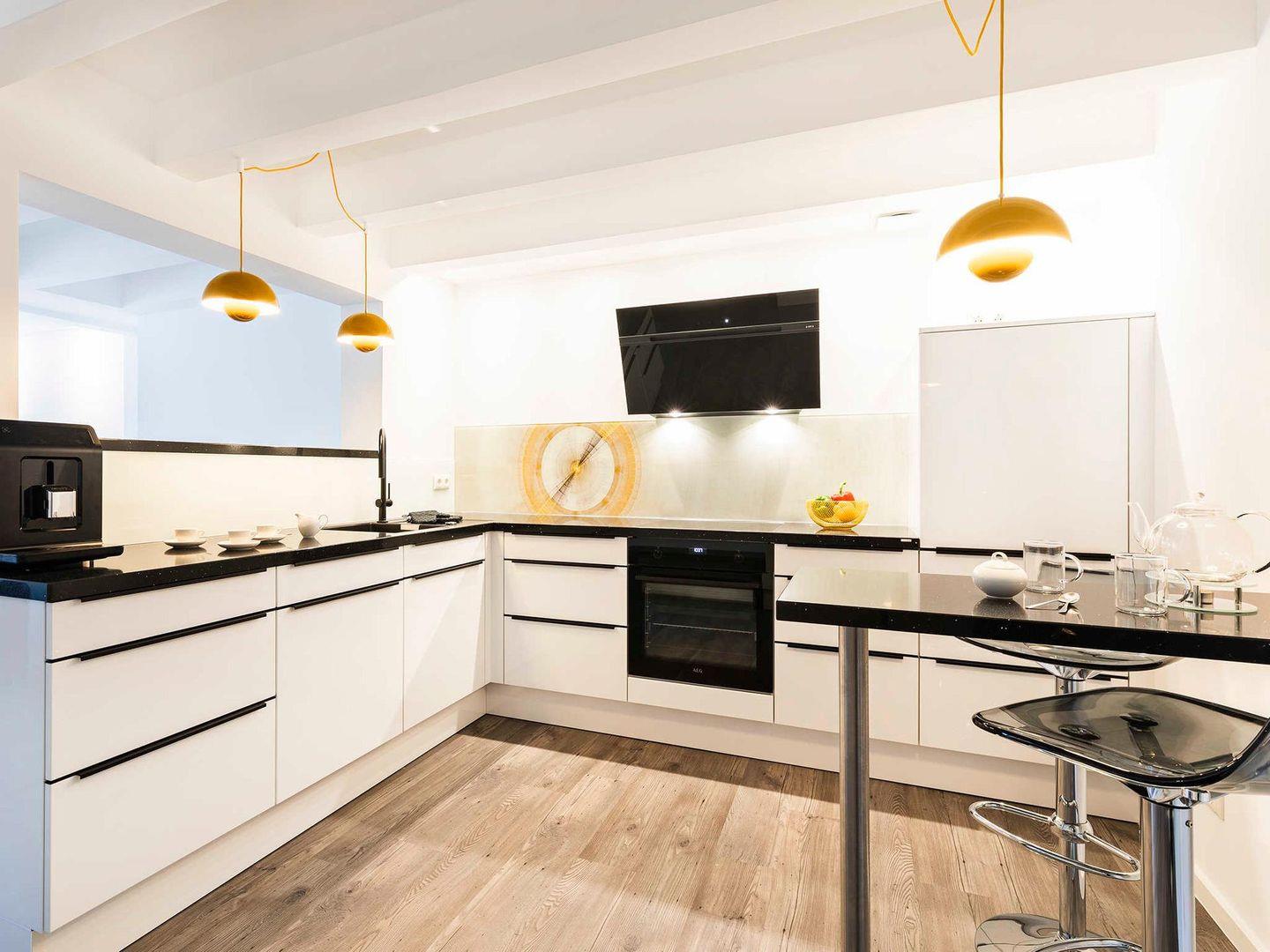Schon wenn Sie in die 96 m² große Wohnung eintreten, fühlen Sie sich wie im Urlaub. Sie werden gleich von einer modernen, sehr hochwertigen Küche, mit kleinem Tresen und 2 Barstühlen, in Empfang genommen.