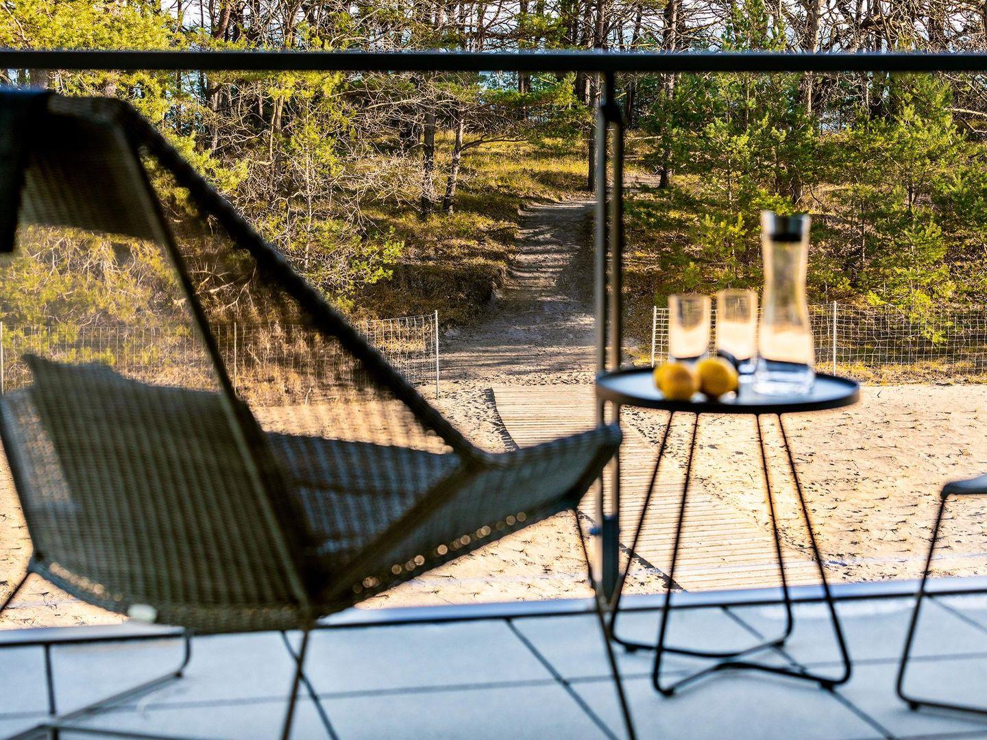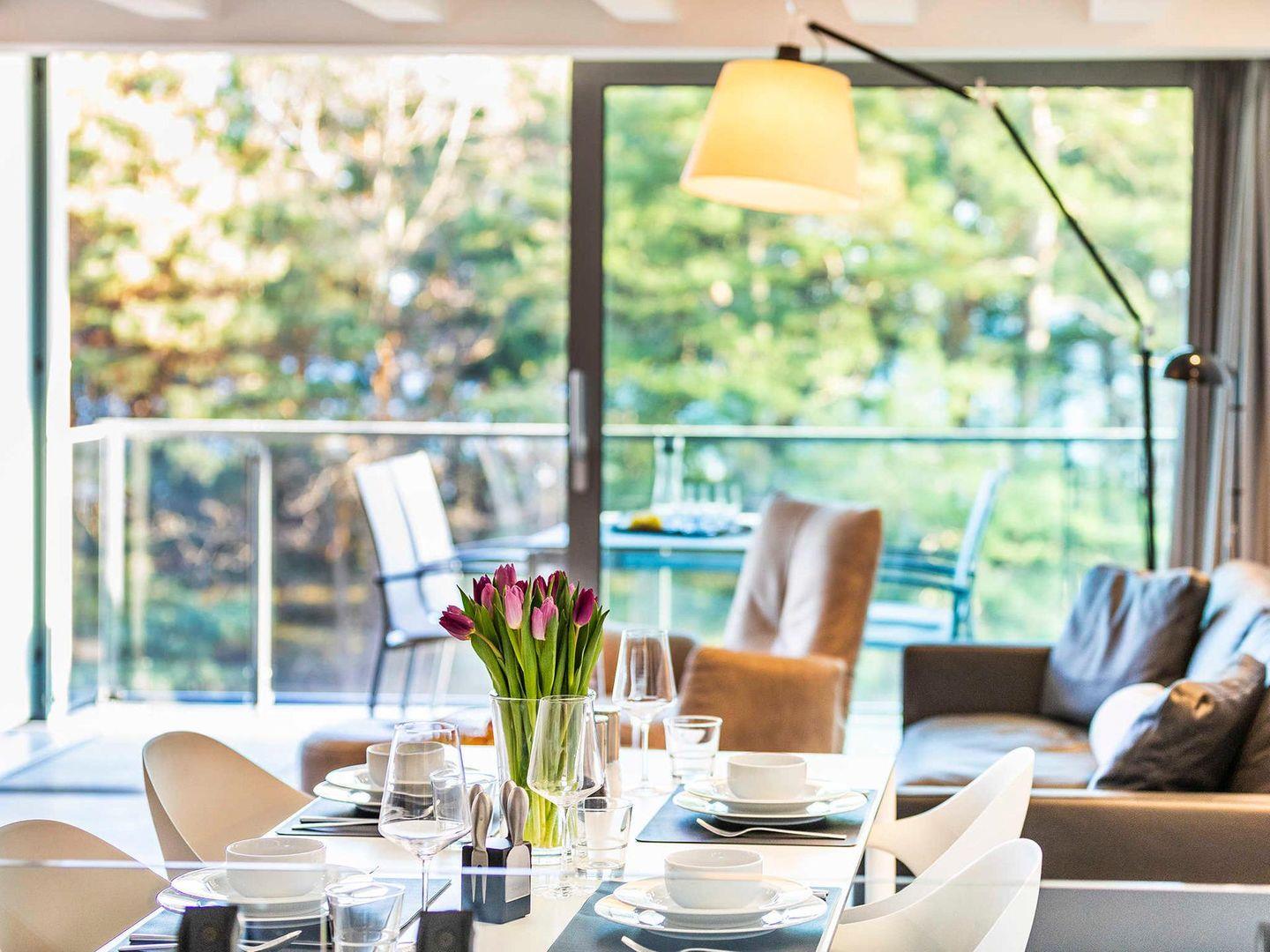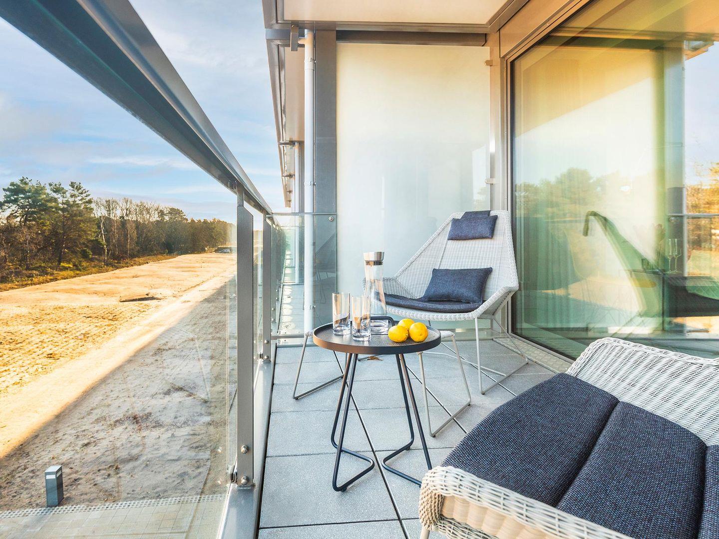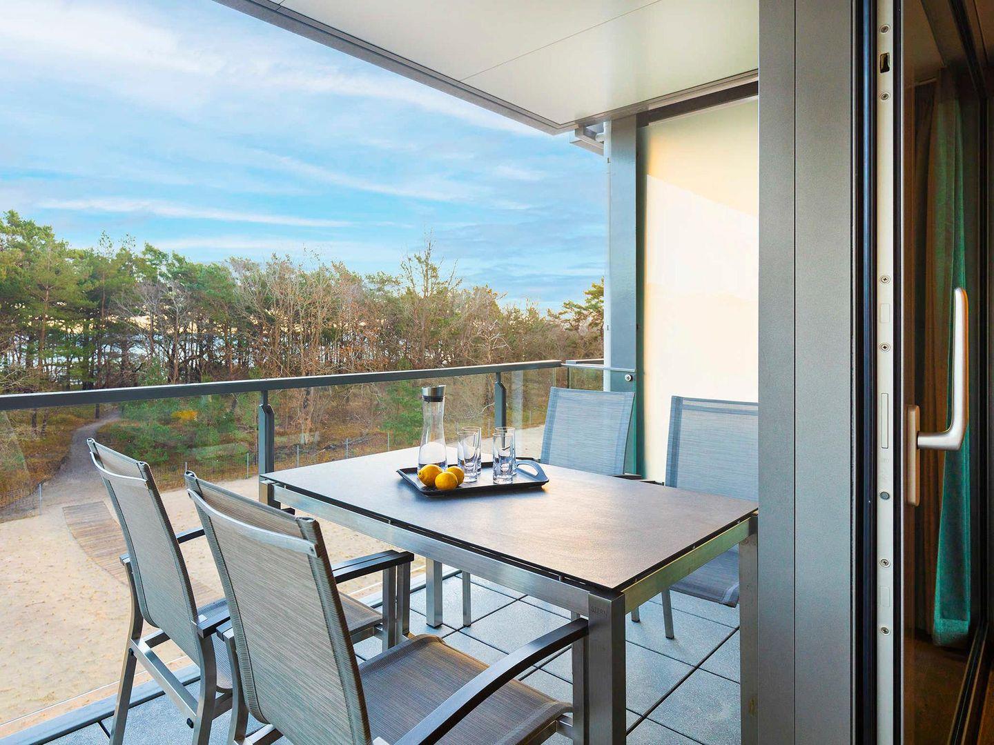 Wenn Sie Ihren Blick weiter geradeaus, Richtung Wohnbereich, schweifen lassen, haben Sie einen super Panoramablick auf die Ostsee. Der großzügige Balkon mit Sitzmöglichkeit für bis zu 4 Leuten, lädt zum Verweilen ein. Durch den seitlichen Sichtschutz sind Sie bestens geschützt vor ungewollten Blicken.