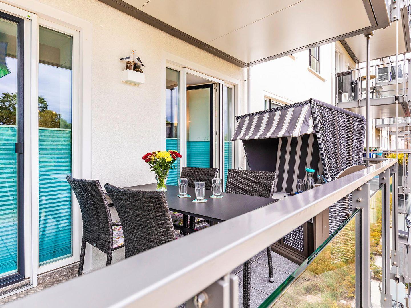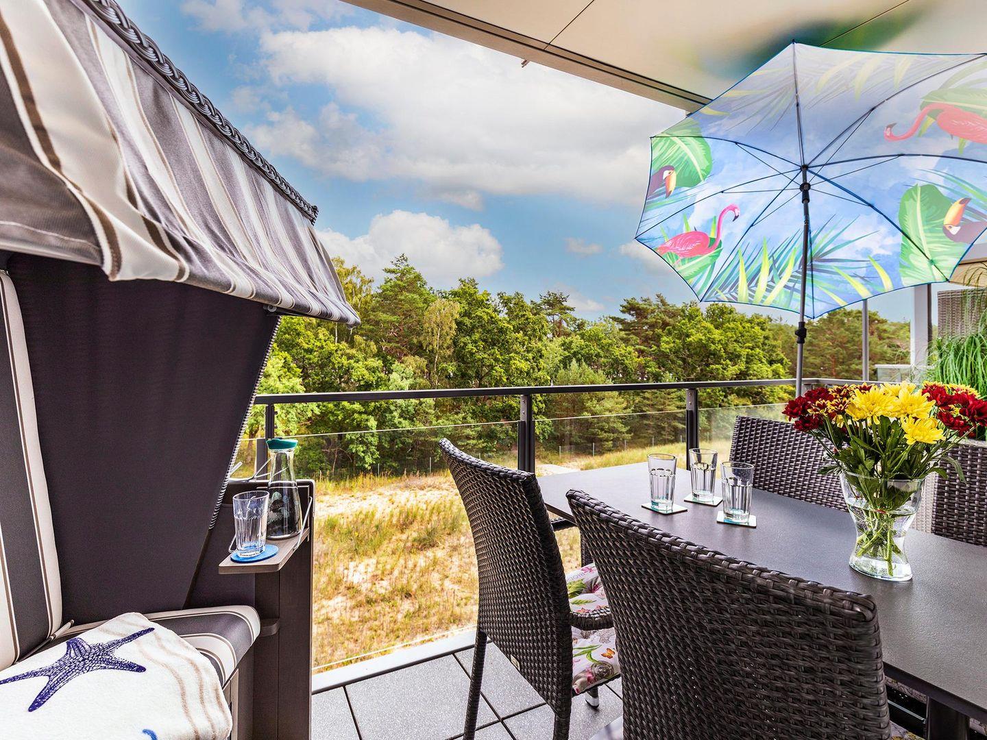 Moderne Ferienwohnung Strandmuschel in Prora mit Meerblick, Strandkorb und Balkon, nur 50 m vom Strand entfernt.