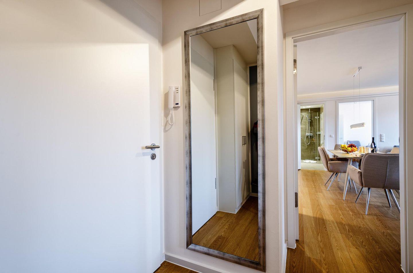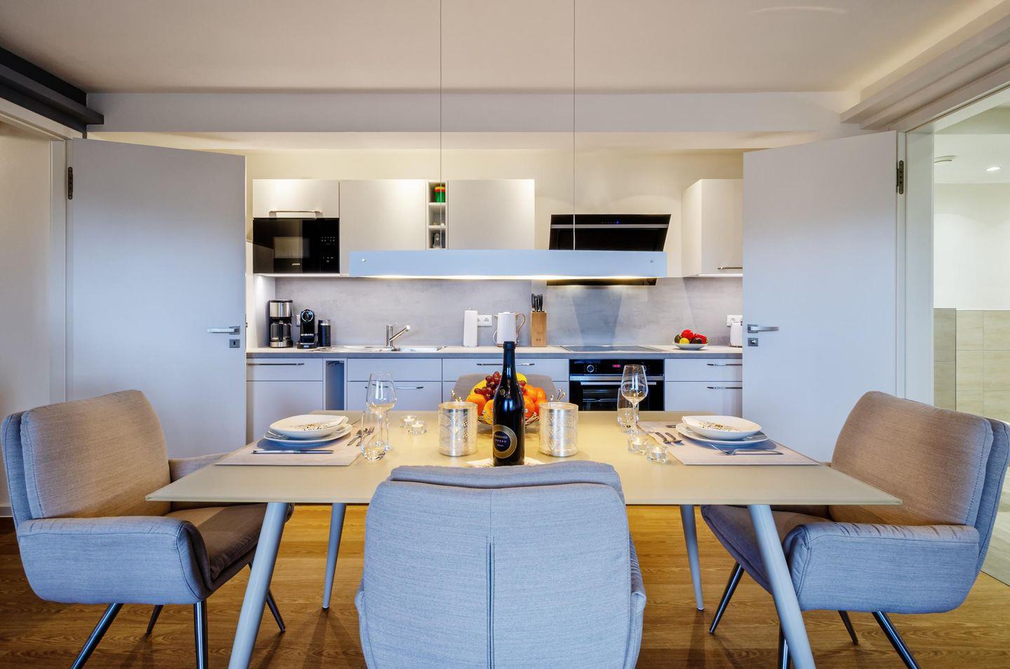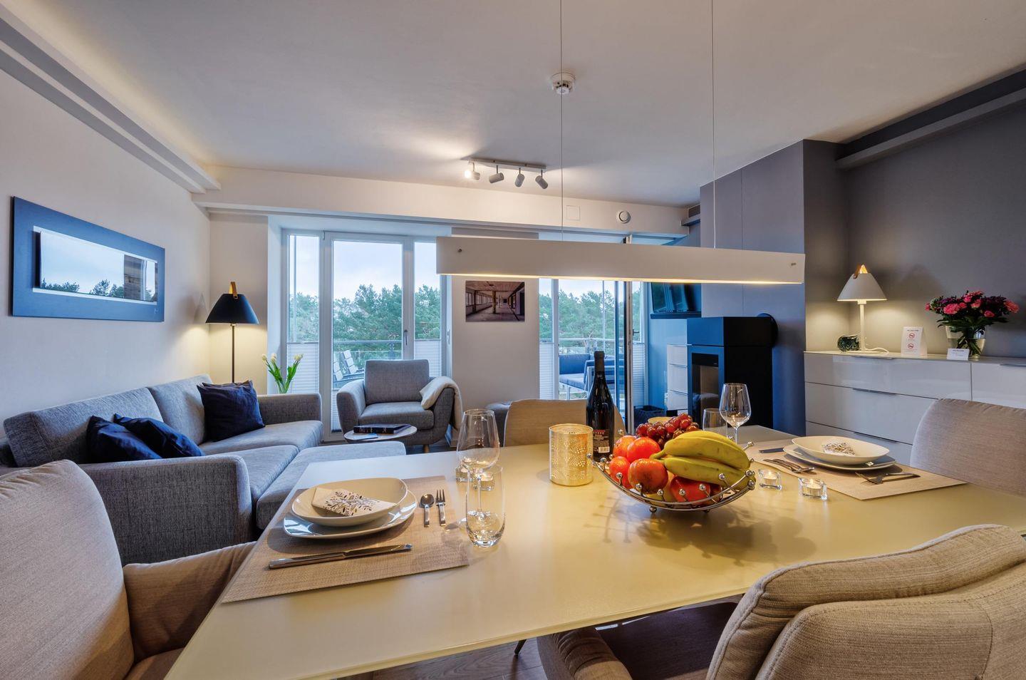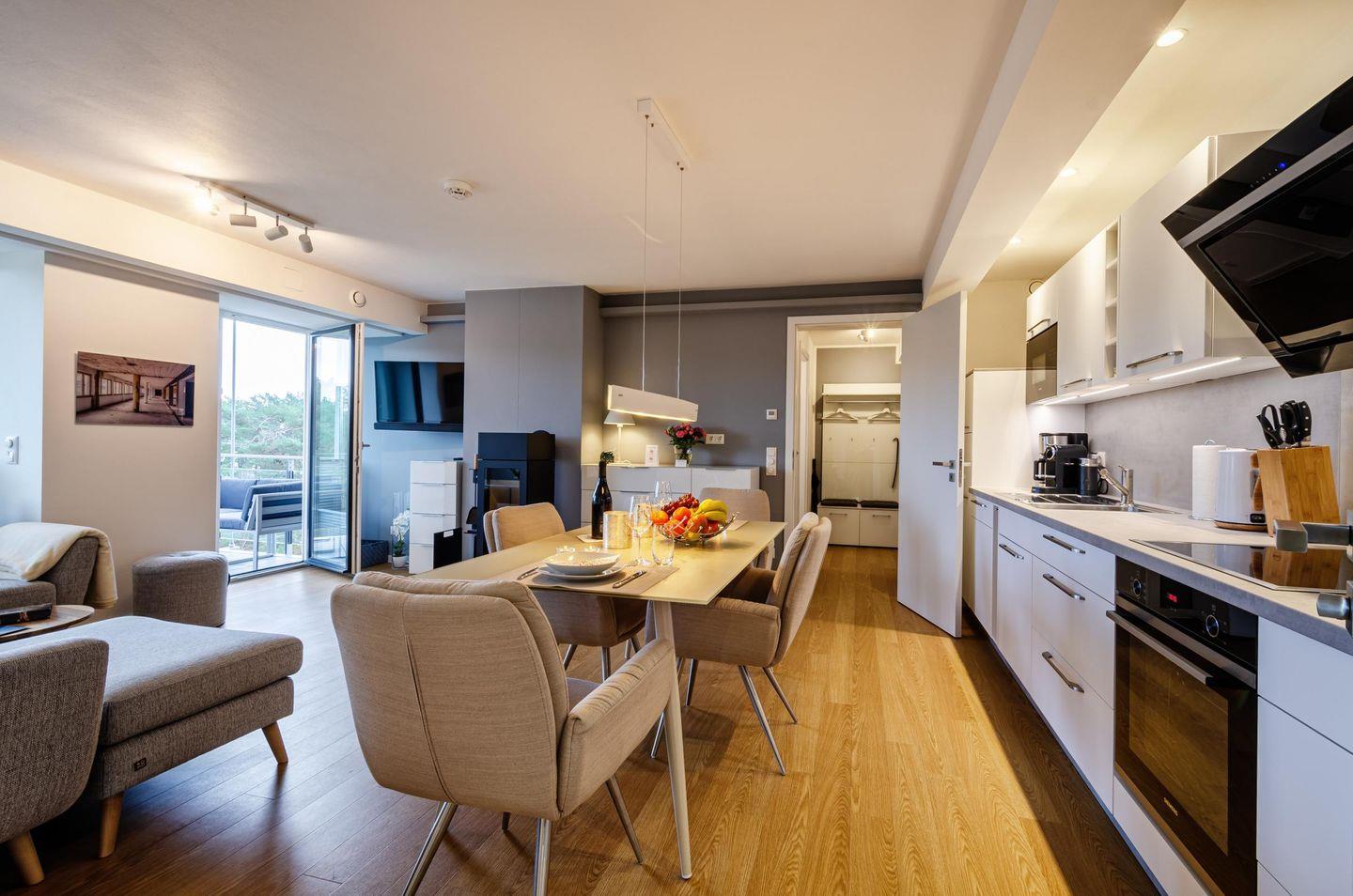 Das Apartment KaSaMimb heißt Sie willkommen mit einem offenen Wohn-, Koch- und Essbereich in zeitloser Farbgestaltung, akzentuiert durch ein vielfältiges Lichtkonzept mit dimmbaren Lichtvouten und unterschiedlichen Beleuchtungsquellen. Tagsüber genießen Sie - auch aus beiden Schlafzimmern - über das Dünenwäldchen hinweg und hindurch den Ostseeblick und streifen dabei den Ostseestrand, den Sie in 3 Minuten Fußweg durch den nur Hausgästen vorbehaltenen Zugang erreichen.