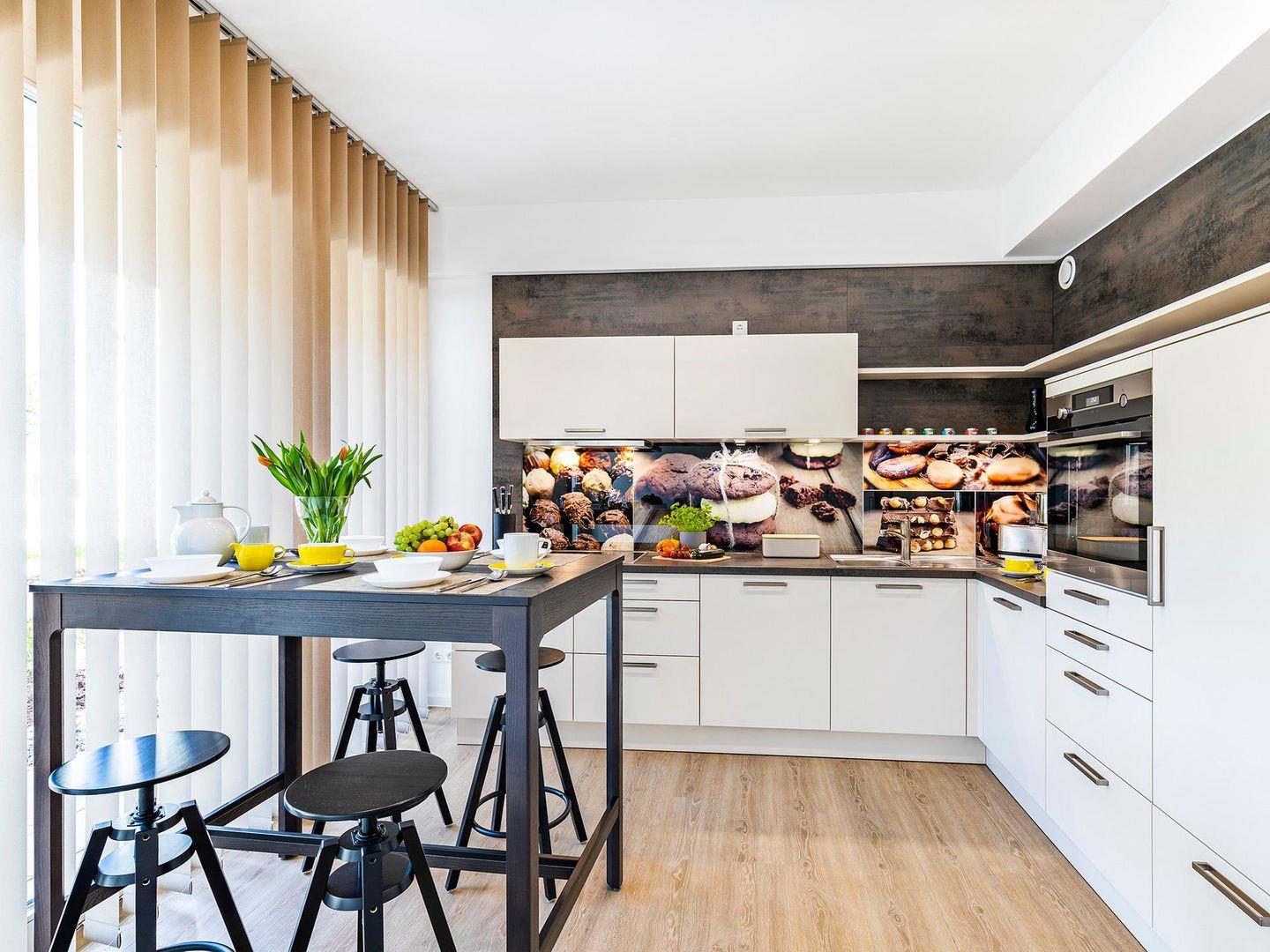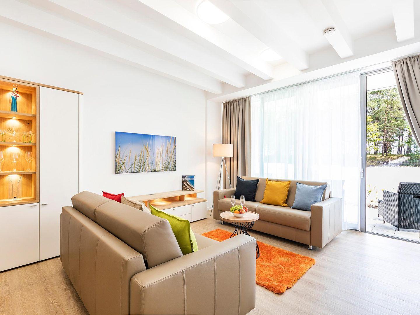 - Wohn-/Essbereich: Sofa, Sitzbereich, Essbereich, Smart-TV mit Internet, Zugang zur Terrasse, Verdunklungsgardinen