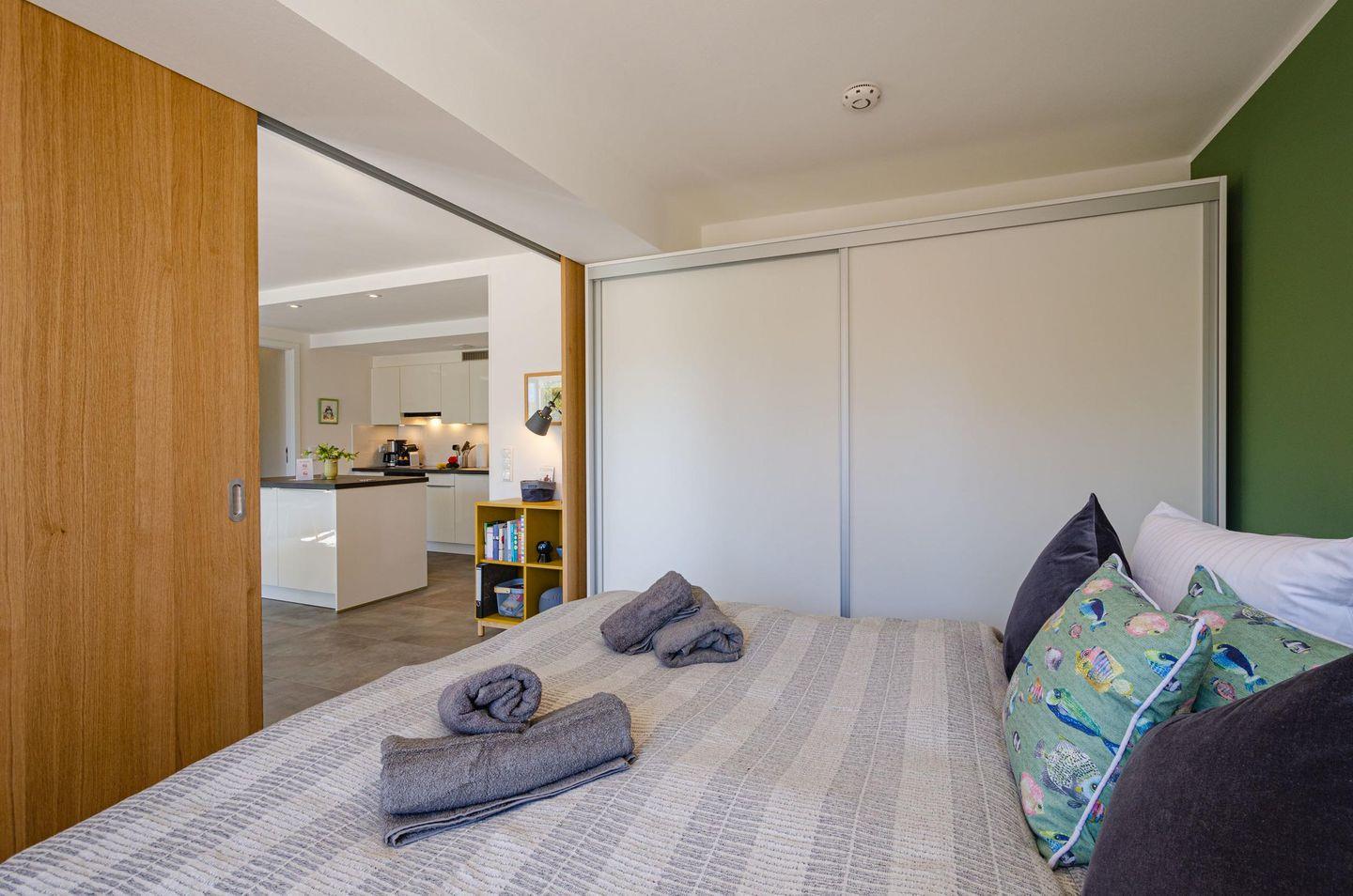 Durch Schiebewände zwischen Wohn- und Schlafbereich bietet die Wohnung gleichzeitig Großzügigkeit und Privatsphäre für bis zu drei Personen.