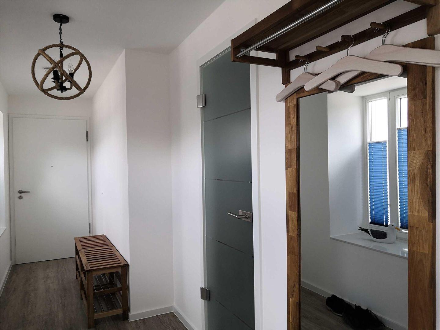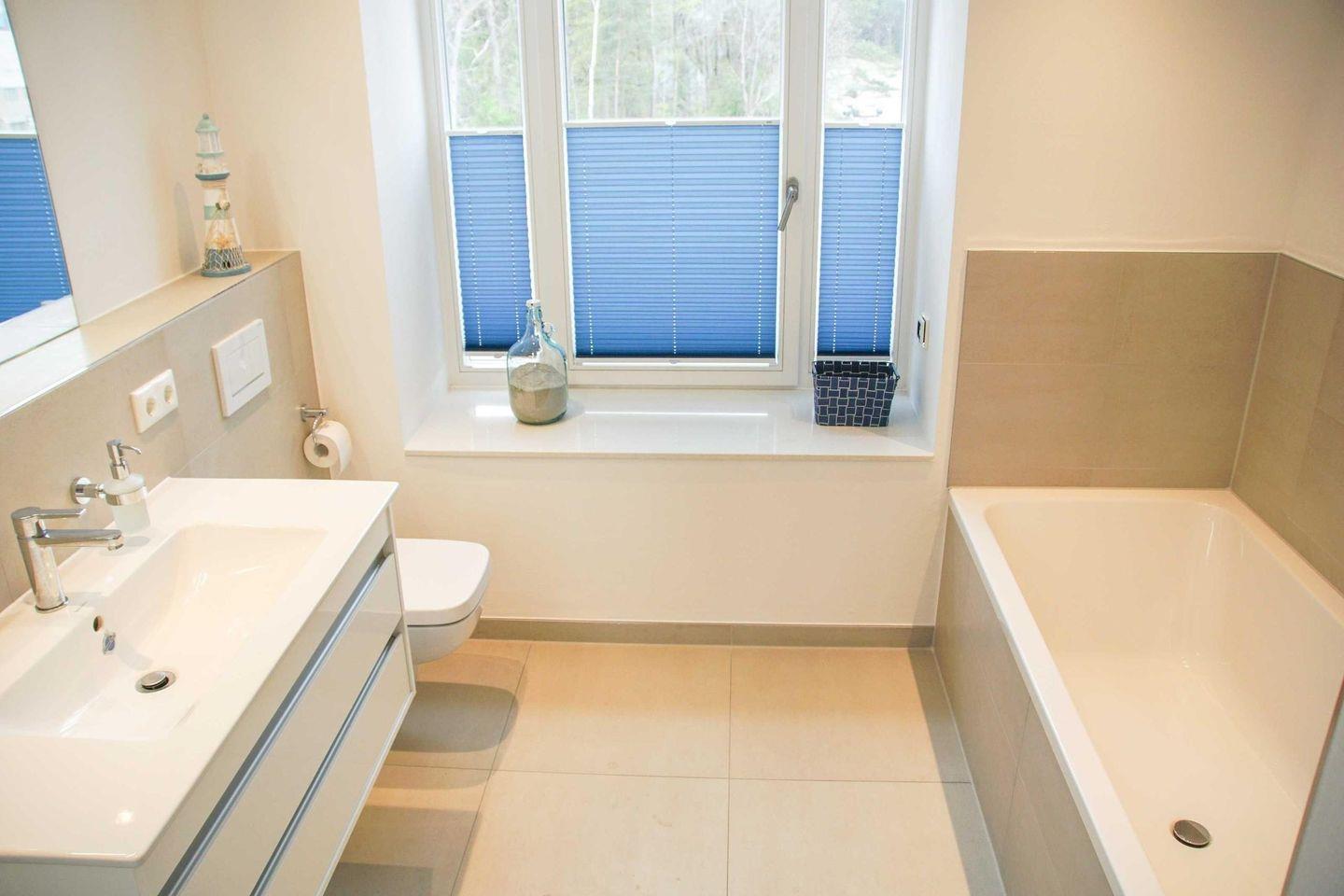 Moderne Ferienwohnung mit Balkon, zwei Bädern und Strandkorb, nur 50 m vom Ostseestrand Prora entfernt.