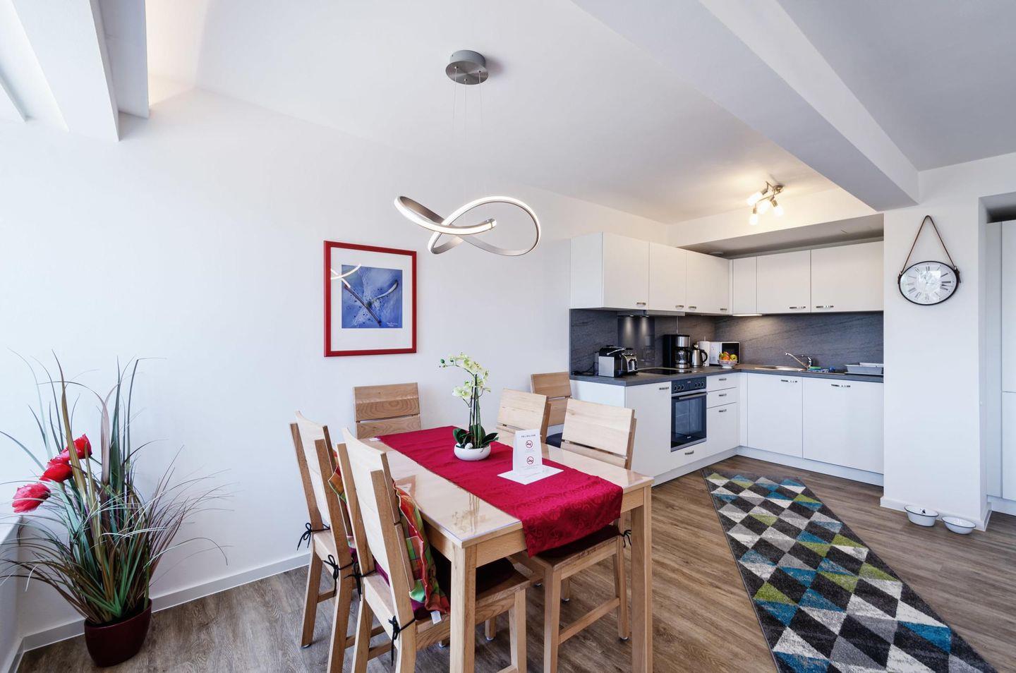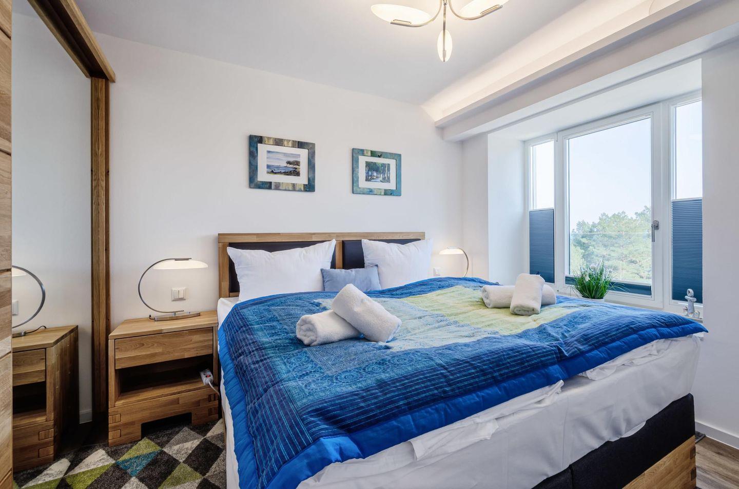 Im Haus Stubnitz angekommen gelangen Sie mit dem Aufzug ins 4. Obergeschoss, wo sich das 2-Zimmerapartment "SeeMelodie" befindet. Das geschmackvoll mit farbigen Akzenten modern eingerichtete Apartment verfügt über einen geräumigen Wohn-Essbereich mit offener Küche. Eine Schlafcouch bietet optional auch einer 3. Person Platz ohne Enge zu verbreiten. Auch Hunde finden in diesem Bereich ein gemütliches Hundeschlafbett. Im Küchenbereich finden Sie alles, was zur kulinarischen Versorgung erforderlich ist. Sie können die Mahlzeiten gemütlich am Esstisch vor dem Fenster einnehmen oder setzen sich auf den Balkon. Genießen Sie dabei den Blick über den Kiefernwald aufs Meer und lauschen Sie der Seemelodie. Das Schlafzimmer mit Boxspringbetten für 2 Personen vermittelt jene entspannende Atmosphäre, wie sie für einen erholsamen Schlaf erforderlich ist. Im bodenbeheizten Badezimmer finden Sie neben der bodengleich begehbaren Duschkabine mit Regendusche alles, was man in einem modern eingerichteten Badezimmer erwartet.