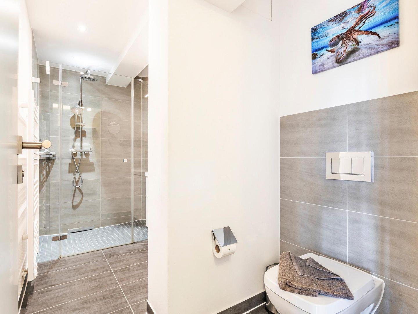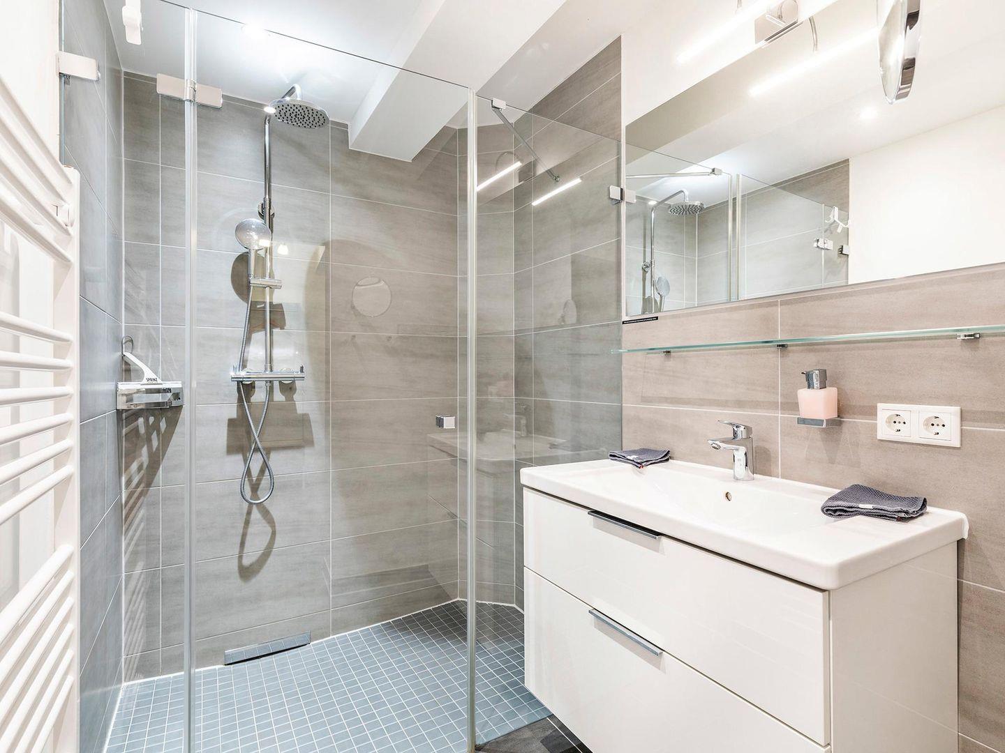 - Badezimmer: Regendusche, WC, Haartrockner