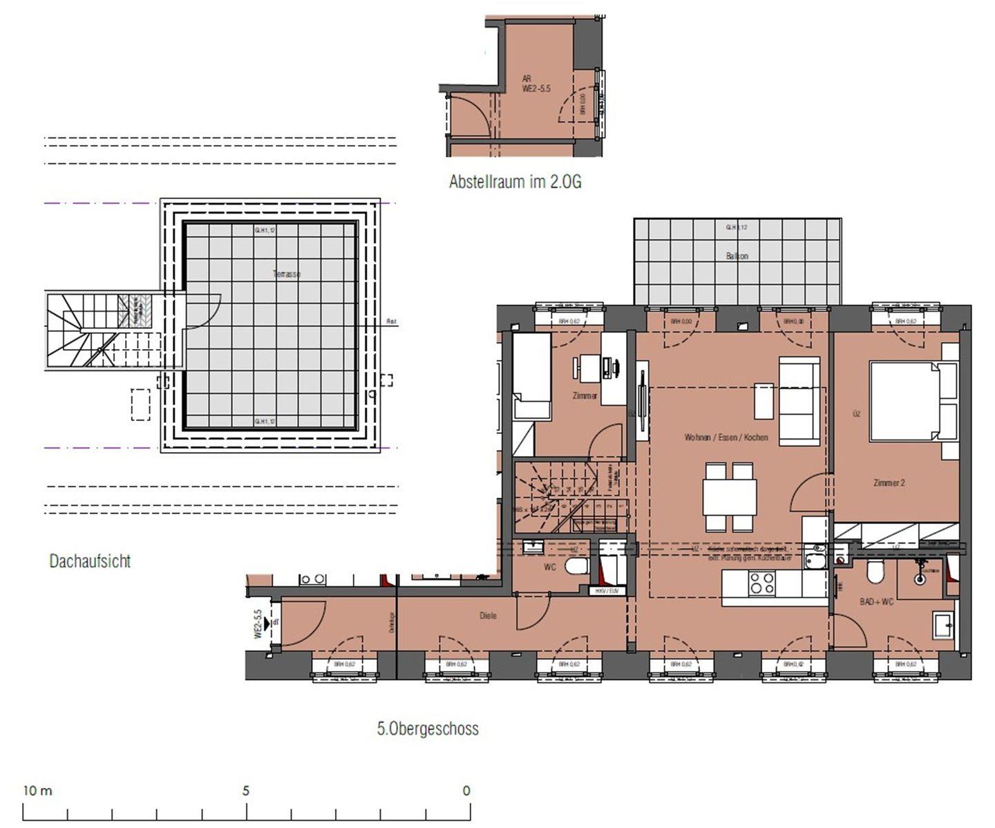 - Wohnzimmer: Sofa, TV, Zugang zum Balkon und Dachterrasse