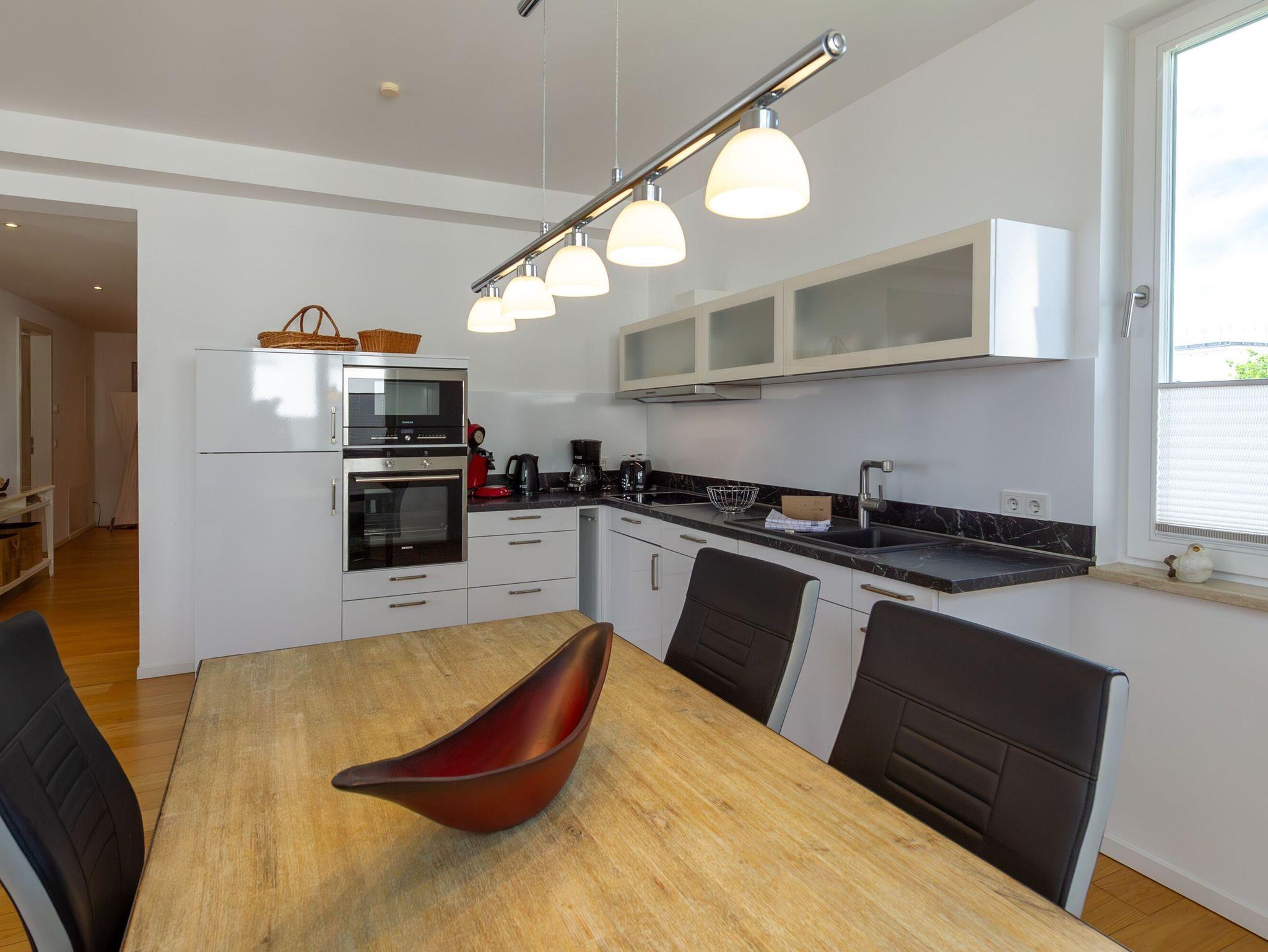 Die harmonisch in den Wohnraum integrierte Küchenzeile verfügt über moderne Einbaugeräte und ist mit Induktionskochfeld, Geschirrspüler, Mikrowelle, Backofen, Kühl-und Tiefkühlschrank sowie Dunstabzug nach außen ausgestattet. Kaffeemaschine, Wasserkocher, Toaster und diverses Kleininventar runden die funktionelle Einrichtung ab. Ein großzügiger Essbereich bietet ausreichend Platz für 4 Personen. Bodentiefe Fenster sorgen für freie Sicht auf die Ostsee und bieten einen bequemen Zugang zum Balkon.