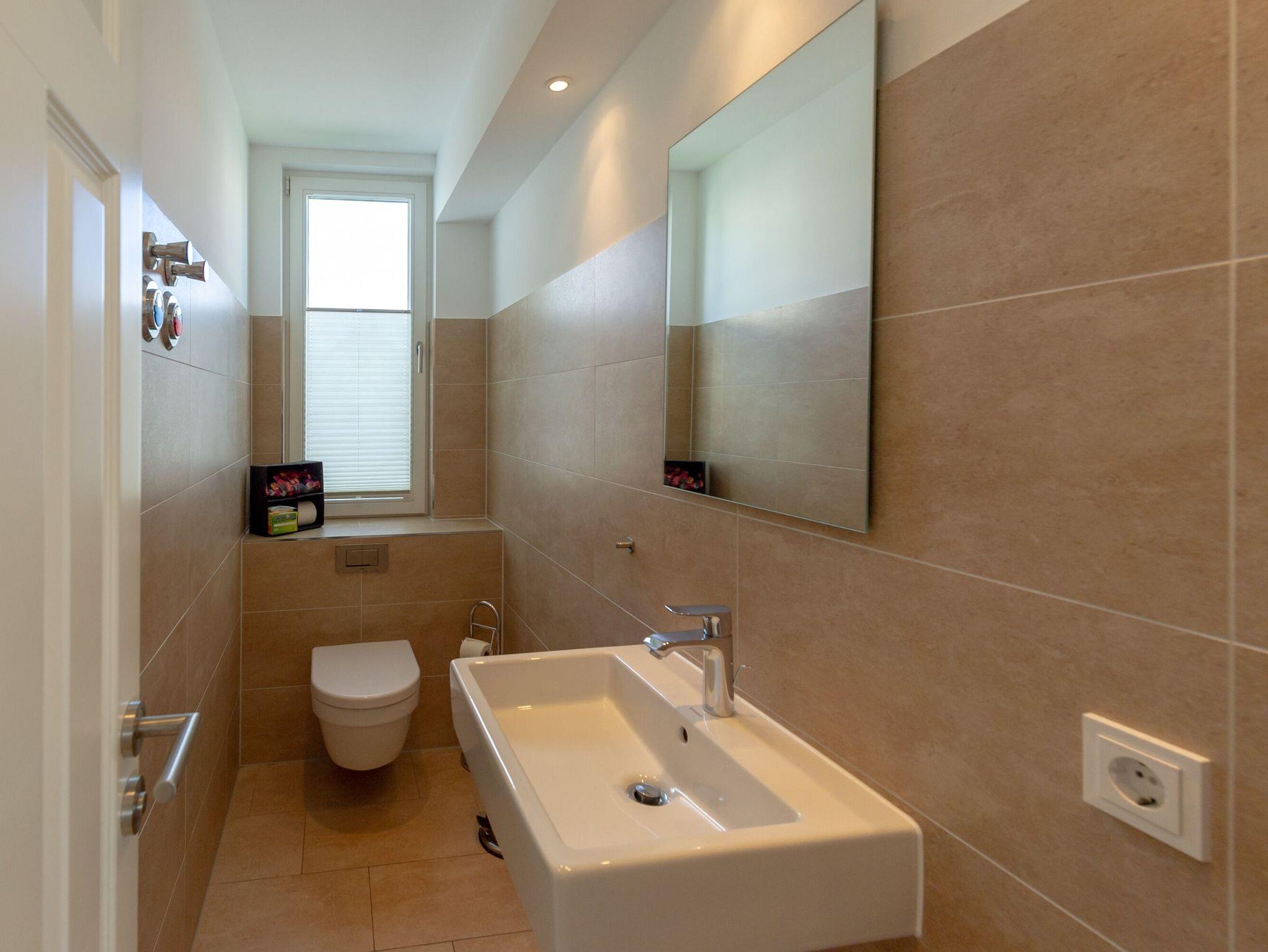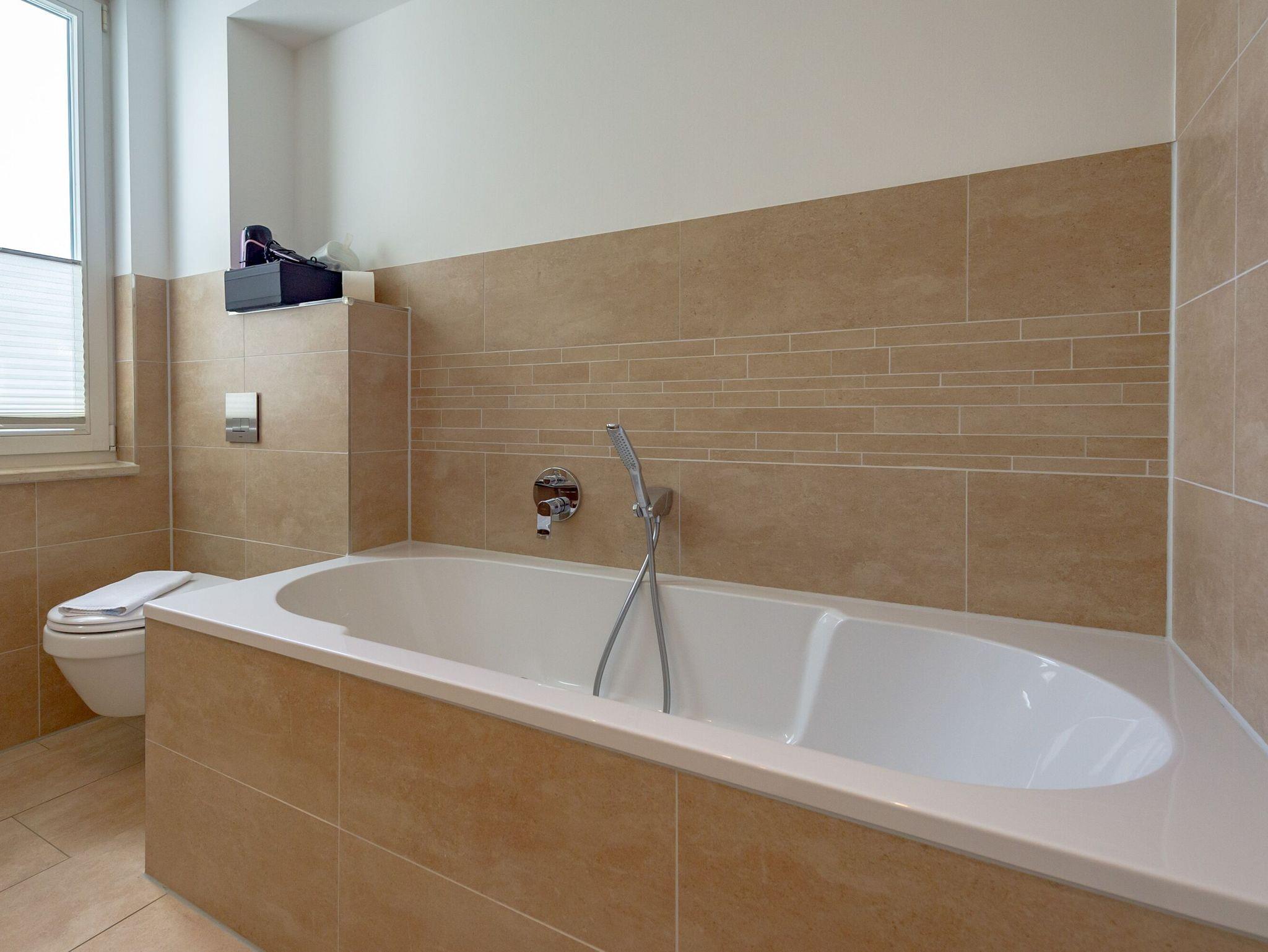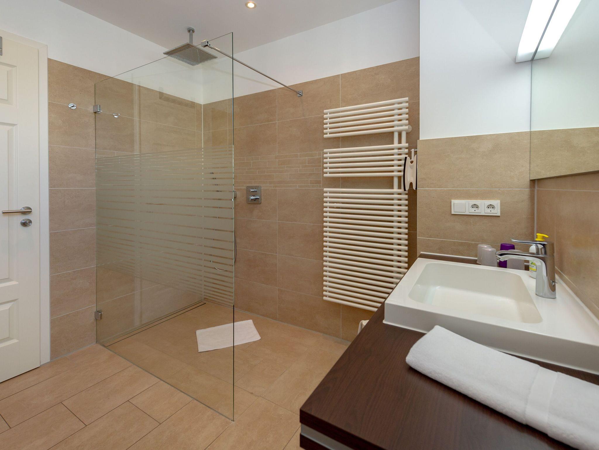 Das Badezimmer verfügt über eine offene 1,40 x 2,00 m große, stufenlos begehbare Dusche, eine Badewanne, WC, einen beleuchteten Waschtisch inkl. Fön und einen beheizbaren Handtuchtrockner. Für den besonderen Komfort gibt es darüber hinaus ein separates Gäste-WC.