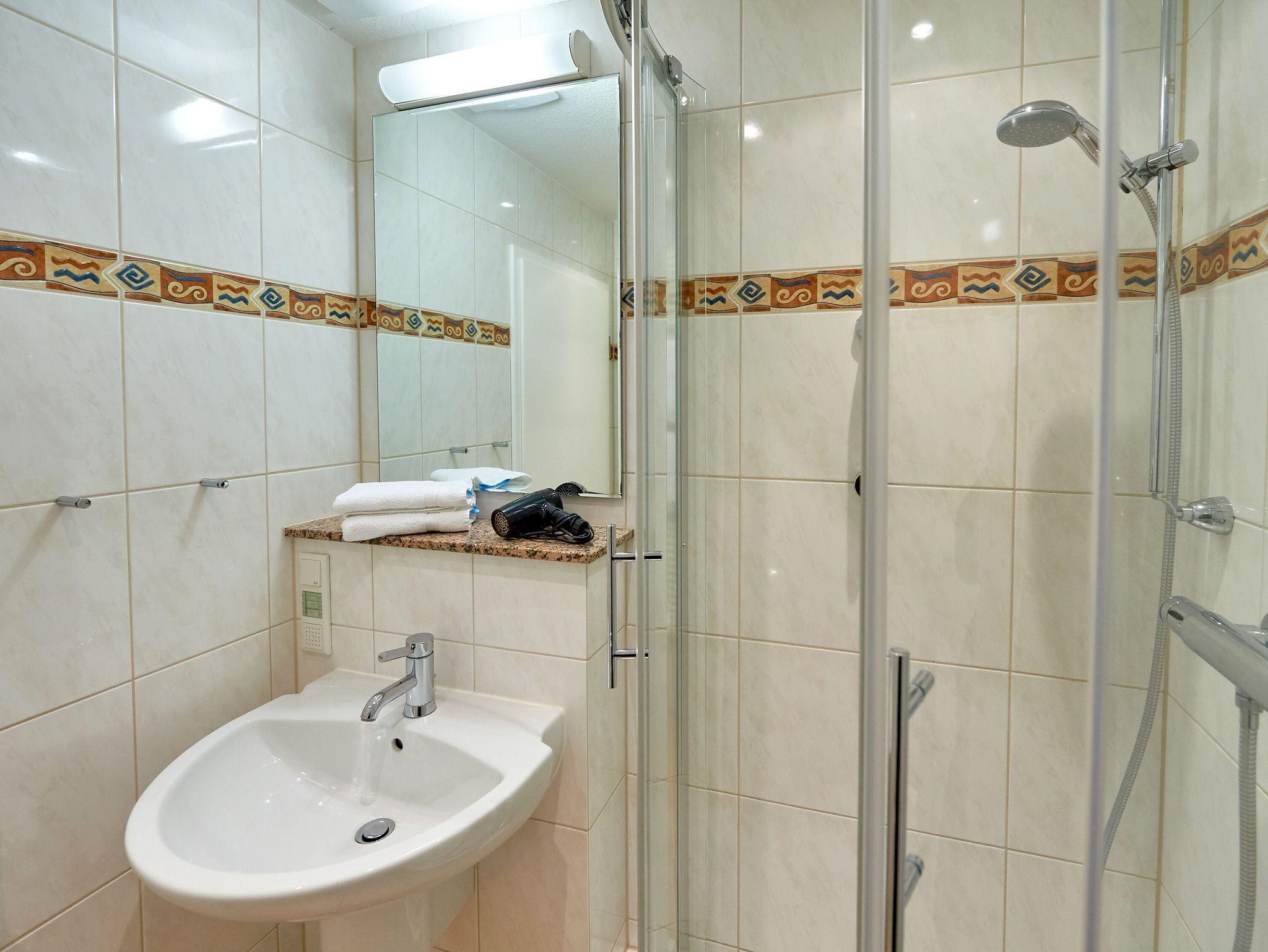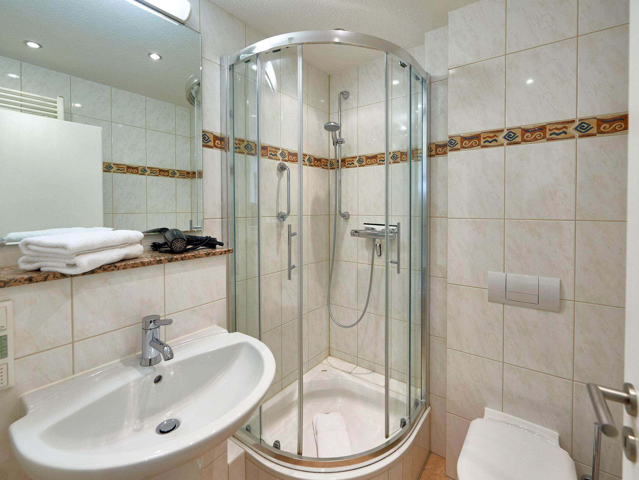 Ebenso gehört ein modernes Duschbad mit WC, Haartrockner, Kosmetikspiegel zur Ausstattung.