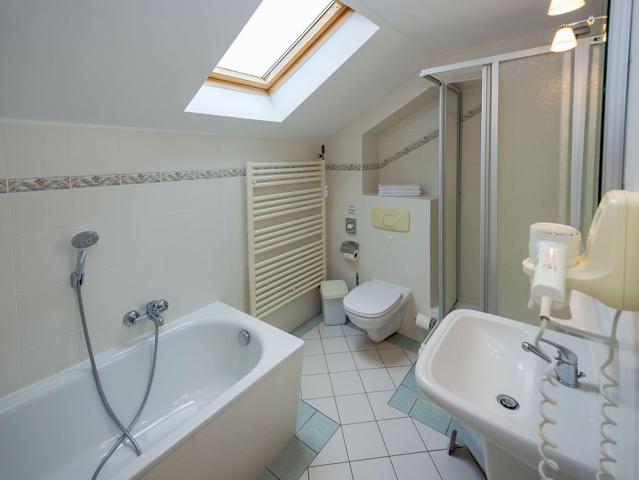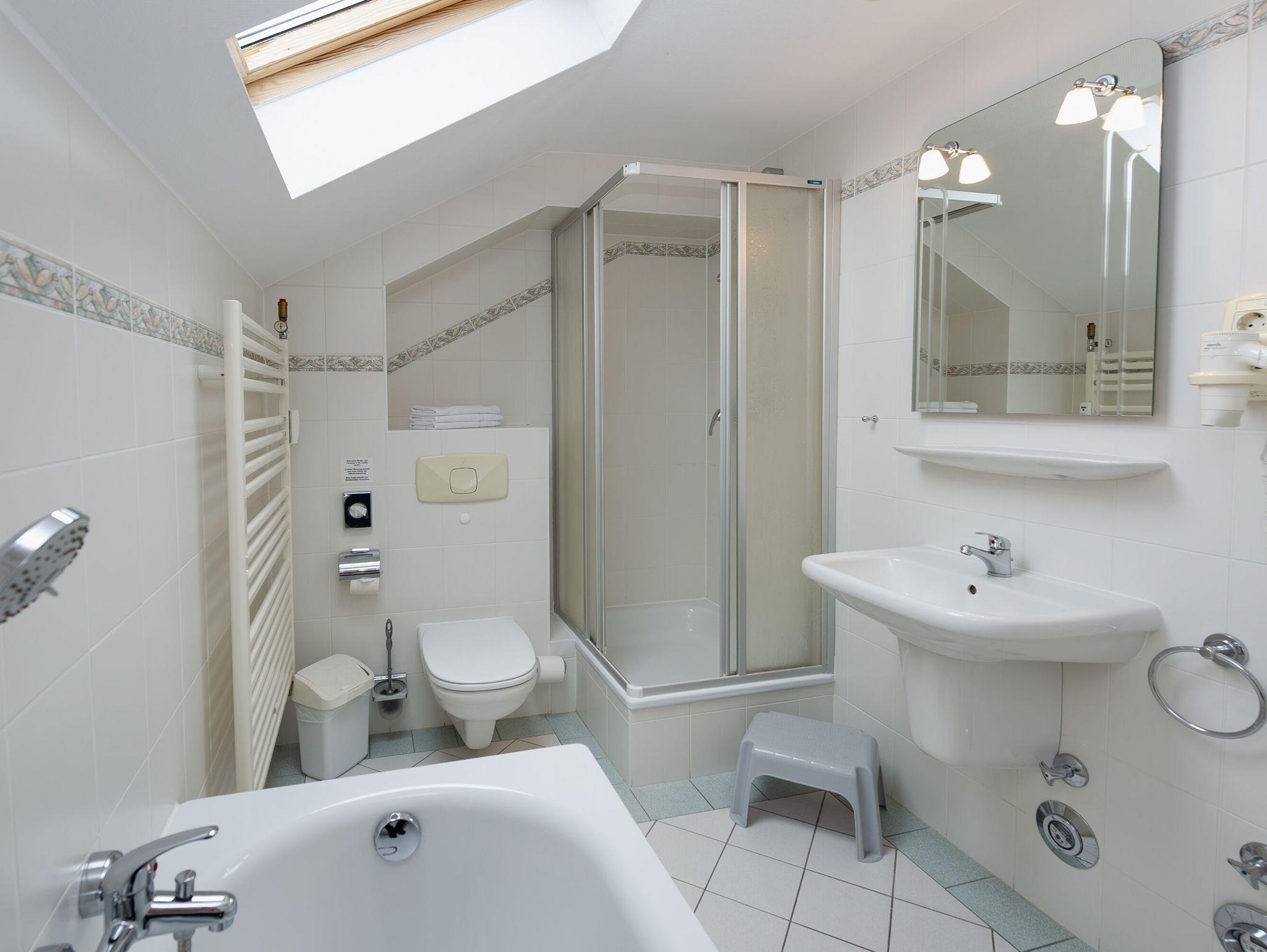 Die Wohnung verfügt über ein modernes Badezimmer, das mit einer Badewanne, einer separaten Dusche, WC, Handtuchwärmer, Waschbecken und Haartrockner den guten Gesamteindruck der Ausstattung abrundet.