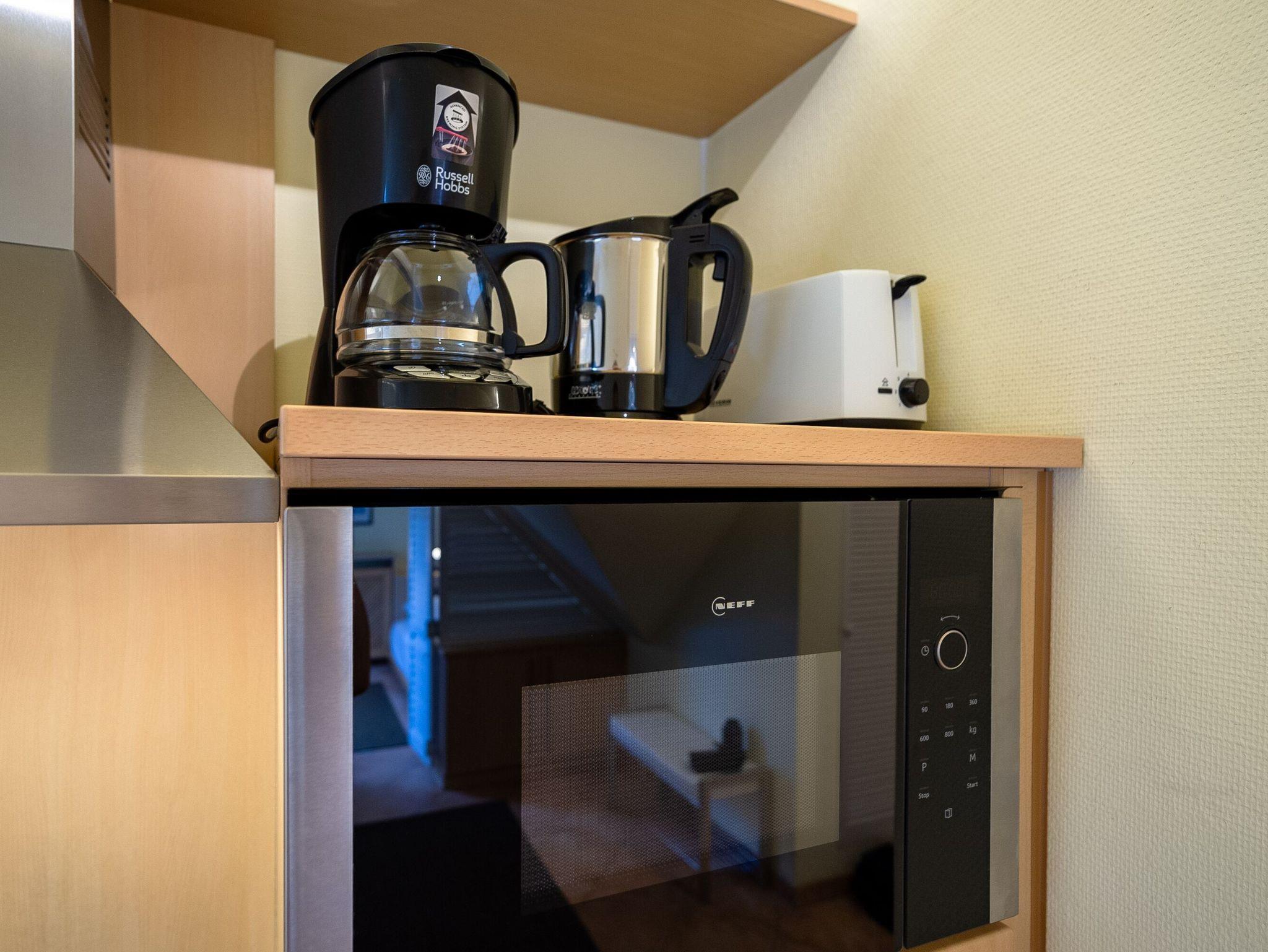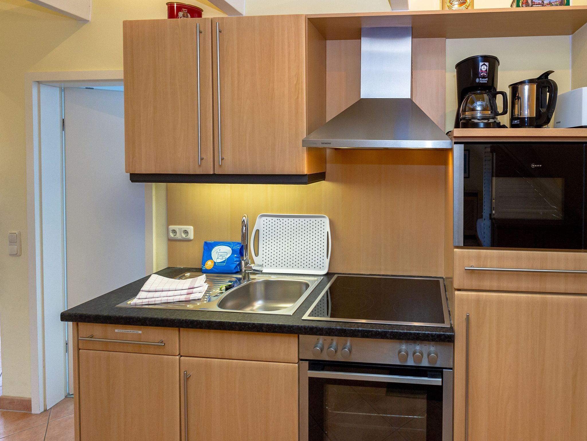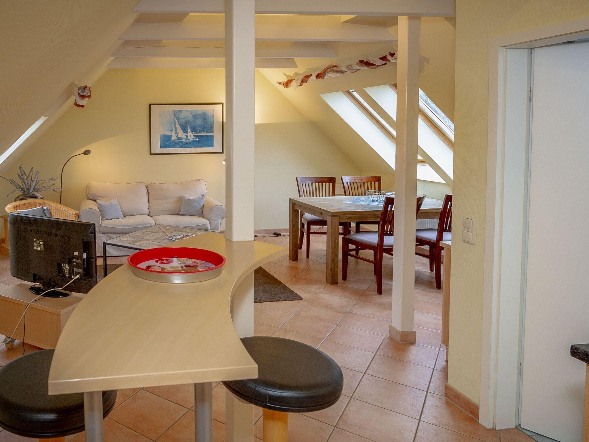 Die harmonisch in den Wohnbereich integrierte Küchenzeile ist mit einem Kühlschrank, einem 4-Zonen-Ceranherd, einem Backofen, einer Mikrowelle, Wasserkocher, Kaffeemaschine, Toaster, diversem Kleininventar und einer amerikanischen Küchentheke mit zwei Barhockern ausgestattet. Nur etwa zwei Gehminuten entfernt bieten Ihnen gleich zwei Bäcker eine reichhaltige Auswahl, dazu finden Sie wenige Schritte weiter einen gut sortierten Einkaufsmarkt. Der Esstisch bietet genügend Platz für 4 Personen.
