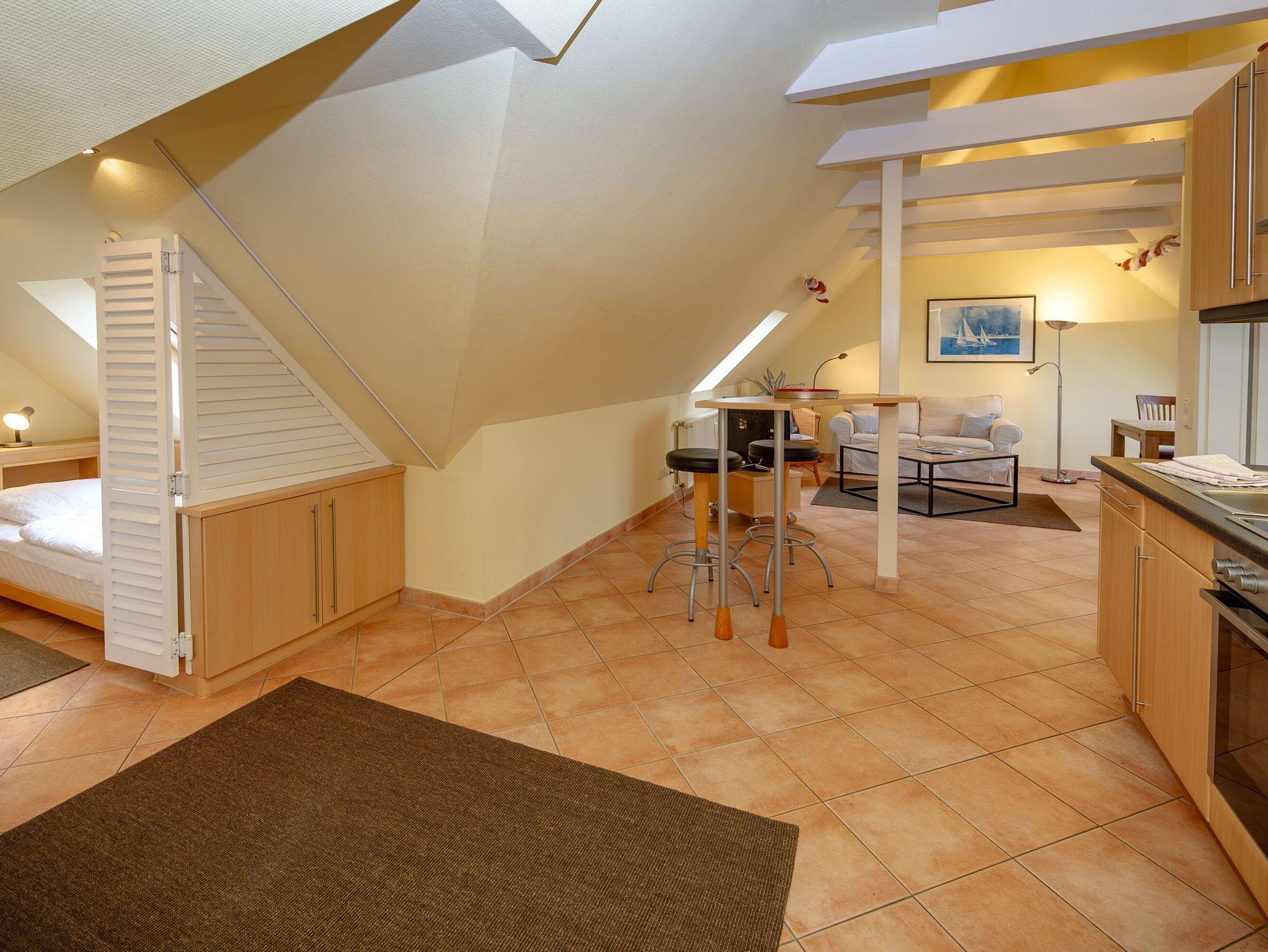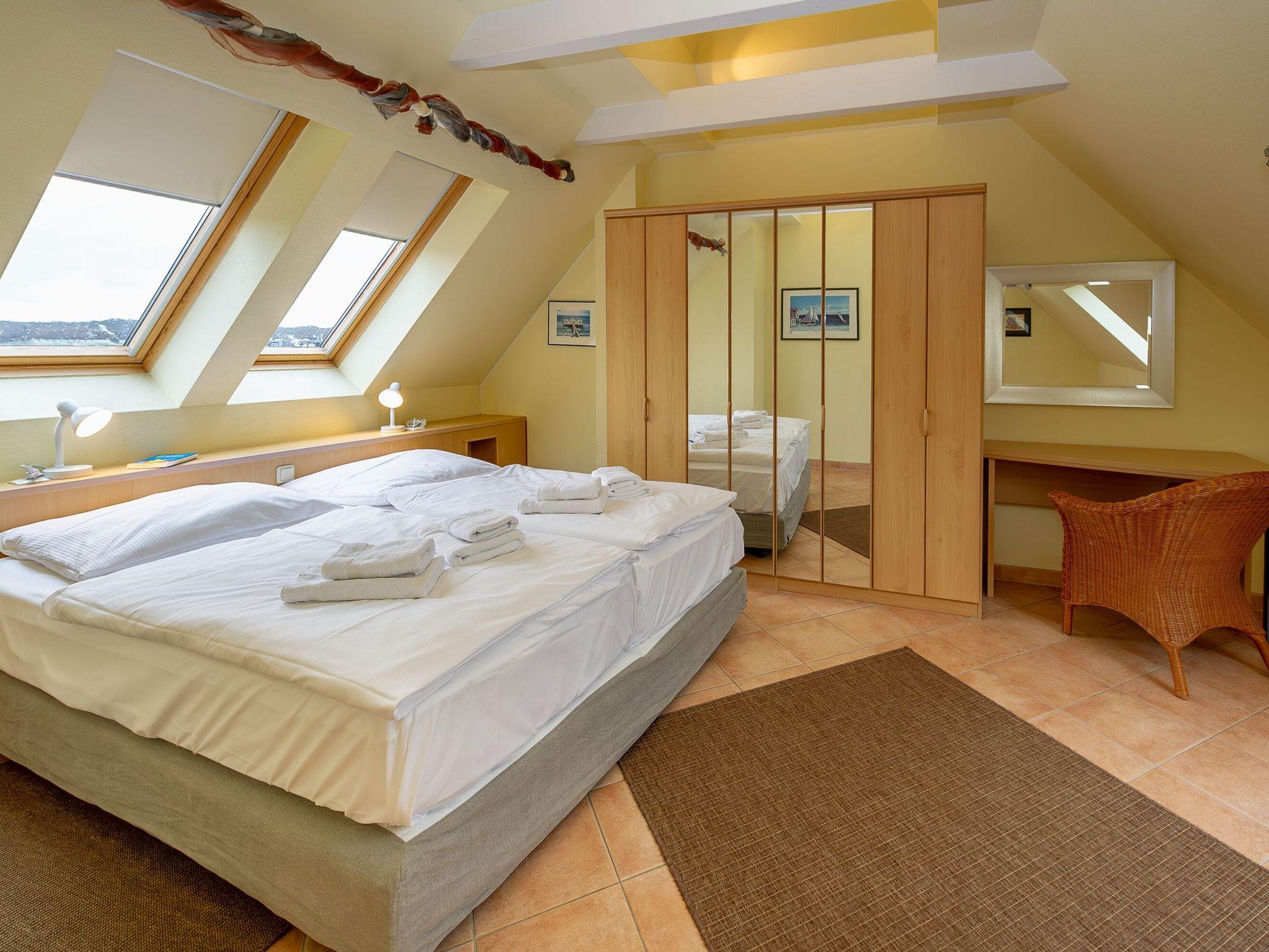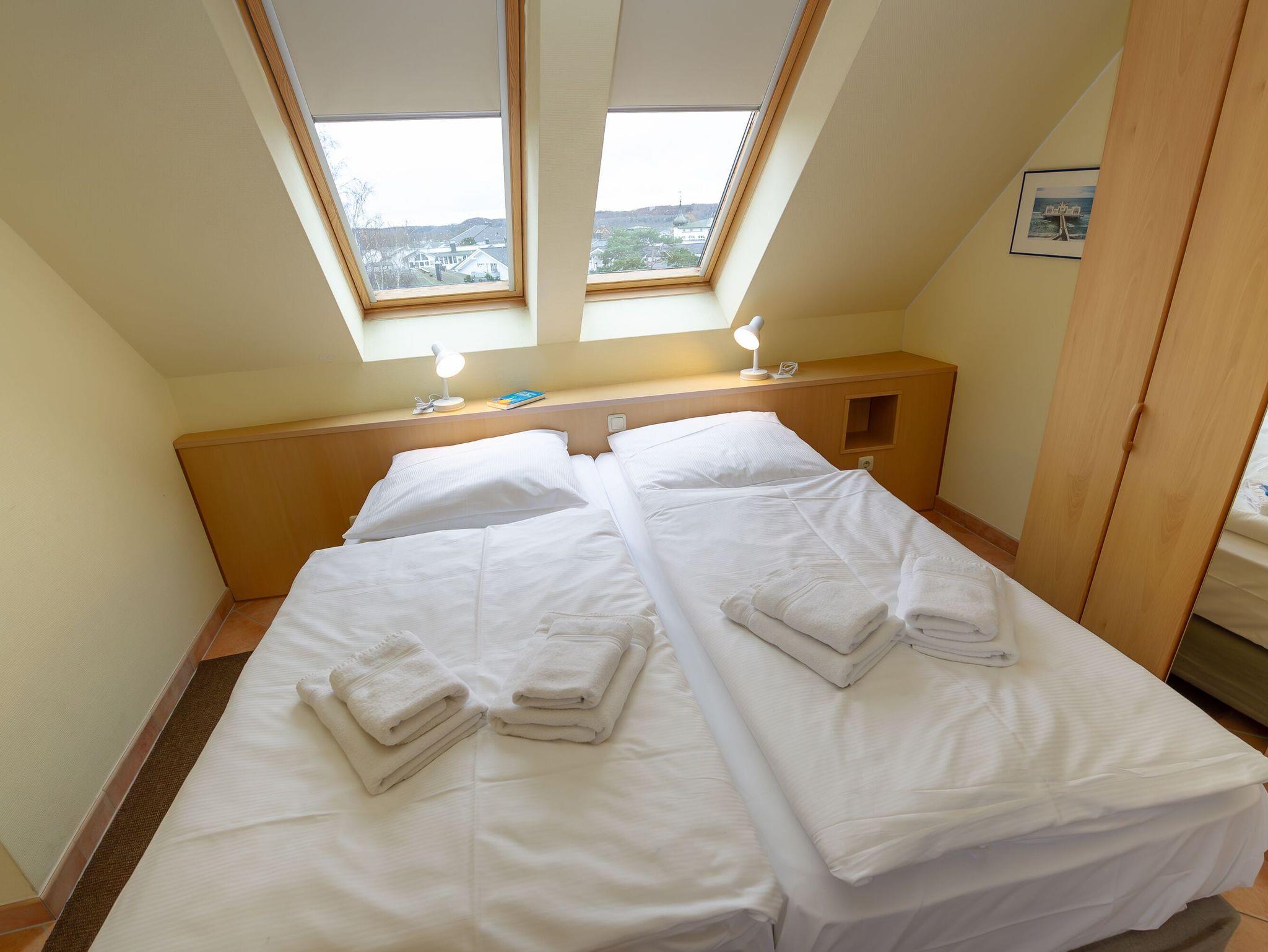 Das Appartement verfügt über zwei unterschiedlich große, freundliche Schlafzimmer. Ein Schlafzimmer ist großzügig geschnitten und mit einem Doppelbett sowie einem großen Schrank für Ihre Urlaubsgarderobe eingerichtet. Das zweite Schlafzimmer ist eine kuschelige kleine Schlafnische unter Dachschrägen mit zwei Einzelbetten - ideal geeignet für zwei Kinder, aber natürlich auch für Erwachsene.