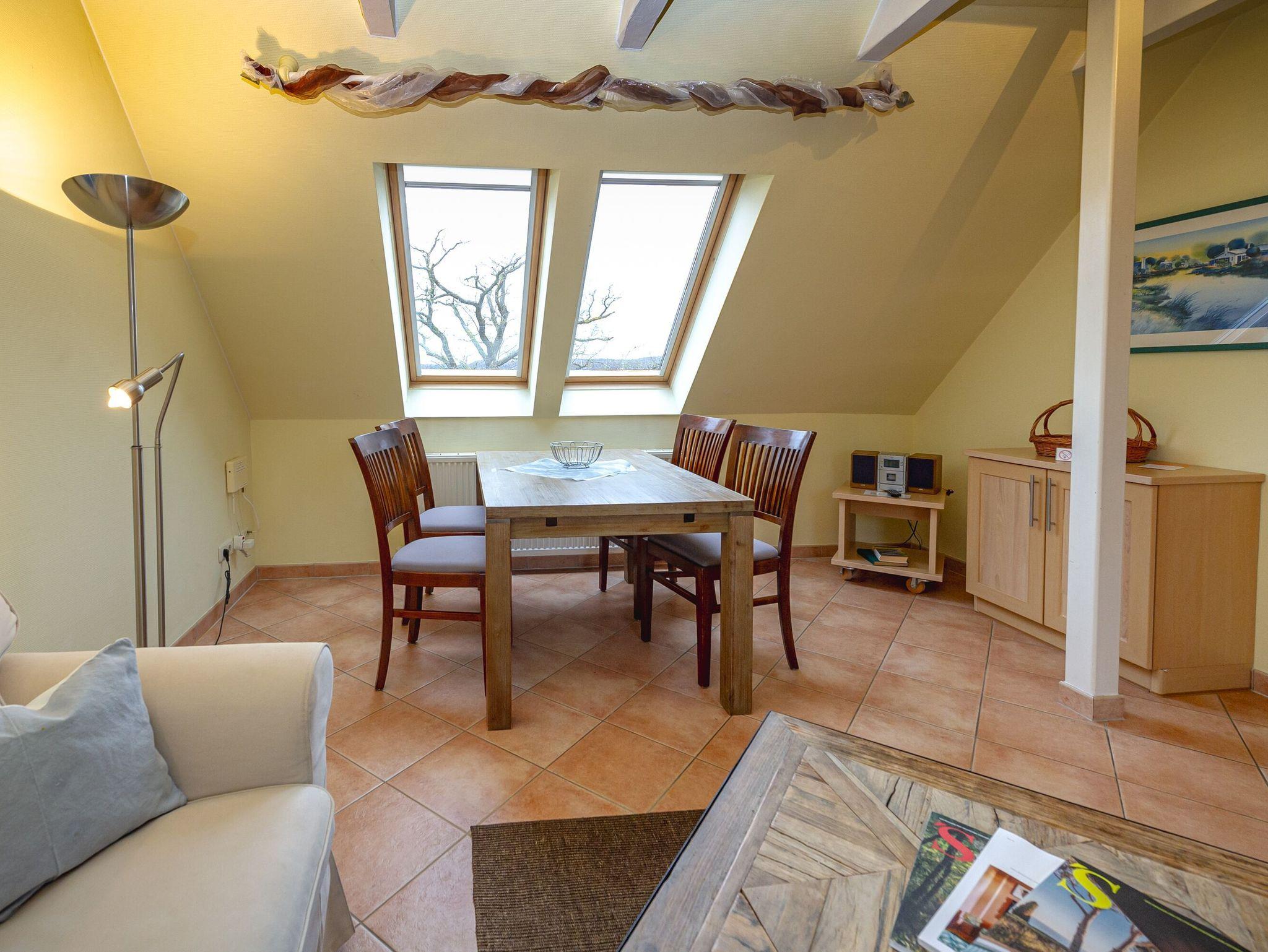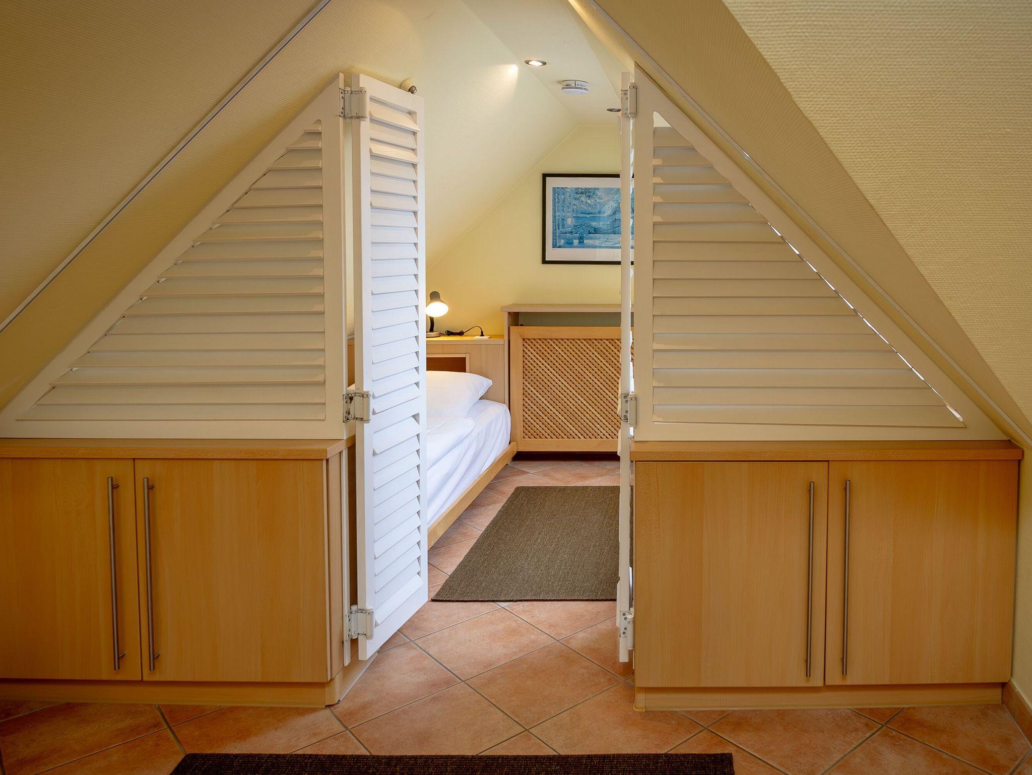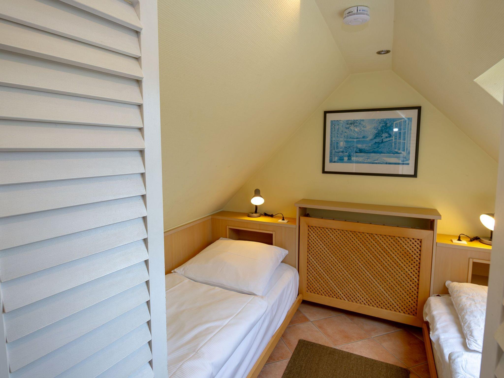 Das Appartement verfügt über zwei unterschiedlich große, freundliche Schlafzimmer. Ein Schlafzimmer ist großzügig geschnitten und mit einem Doppelbett sowie einem großen Schrank für Ihre Urlaubsgarderobe eingerichtet. Das zweite Schlafzimmer ist eine kuschelige kleine Schlafnische unter Dachschrägen mit zwei Einzelbetten - ideal geeignet für zwei Kinder, aber natürlich auch für Erwachsene.