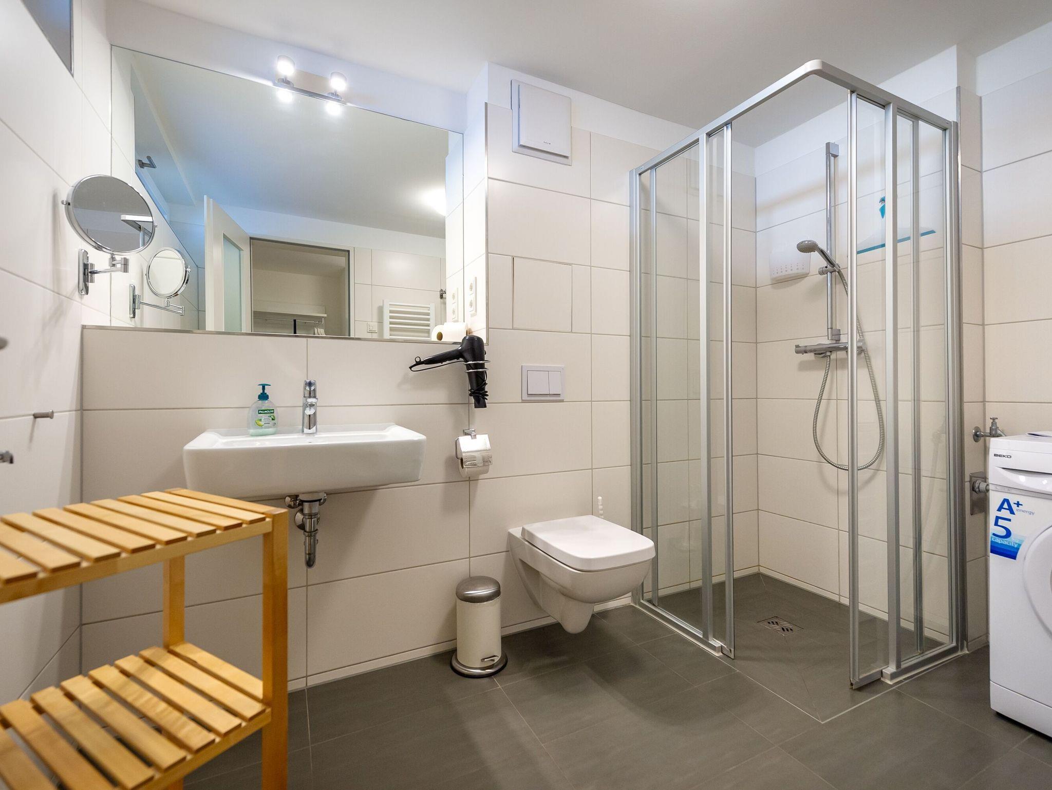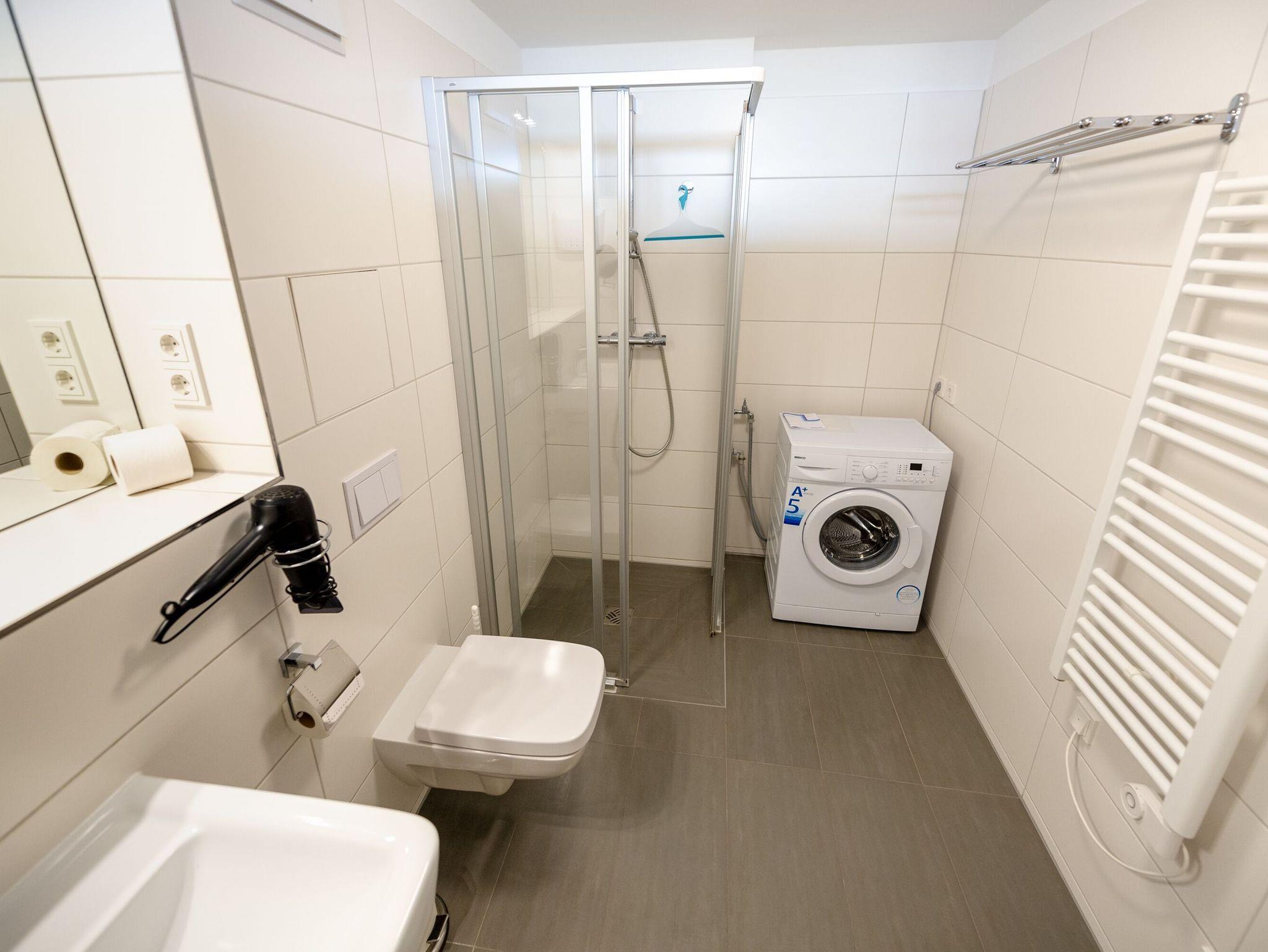 Auch das Badezimmer weiß zu überzeugen. Neben Dusche/WC, einem Handtuchwärmer, Kosmetikspiegel und Fön steht Ihnen hier sogar eine Waschmaschine zur Verfügung. Ideal für die kleine Urlaubswäsche zwischendurch.