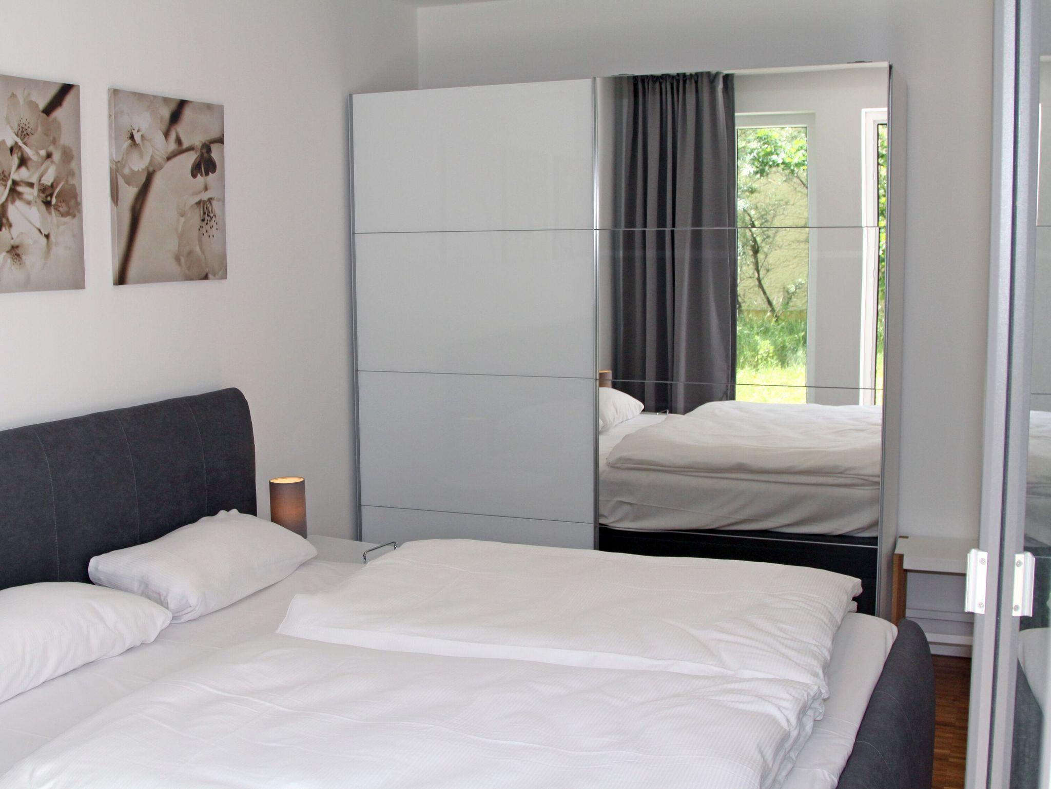 Im separaten Schlafzimmer bietet ein herrlich bequemes Boxspringbett (1,80 x 2,00 m) allerbesten Schlafkomfort. Im großen Kleiderschrank ist Platz für Ihre Urlaubsgarderobe.