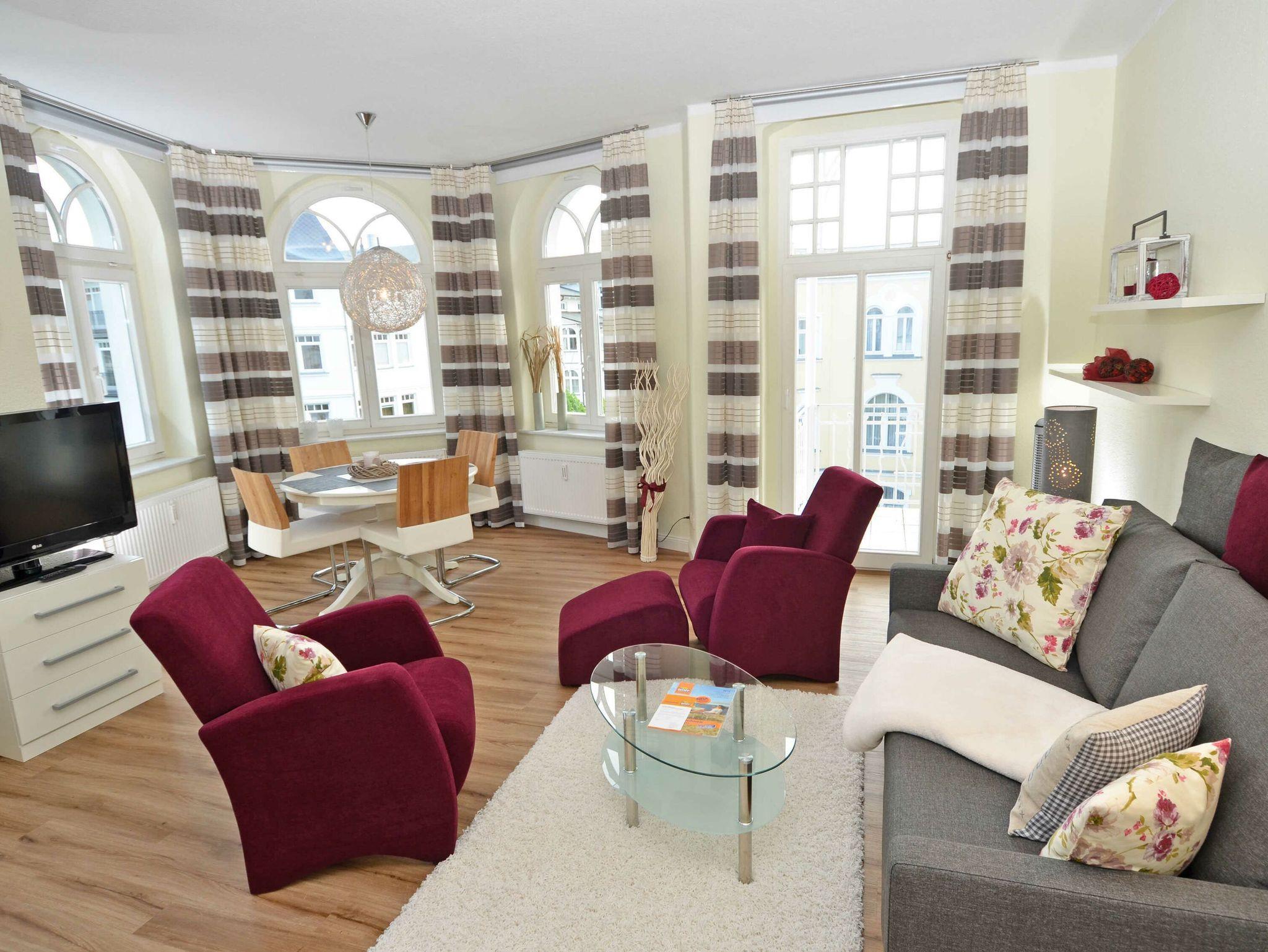 Der helle, freundliche Wohnraum ist mit einer bequemen Sitzgarnitur mit komfortabler Schlaf- [&] Relaxfunktion sowie einem Flachbild-TV, einer Mini-Stereoanlage mit CD-Player und einem kostenlosen WLAN-Zugang ausgestattet. Vom Wohnbereich geht es direkt auf den breiten Balkon mit Meerblick und einem Terrassenheizstrahler. Von hier aus können Sie dem bunten Treiben auf dem Weg zum Strand zusehen. Auch von der Essecke im Erker hat man einen phantastischen Blick auf die Ostsee.