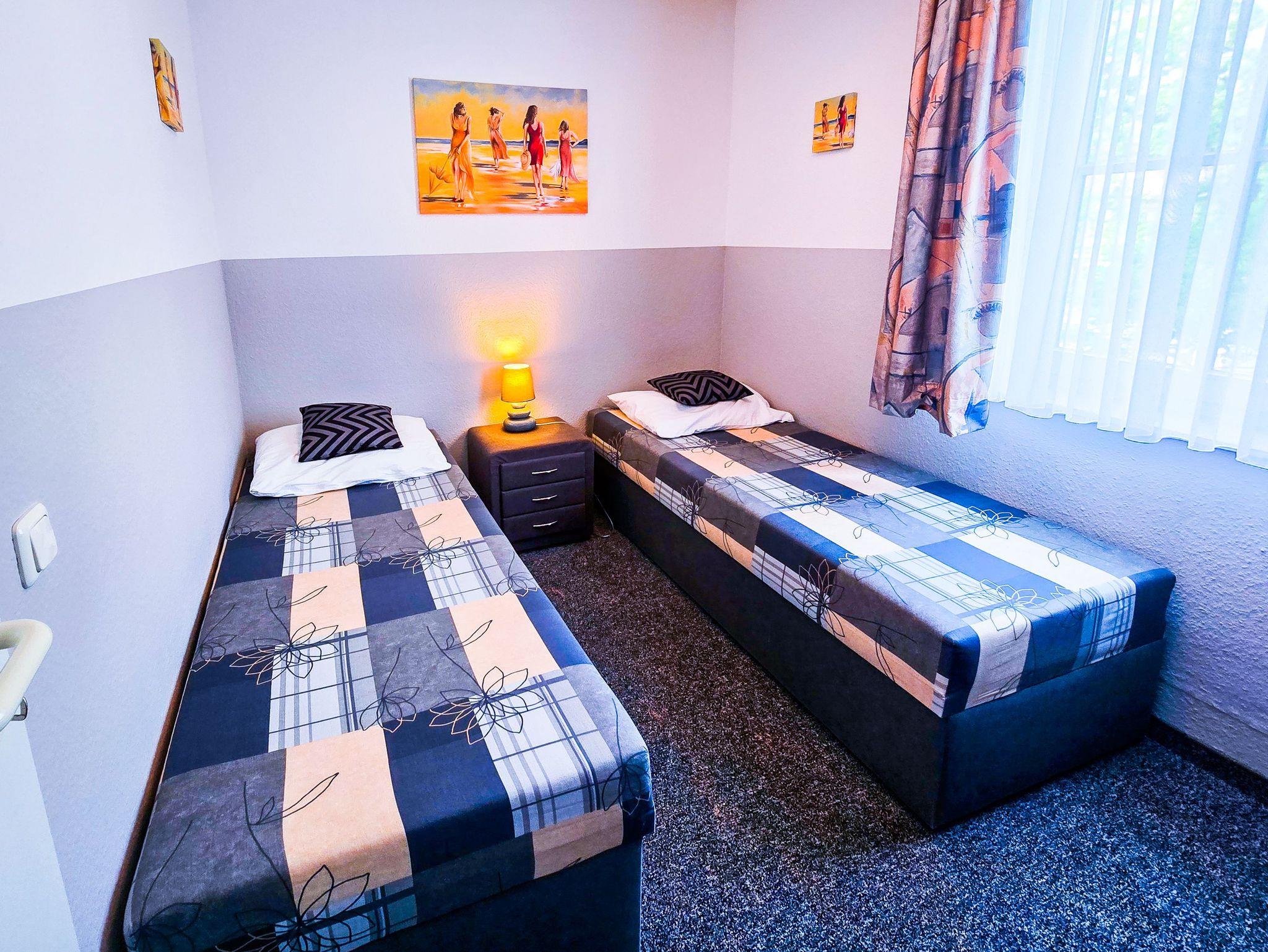 Die 3 Raum Appartements der Kategorie A sind ca. 50 qm groß und befinden sich im 1. und 2. Obergeschoß. Es stehen Ihnen ein Wohnraum mit Küche, ein Badezimmer mit Dusche mit WC sowie zwei Schlafzimmer zur Verfügung. In den Schlafräumen steht jeweils ein Doppelbett mit zwei Matrazen, im Wohnraum können zusätzlich bis zu zwei Personen auf einer kombinierten Wohn- / Schlafcouch übernachten. Für ein Kleinkind bis 2 Jahre stellen wir Ihnen gerne ein Reisebettchen in die Wohnung (einmalig 15 ).