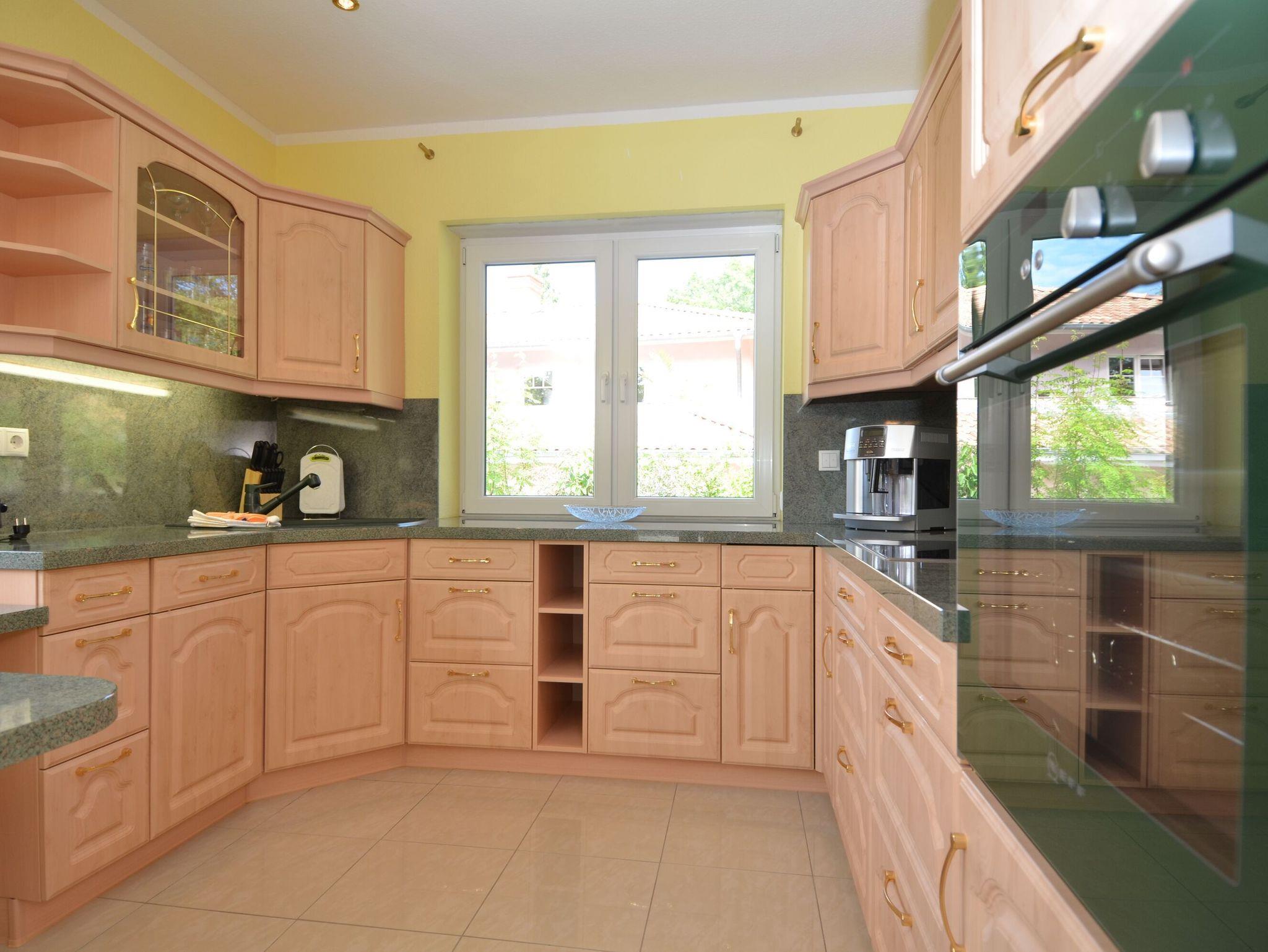 Die separate Küche ist modern eingerichtet mit einem 4-Zonen-Cerankochfeld, einem Backofen, einer Geschirrspülmaschine, einem Kühlschrank, einem Delonghi-Kaffeeautomaten, einem Wasserkocher, einem Toaster und diversem Kleininventar, welches die gute Ausstattung komplettiert. Ein kleiner Tisch mit zwei Stühlen steht für den morgendlichen Kaffee bereit.