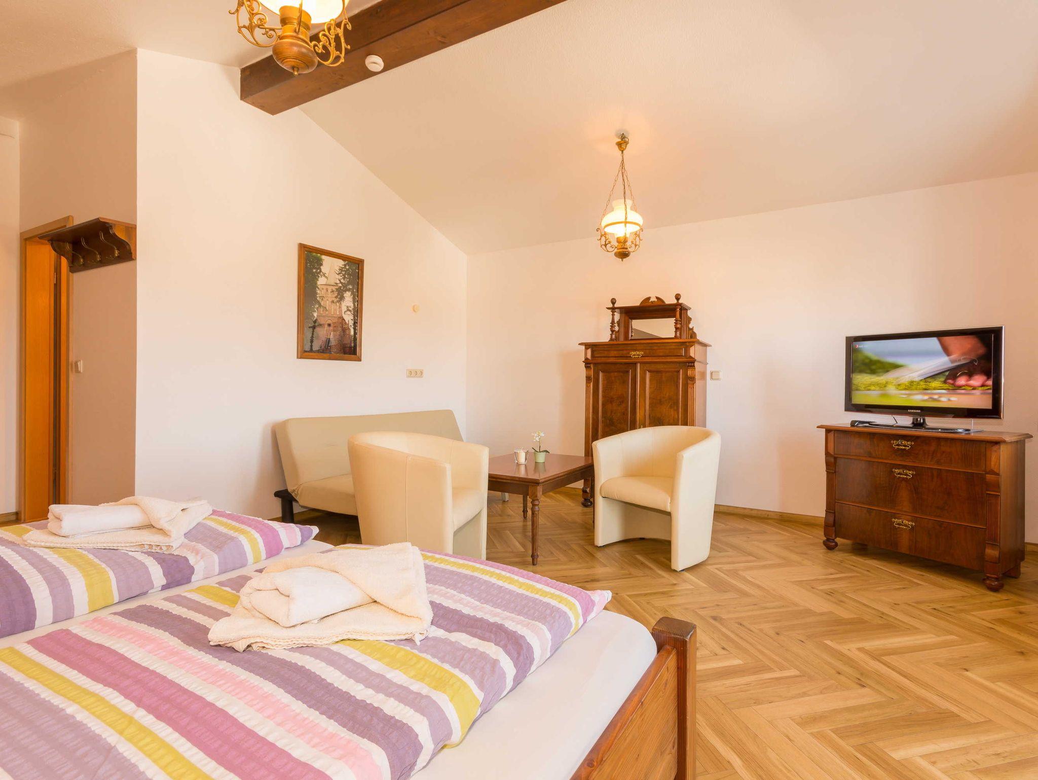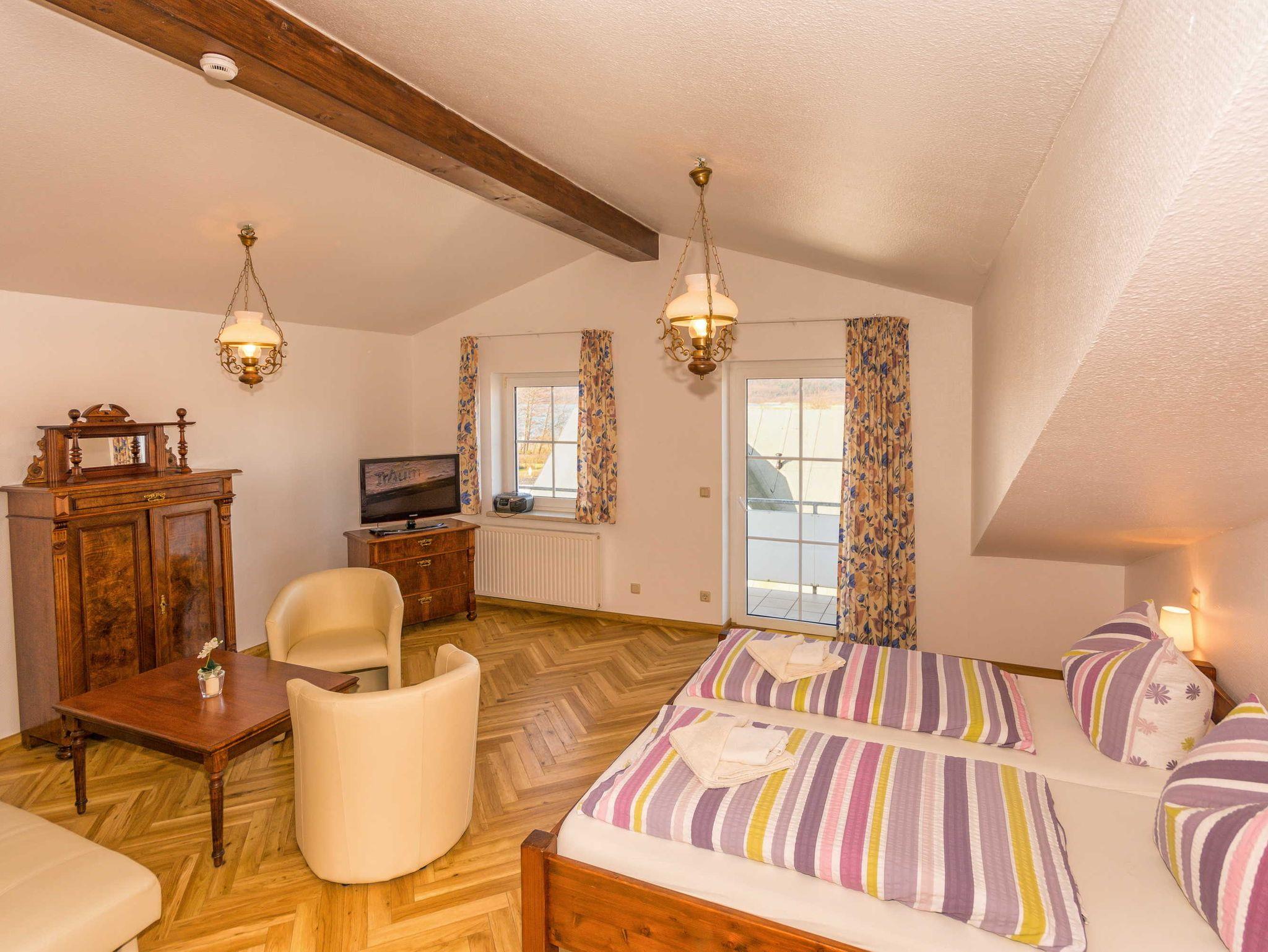 Doppelzimmer (gross) für 2-4 Personen: kombiniertes Wohn- und Schlafzimmer mit Doppelbett und grosser Sitzecke (Doppelschlafcouch als Aufbettungsmoeglichkeit); Bad, Dusche und WC; Kabel-TV; Grundflaeche ca. 40 qm;