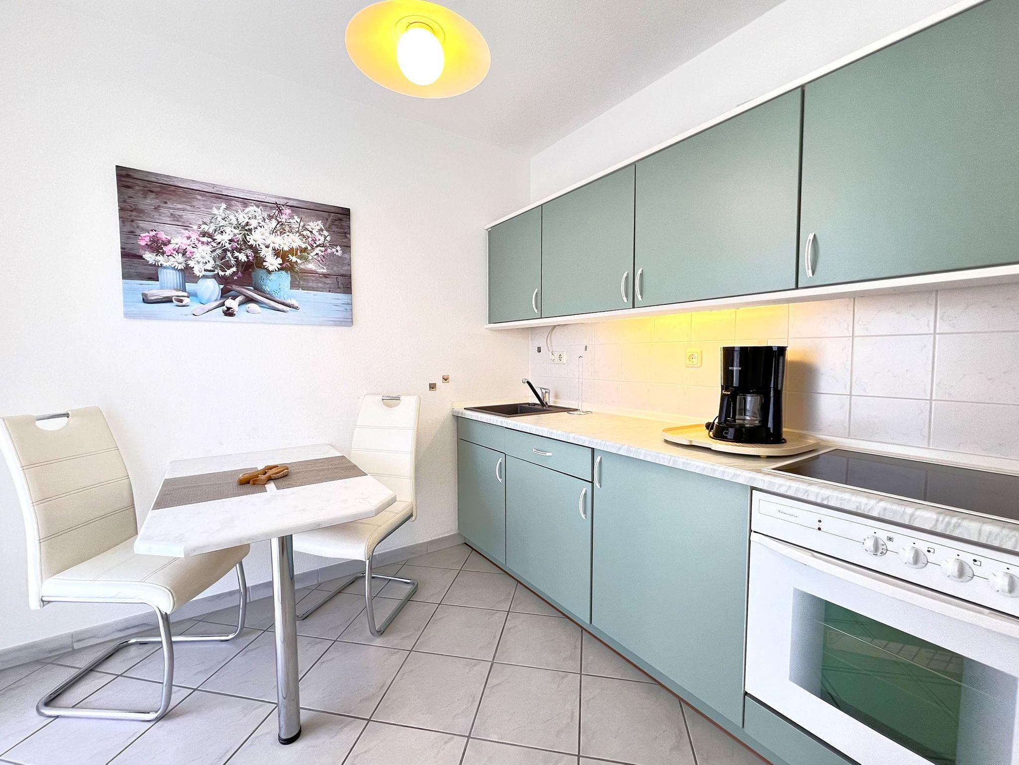 In der gut ausgestatteten, separaten Küche finden sich alle gängigen Geräte, darunter Herd, Backofen und Kühlschrank ? perfekt für die Zubereitung eigener Mahlzeiten. Von hier aus gelangt man direkt auf den Balkon, der einen schönen Platz bietet, um die frische Ostseeluft zu genießen.