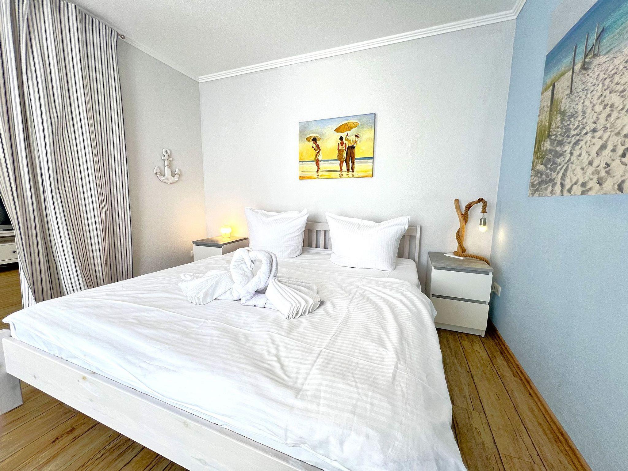 Die Ferienwohnung „Strandhafer“ ist eine gemütliche Einraumwohnung mit 45 m² Wohnfläche im 1. Obergeschoss ? ideal für zwei Personen. Der einladende Wohnbereich bietet eine komfortable Sitzecke und einen Fernseher, perfekt für entspannte Stunden. Das separate Schlafzimmer ist mit einem bequemen Doppelbett ausgestattet und sorgt für erholsamen Schlaf.