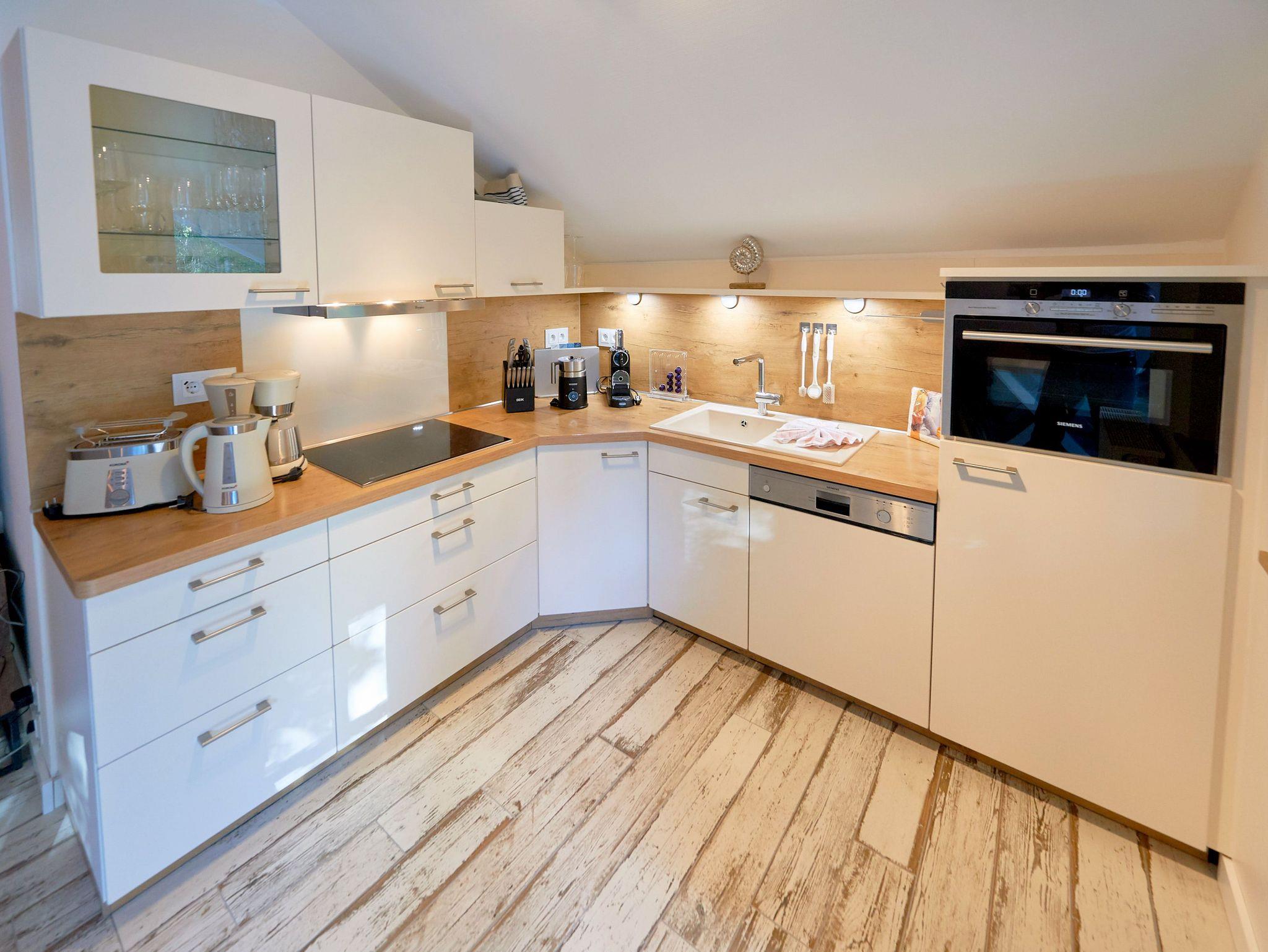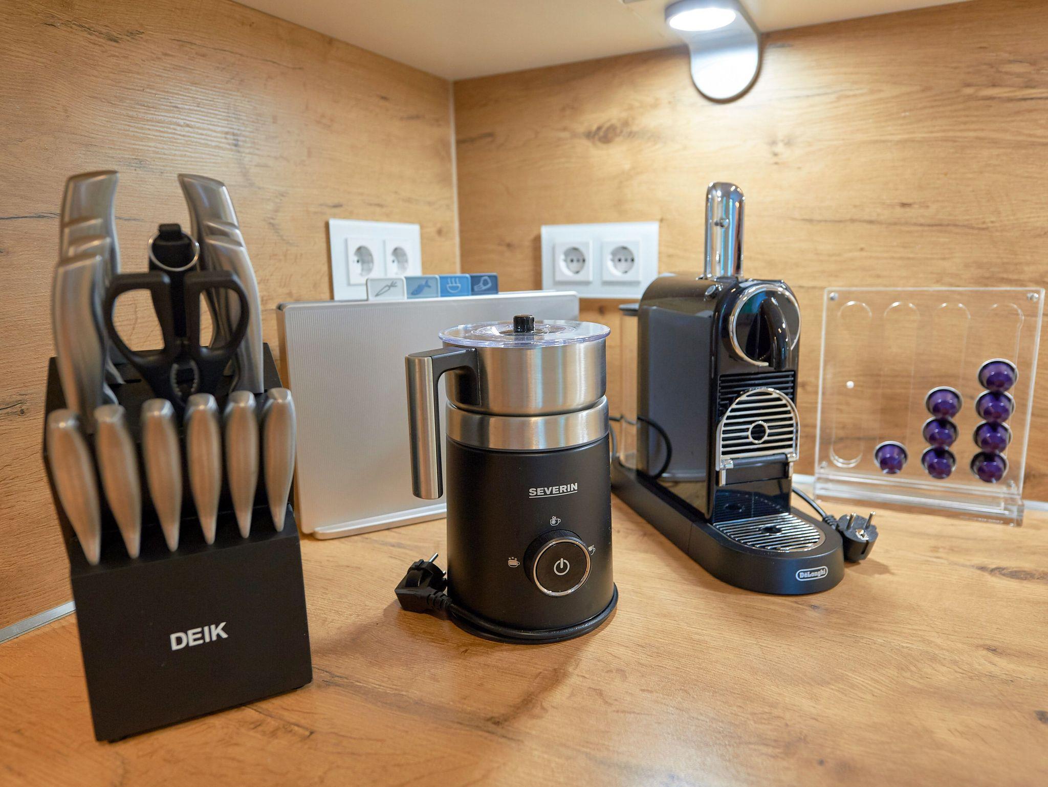 • integrierte Küche mit ausgezeichneter Ausstattung, u.a. 4-Zonen-Induktionsherd, Backofen, Mikrowelle, Geschirrspüler, Kühlschrank/Gefrierfach, Nespresso-Kapselmaschine, Filterkaffeemaschine, Toaster, Wasserkocher, außerdem hochwertiges Geschirr und Besteck von führenden Markenherstellern