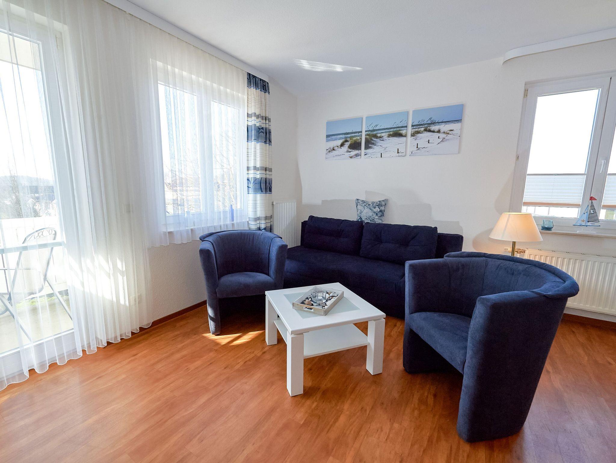 Dieses schöne 2-Raum-Appartement ist ca. 45 m² groß, befindet sich im 1. Obergeschoss und verfügt einen sonnigen Balkon zur Südseite mit teilweise seitlichem Blick zum Schmachter See. Der gemütliche Wohnraum ist mit einem Esstisch für 4 Personen, einer bequemen Schlafcouch, einer Mini-Stereoanlage, einem Flachbild ? TV und einem DVD-Player ausgestattet.