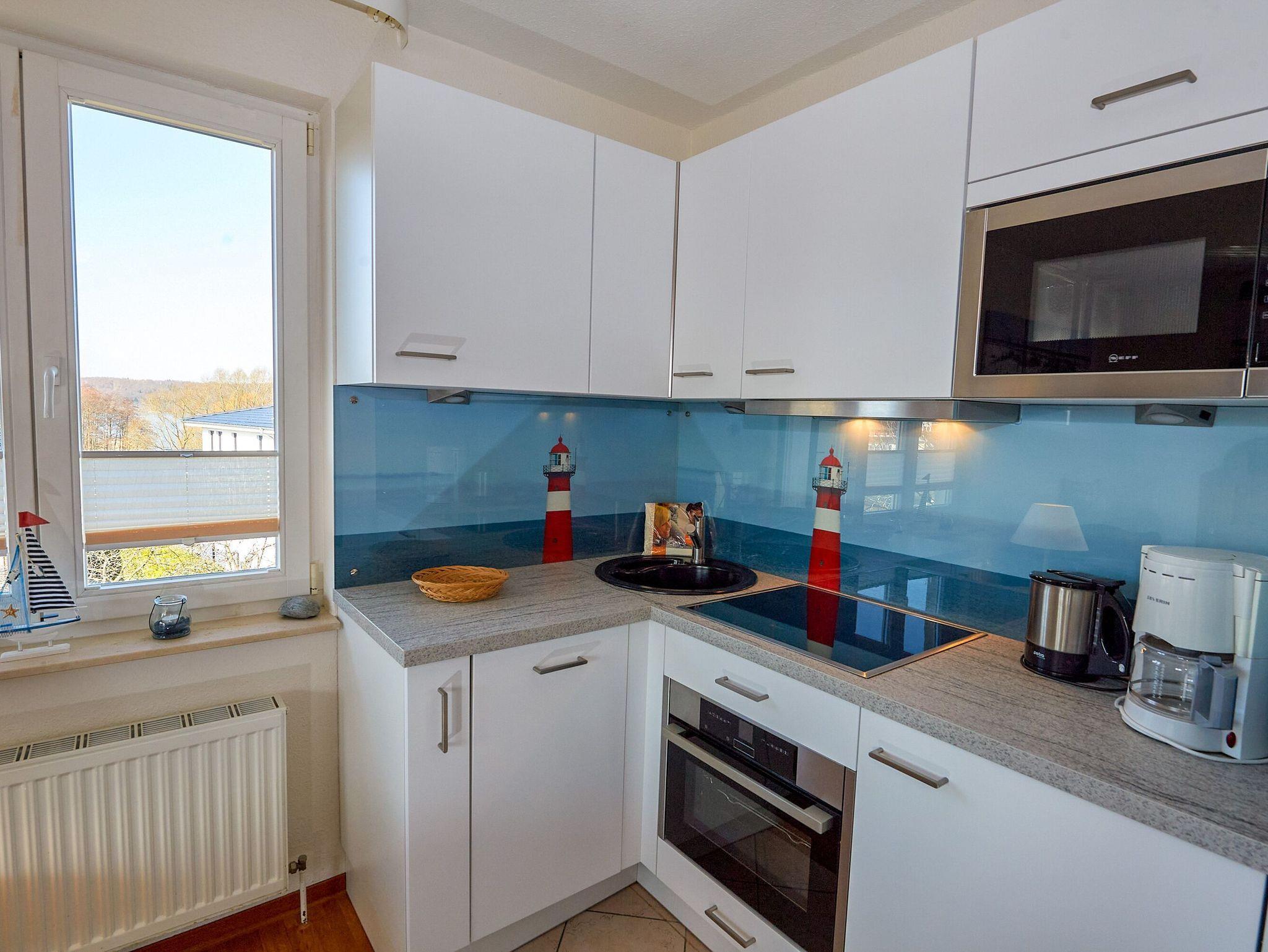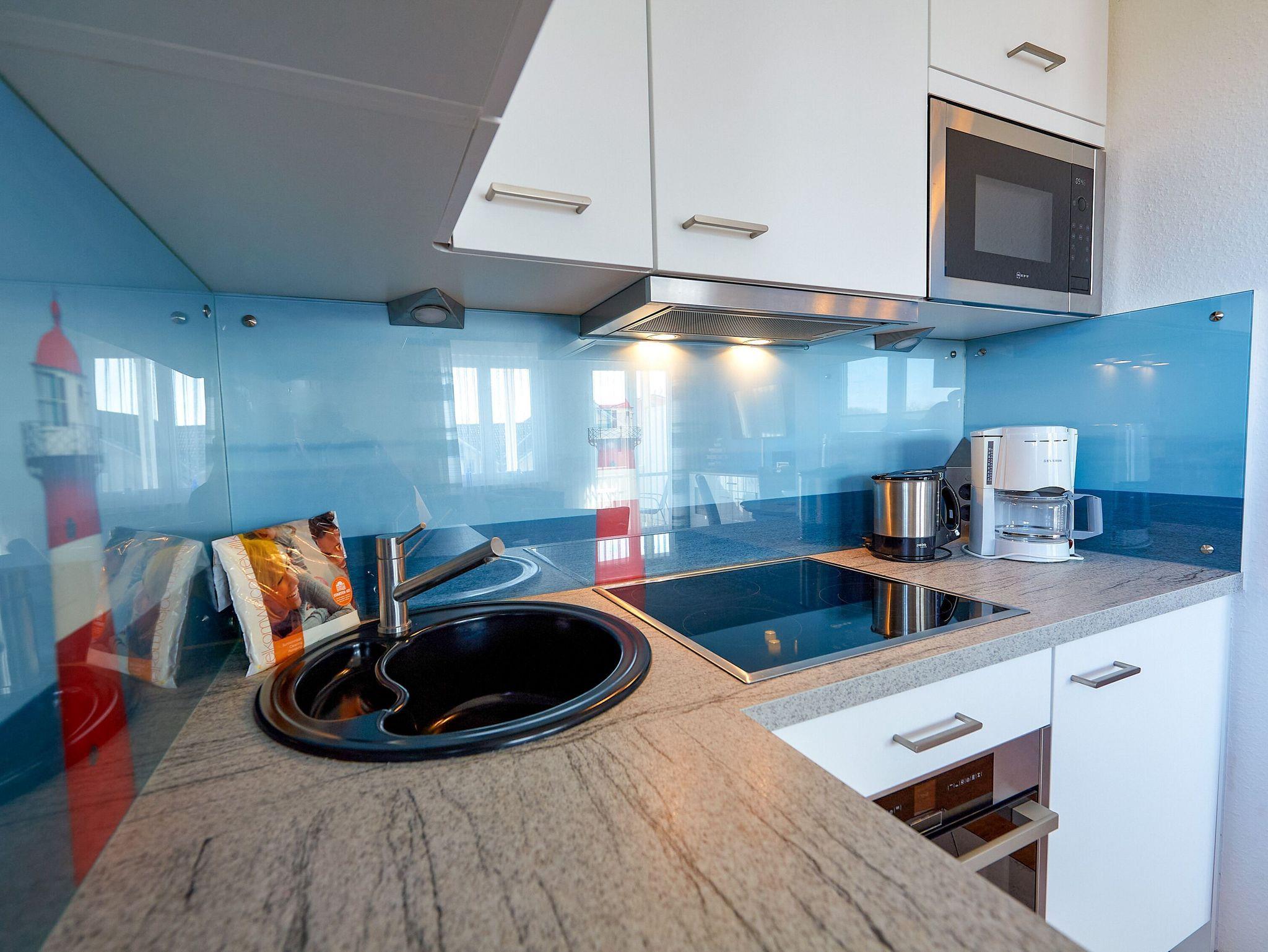 Die komplett ausgestattete Küchenzeile wurde harmonisch in den Wohnraum integriert. Ein Kühlschrank mit Gefrierfach, eine Mikrowelle, ein 4-Zonen-Cerankochfeld, ein Backofen, ein Geschirrspüler, sowie Wasserkocher, Kaffeemaschine, Toaster und diverses Kleininventar komplettieren die Küchenausstattung.
