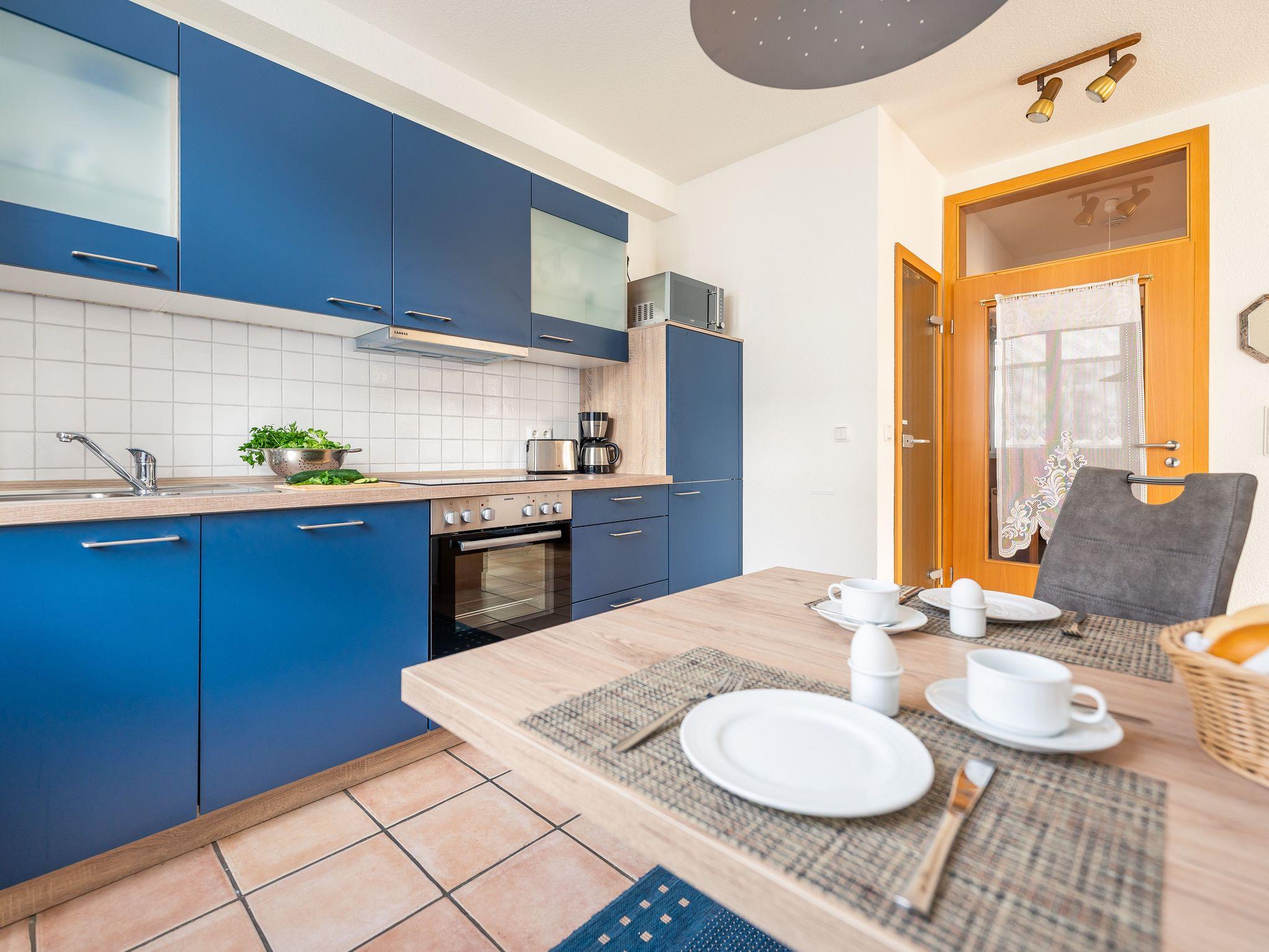 • Küche: Mikrowelle, Backofen,, Kühlschrank mit Gefrierfach, Kaffeemaschine, Toaster und Wasserkocher