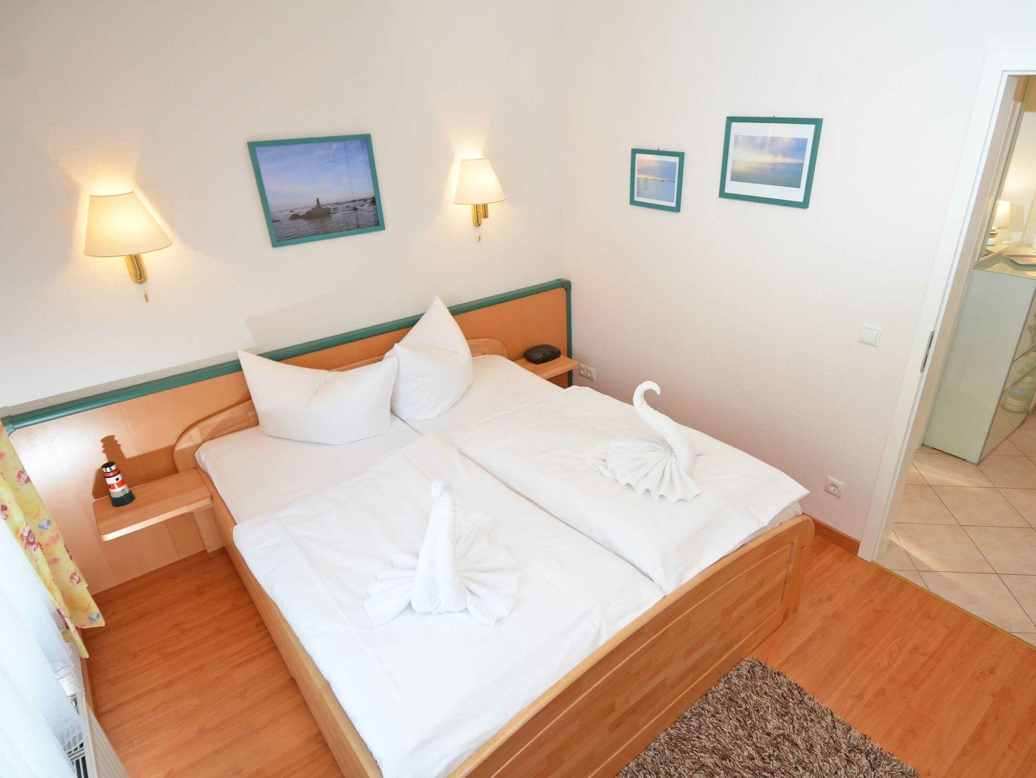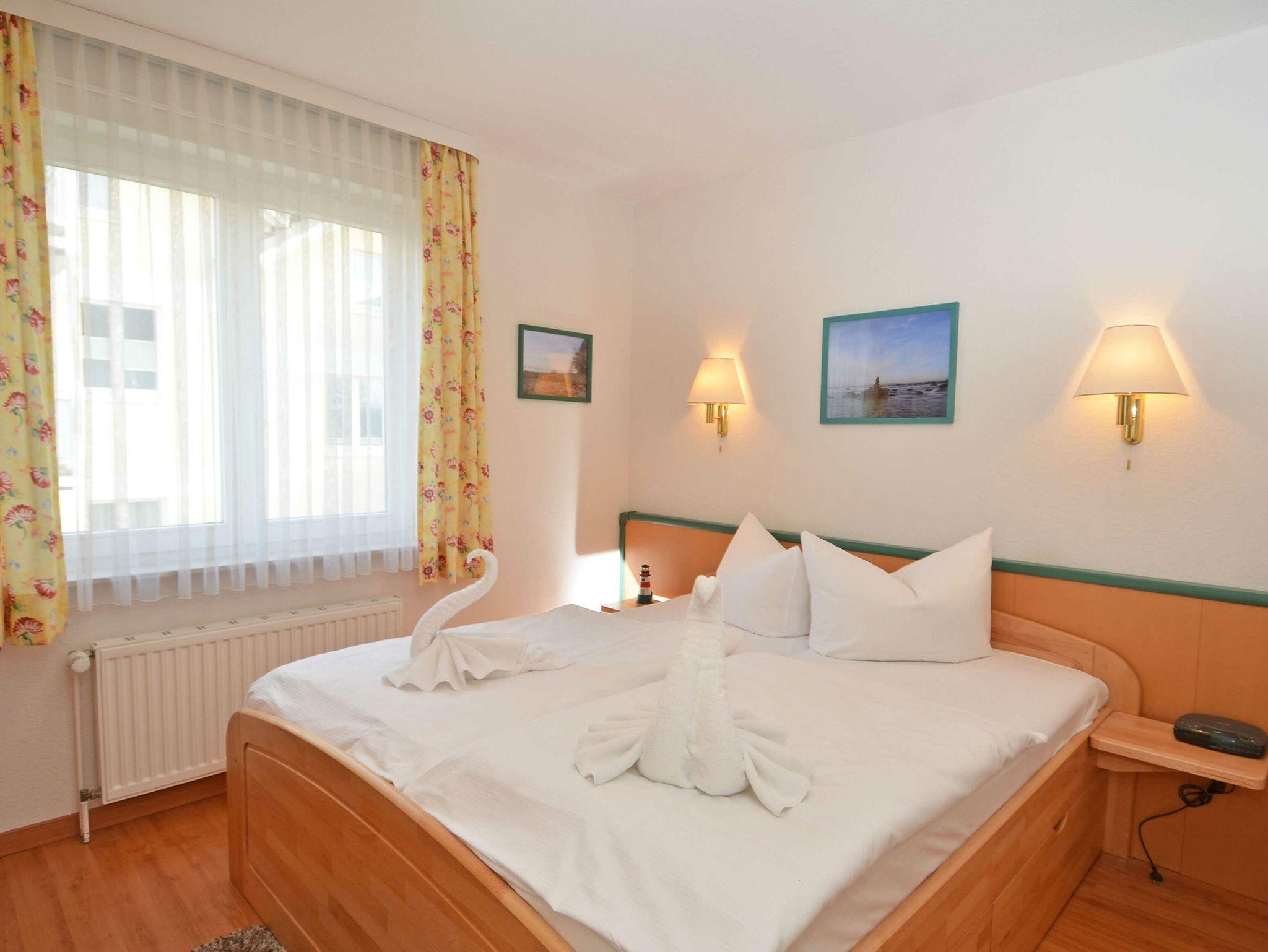 Das separate Schlafzimmer ist mit einem bequemen Doppelbett und einem Kleiderschrank mit ausreichend Platz für Ihre Urlaubsgarderobe ausgestattet. Im Badezimmer stehen Ihnen Dusche/WC sowie ein Waschtisch nebst Haartrockner zur Verfügung.
