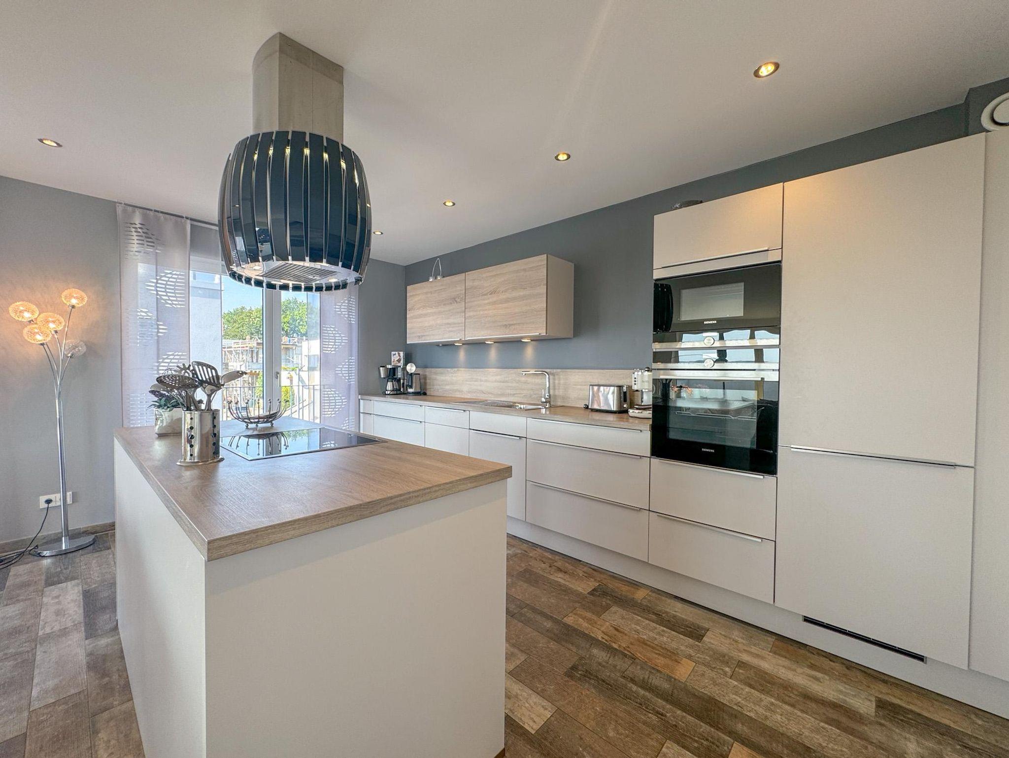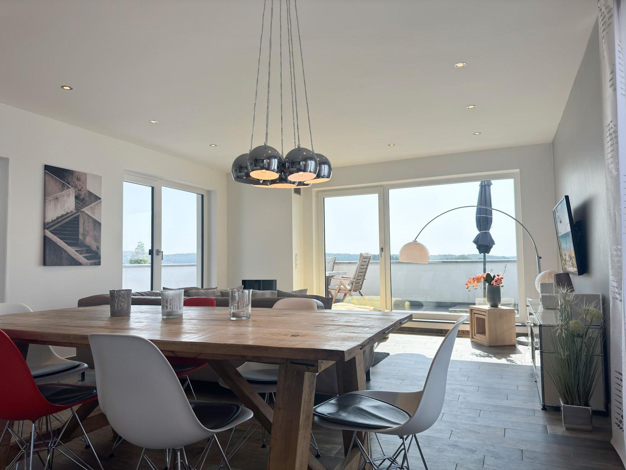 Der lichtdurchflutete Wohnbereich mit hochwertiger Einrichtung führt ebenfalls auf die großzügige Dachterrasse, die einen atemberaubenden Blick über die Dächer von Binz bietet. Eine moderne, voll ausgestattete Küche lässt keine Wünsche offen.