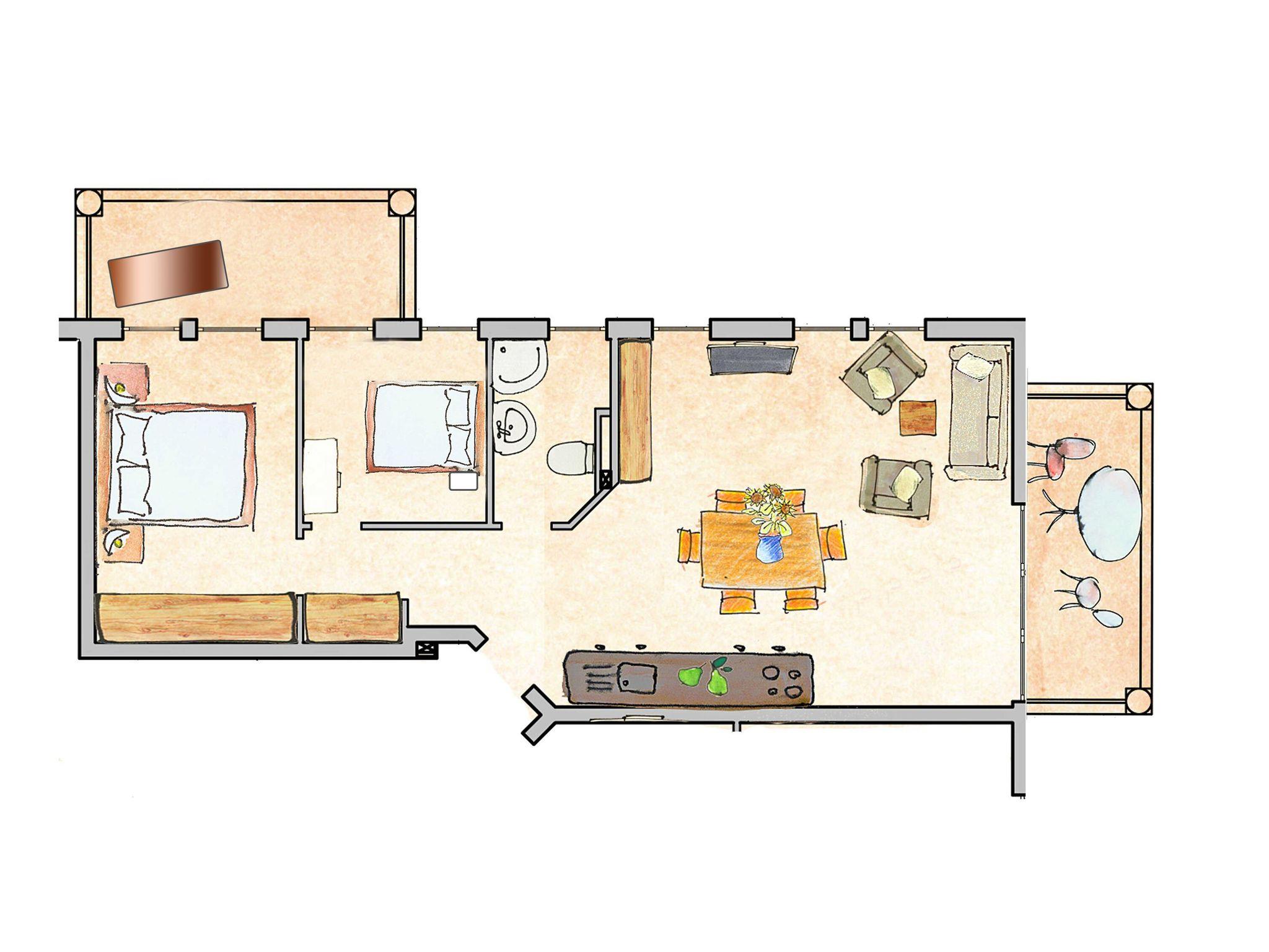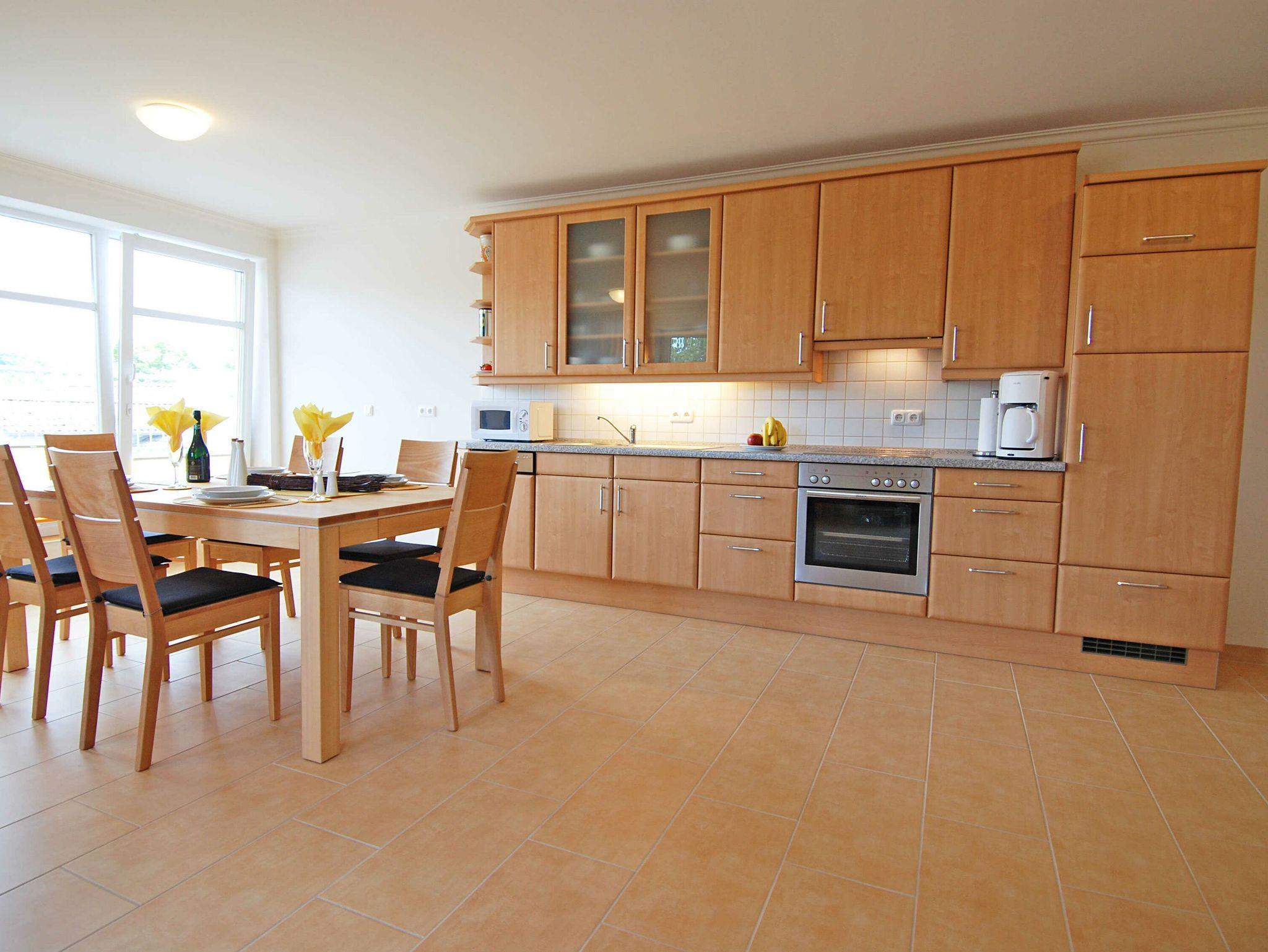 Vom Eingangsbereich aus betreten Sie das geflieste und großzügig ausgestattete Wohnzimmer mit exklusiven Vollholzmöbeln, einem großformatigen LOEWE-Smart-TV und einer Sonoro-Musikanlage mit Internet und Bluetooth. W-LAN ist kostenfrei verfügbar. Bücher und Gesellschaftsspiele sorgen dafür, dass selbst bei nicht so schönem Wetter keine Langeweile aufkommt. Eine moderne Fußbodenheizung schafft in der gesamten Wohnung rund ums Jahr angenehme Wohlfühl-Temperaturen.