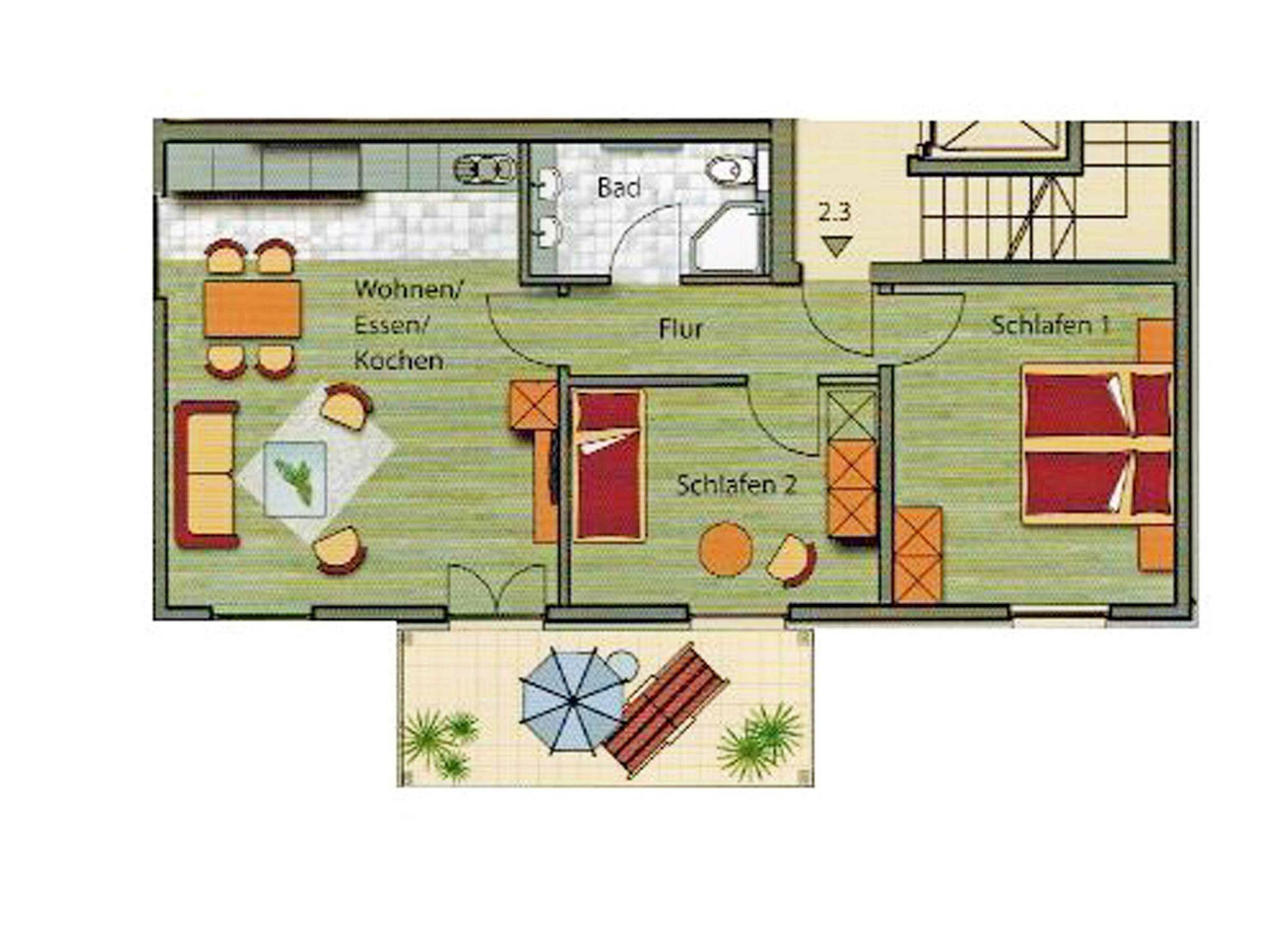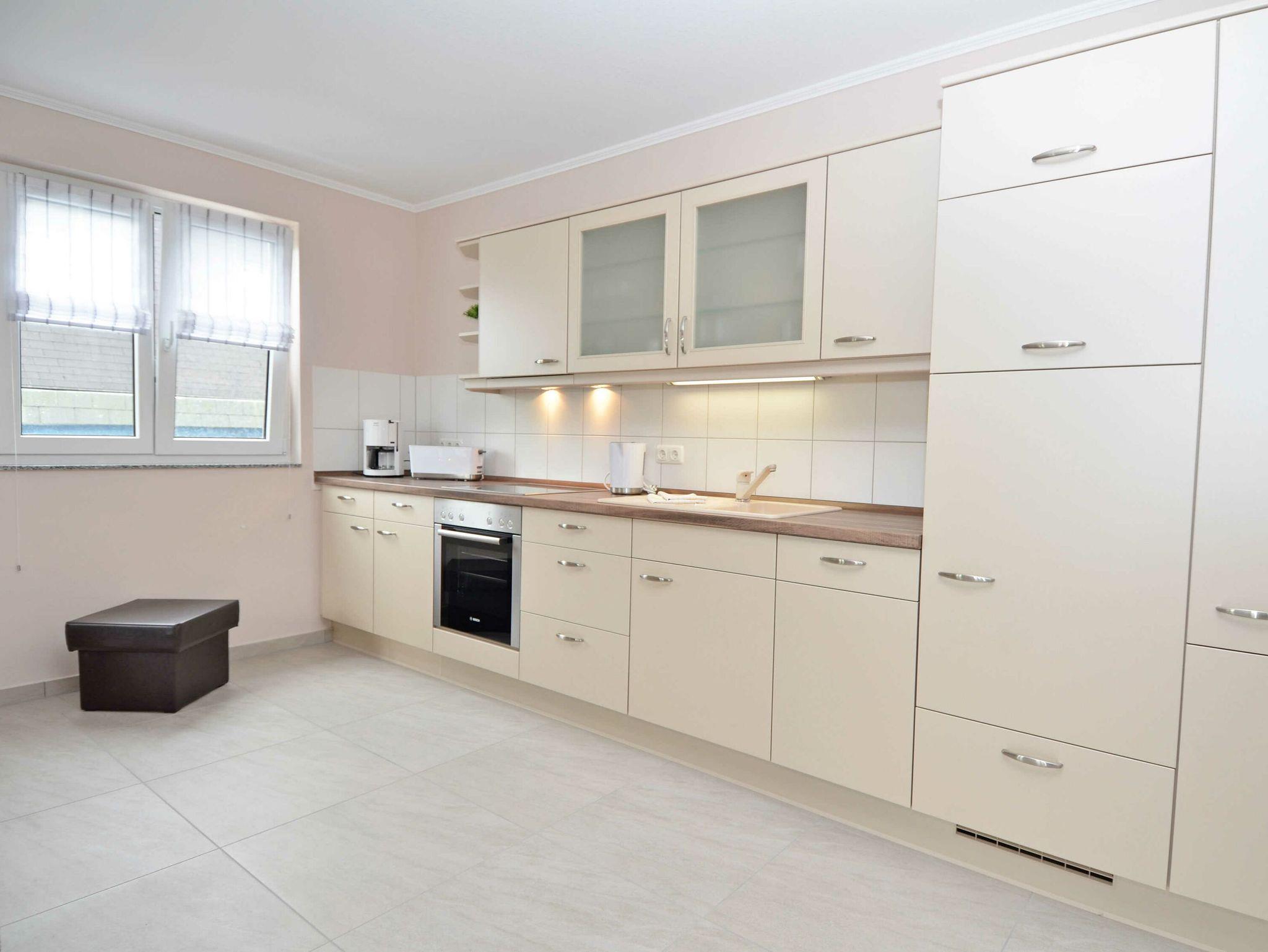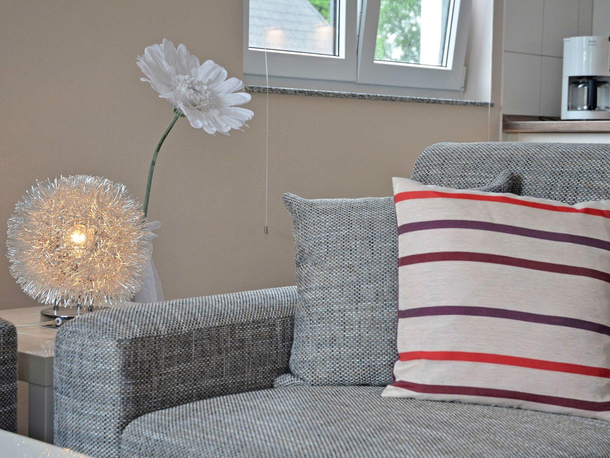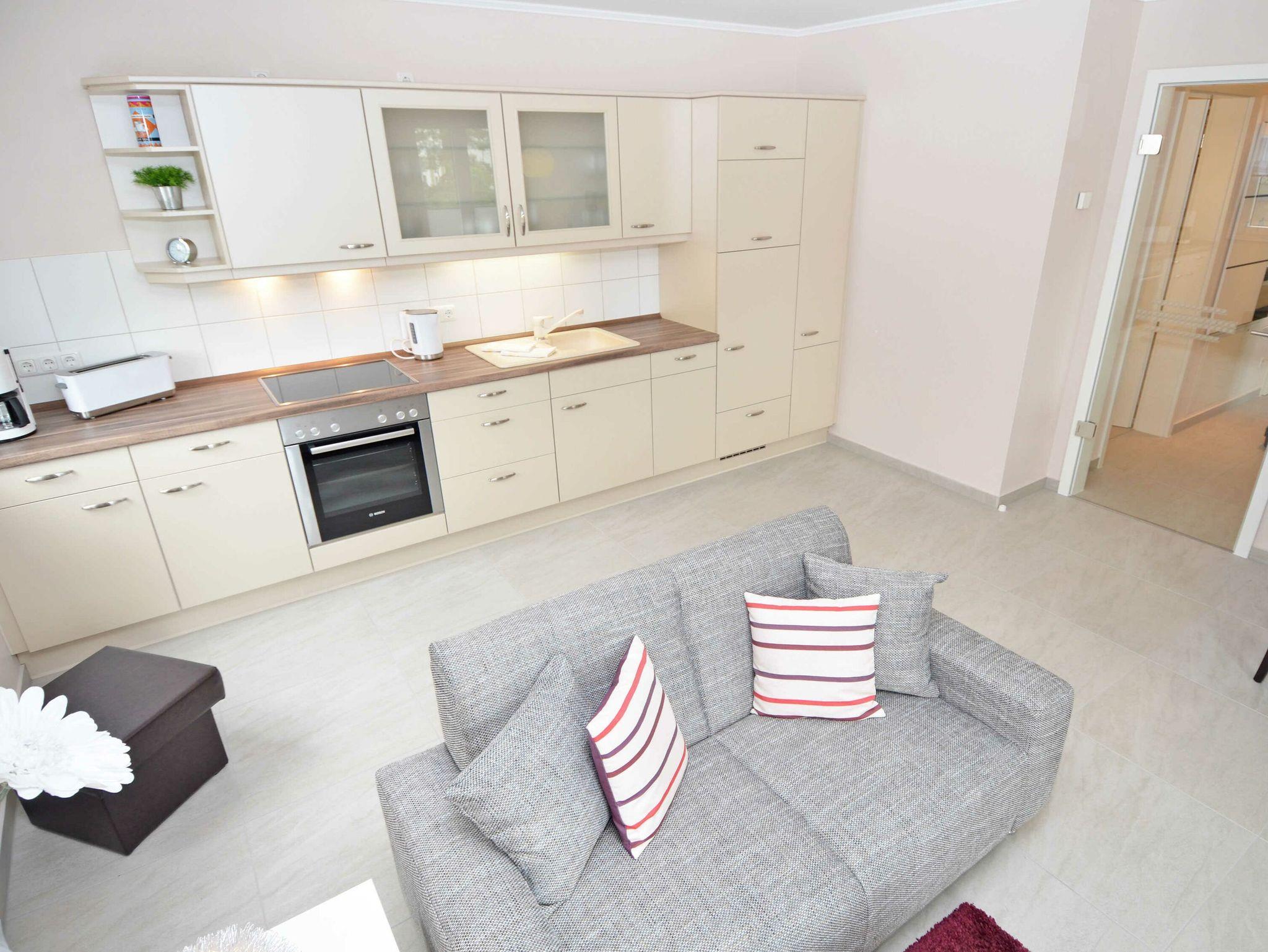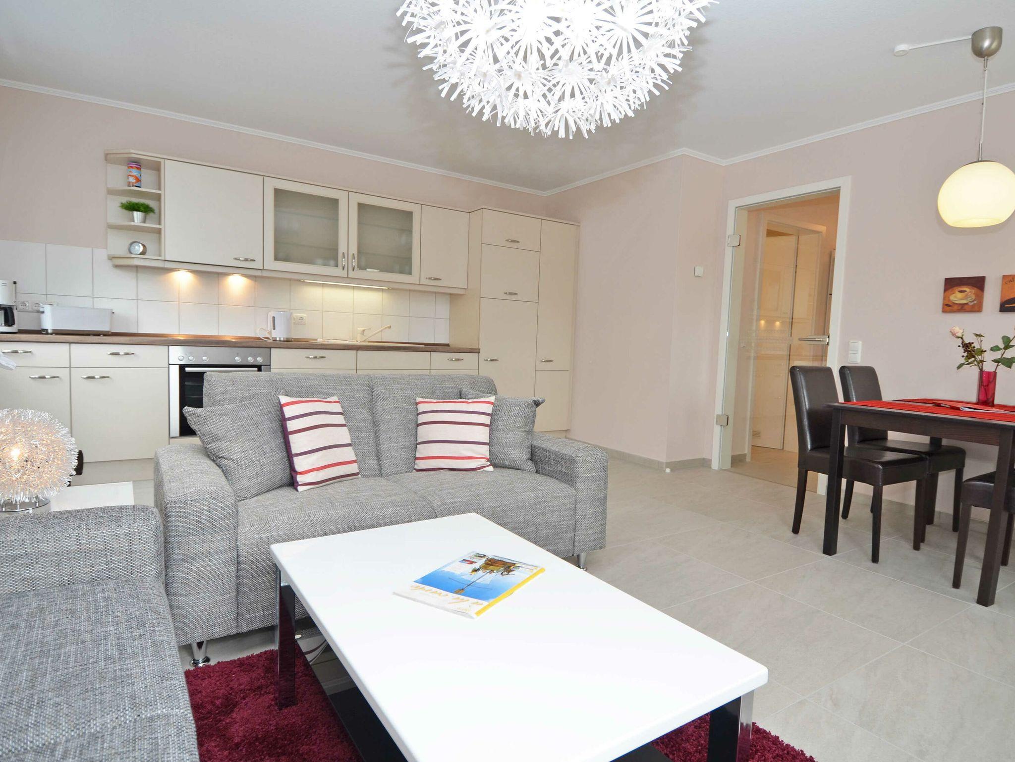 Vom Eingangsbereich aus betreten Sie den modern und sehr gemütlich ausgestatteten Wohnbereich, der mit zwei Couches, einem Flachbildfernseher und einem I-Pod-/Radio-Gerät zum Verweilen nach einem anregenden Tag einlädt. Die harmonisch im Wohnbereich[nbsp] integrierte Küchenzeile mit einem Herd mit Backofen, Spülmaschine, Mikrowelle, Kaffeemaschine, Toaster und diversem Kleininventar sowie ein Esstisch mit 4 Stühlen ermöglichen es Ihnen, Ihren Tag gemütlich bei Kaffee/Tee und Brötchen zu beginnen. Der nächste Bäcker ist ca. 5 Gehminuten entfernt!