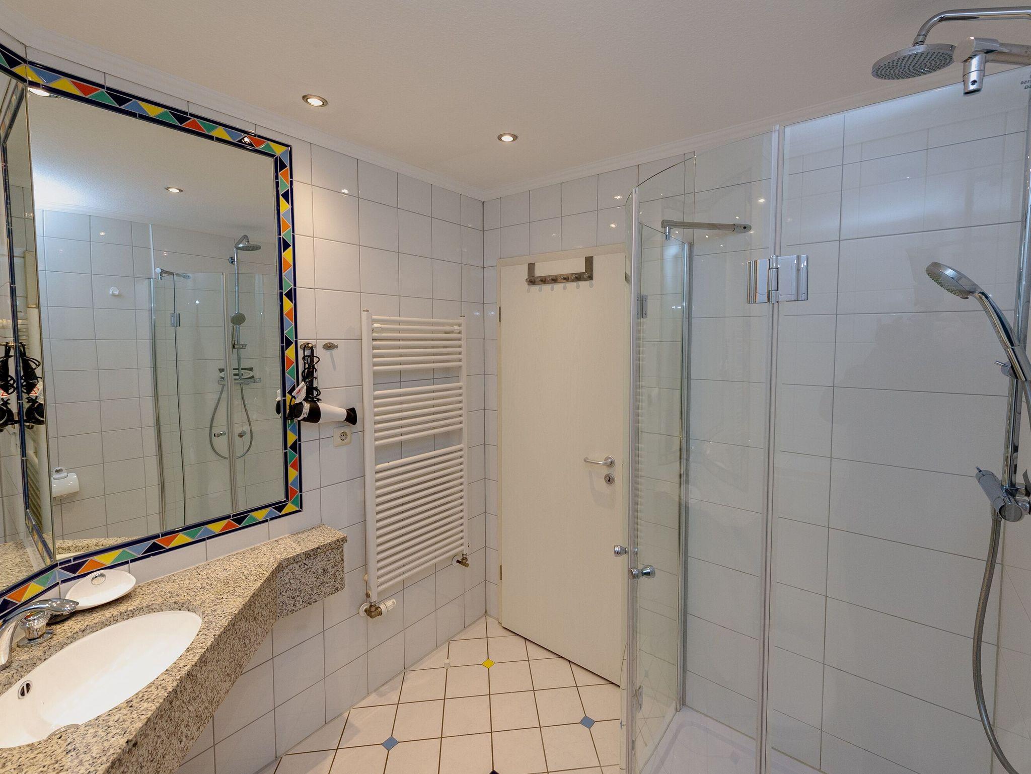 Das separate Schlafzimmer ist mit einem bequemen Boxspringbett und einem Kleiderschrank ausgestattet. Darüber hinaus steht Ihnen ein modernes Badezimmer mit Dusche/WC, Waschbecken, Fön, Kosmetikspiegel und Handtuchheizung zur Verfügung.