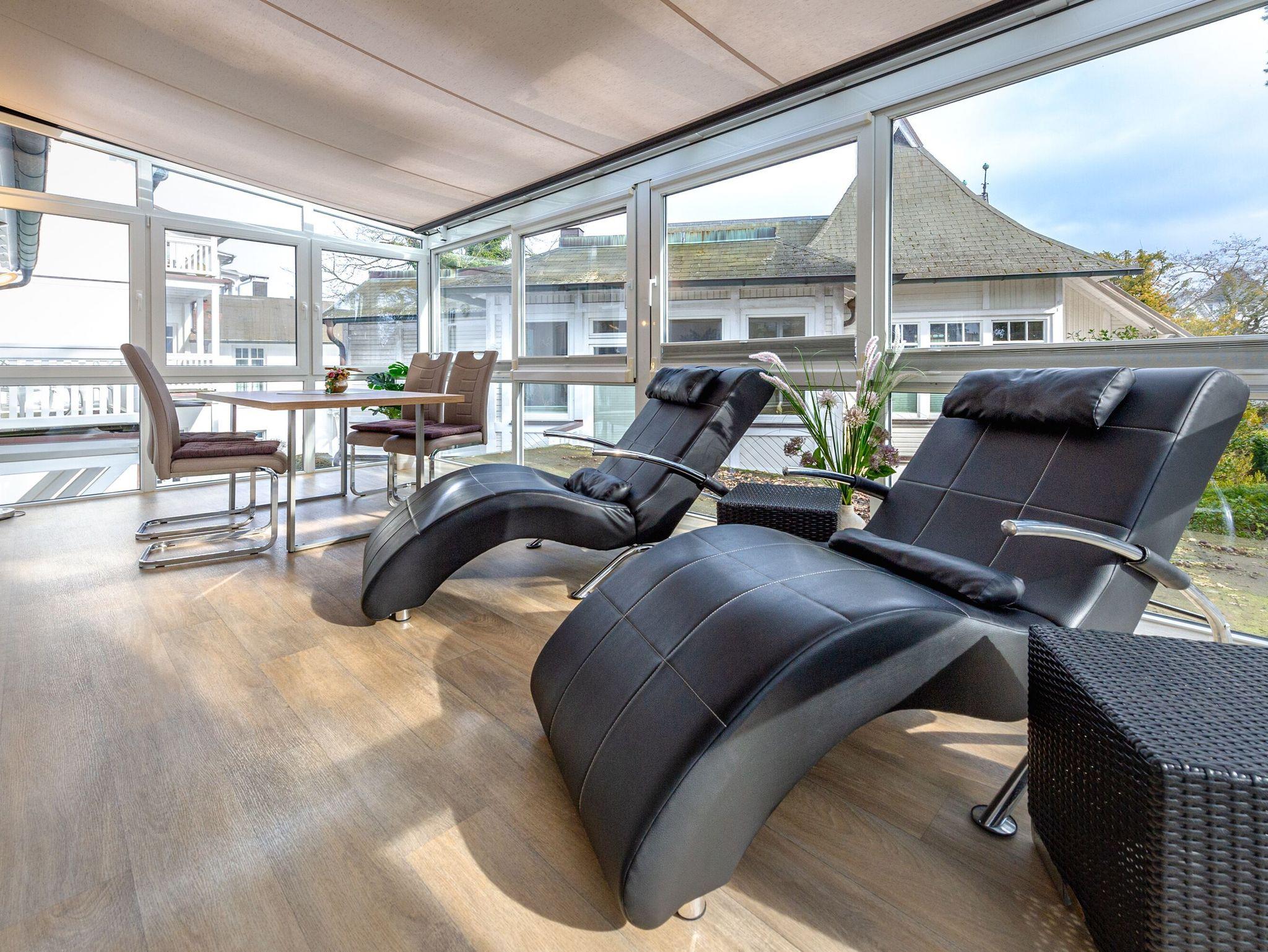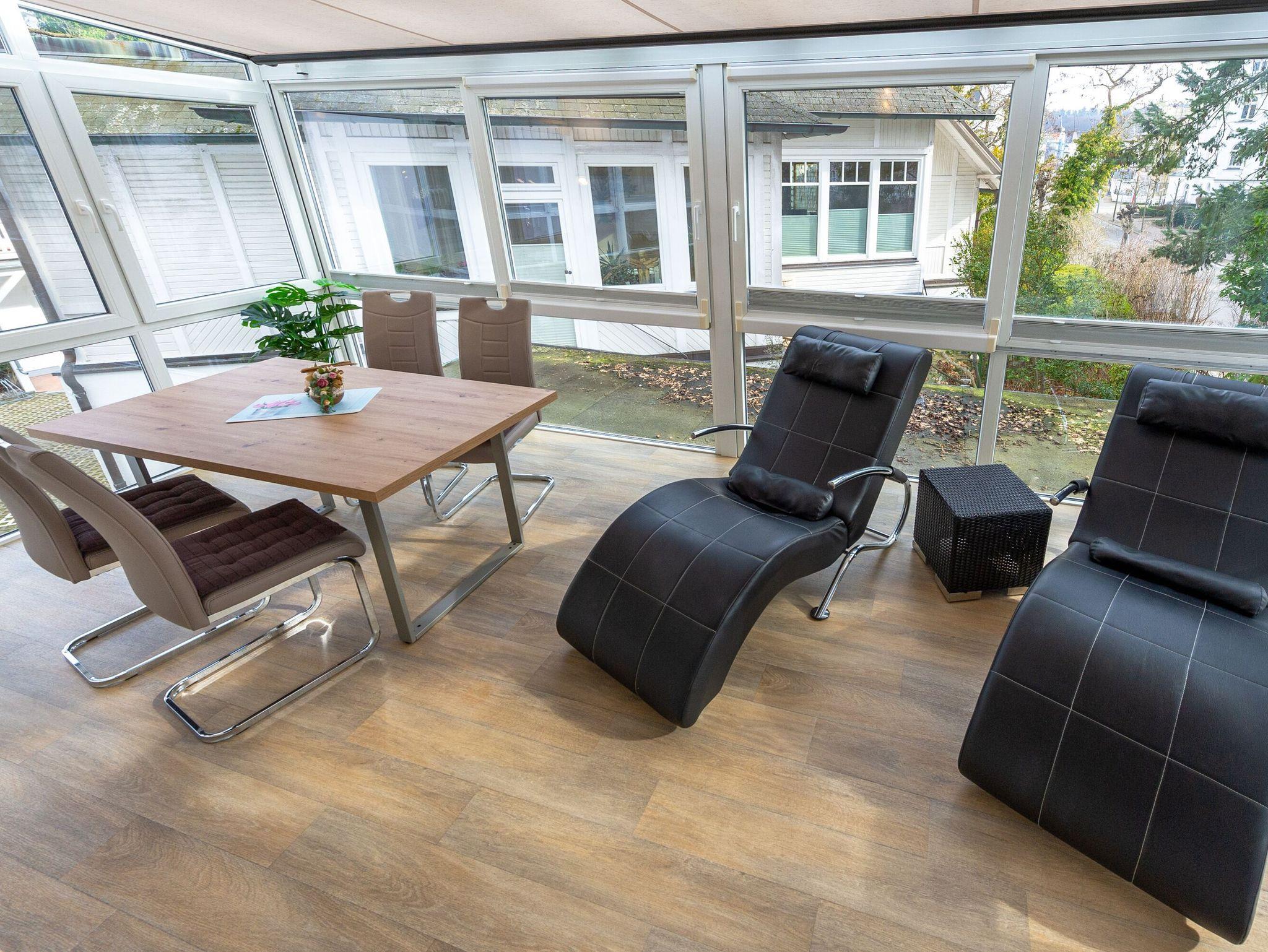 Speisen können Sie wahlweise im Wohnzimmer am gläsernen Esstisch oder im Wintergarten mit seinem großen Esstisch für 4 Personen. Zwei super bequeme Relax-Liegen laden hier ebenfalls zum Entspannen ein. Ein mobiles Sonnensegel sorgt dafür, dass Sie ganz nach Wunsch Schatten oder eben Sonne satt genießen können