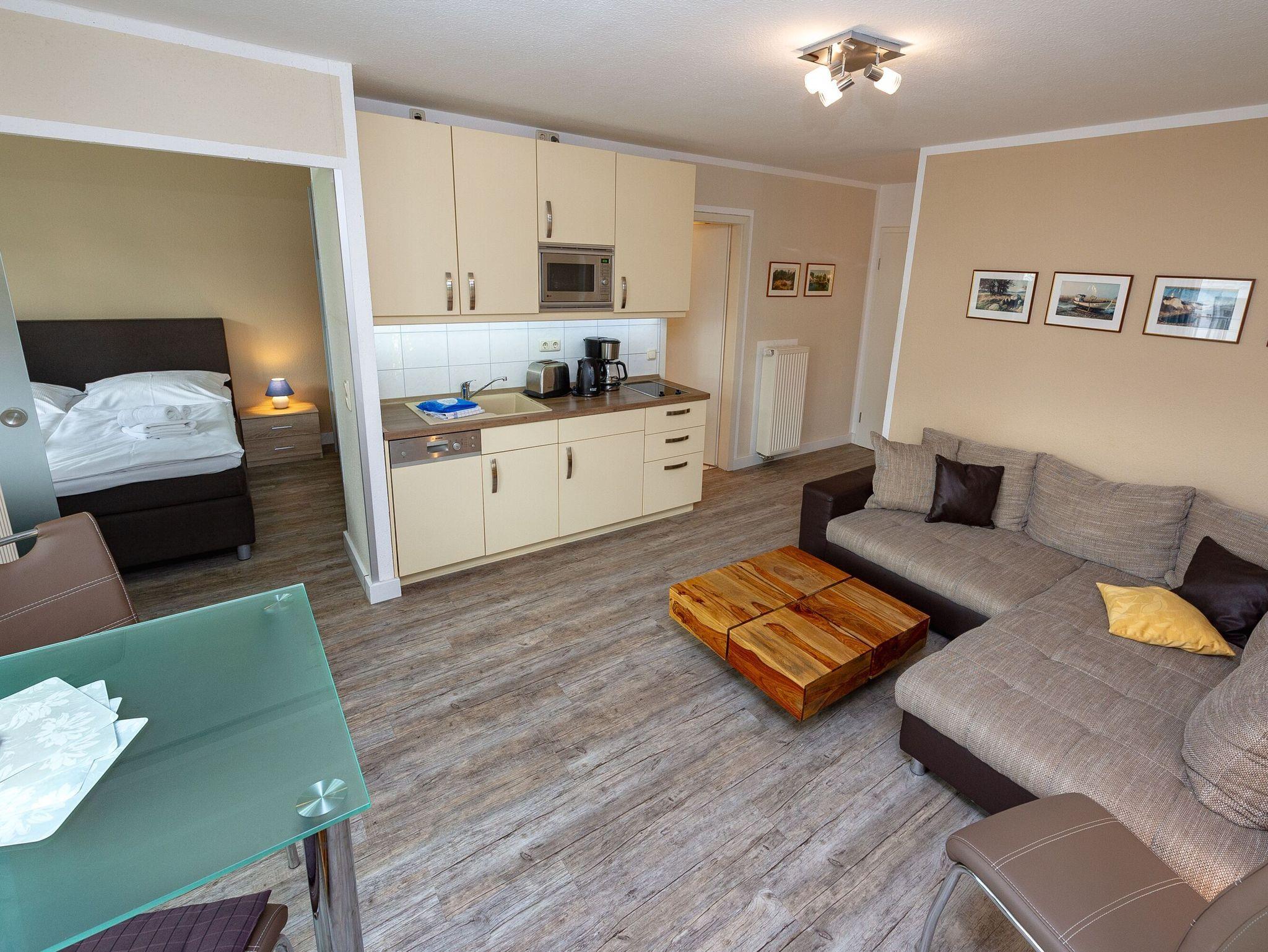 Die harmonisch in den Raum integrierte Küche bietet Ihnen unter anderem ein 2-Platten-Cerankochfeld, einen Kühlschrank, eine Spülmaschine, eine Mikrowelle, eine Kaffeemaschine sowie diverses Kleininventar, damit Sie sich bequem selbst bekochen können. Bis zum nächsten Einkaufsmarkt und gleich zwei Bäckereien sind es übrigens nur rund drei Gehminuten.