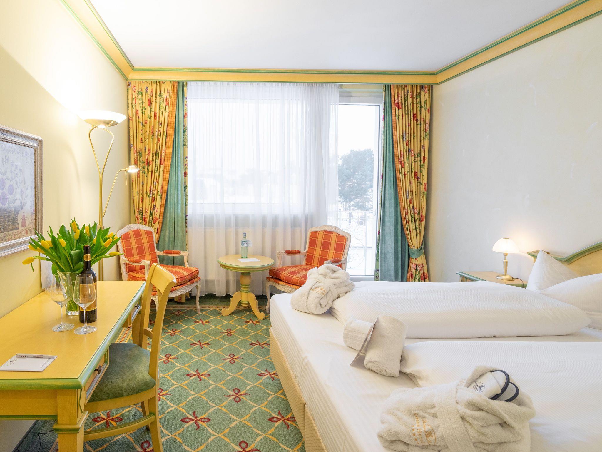 Alle Zimmer und Suiten mit Dusche bzw. Badewanne/WC, Fön, Bademäntel, Farb-TV, Durchwahltelefon, Minibar und Safe.