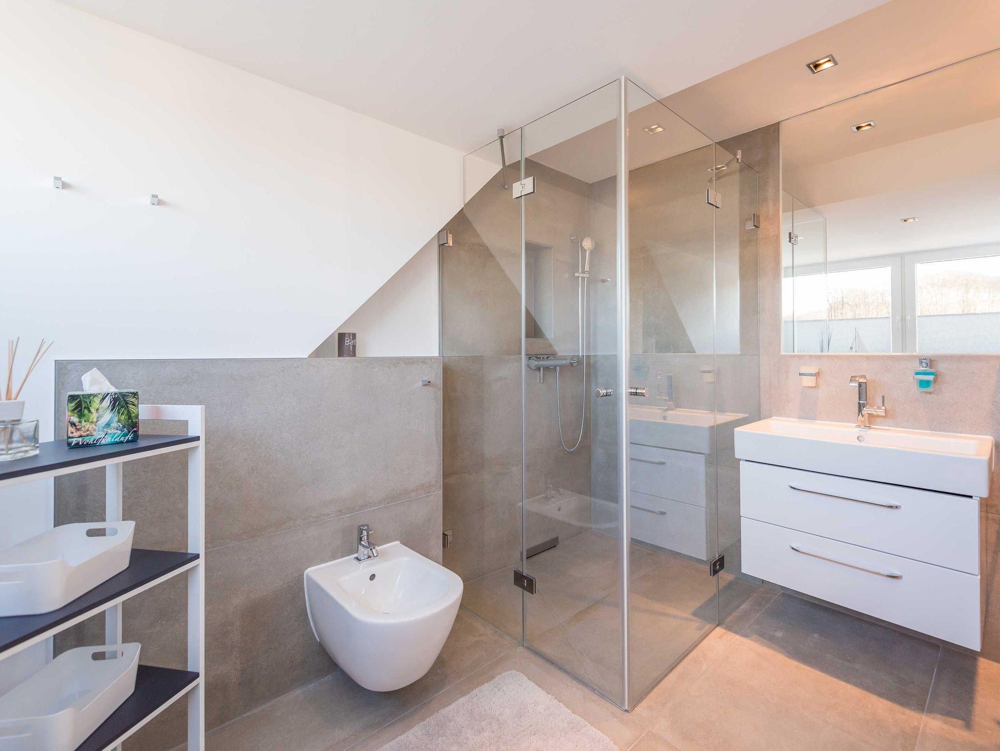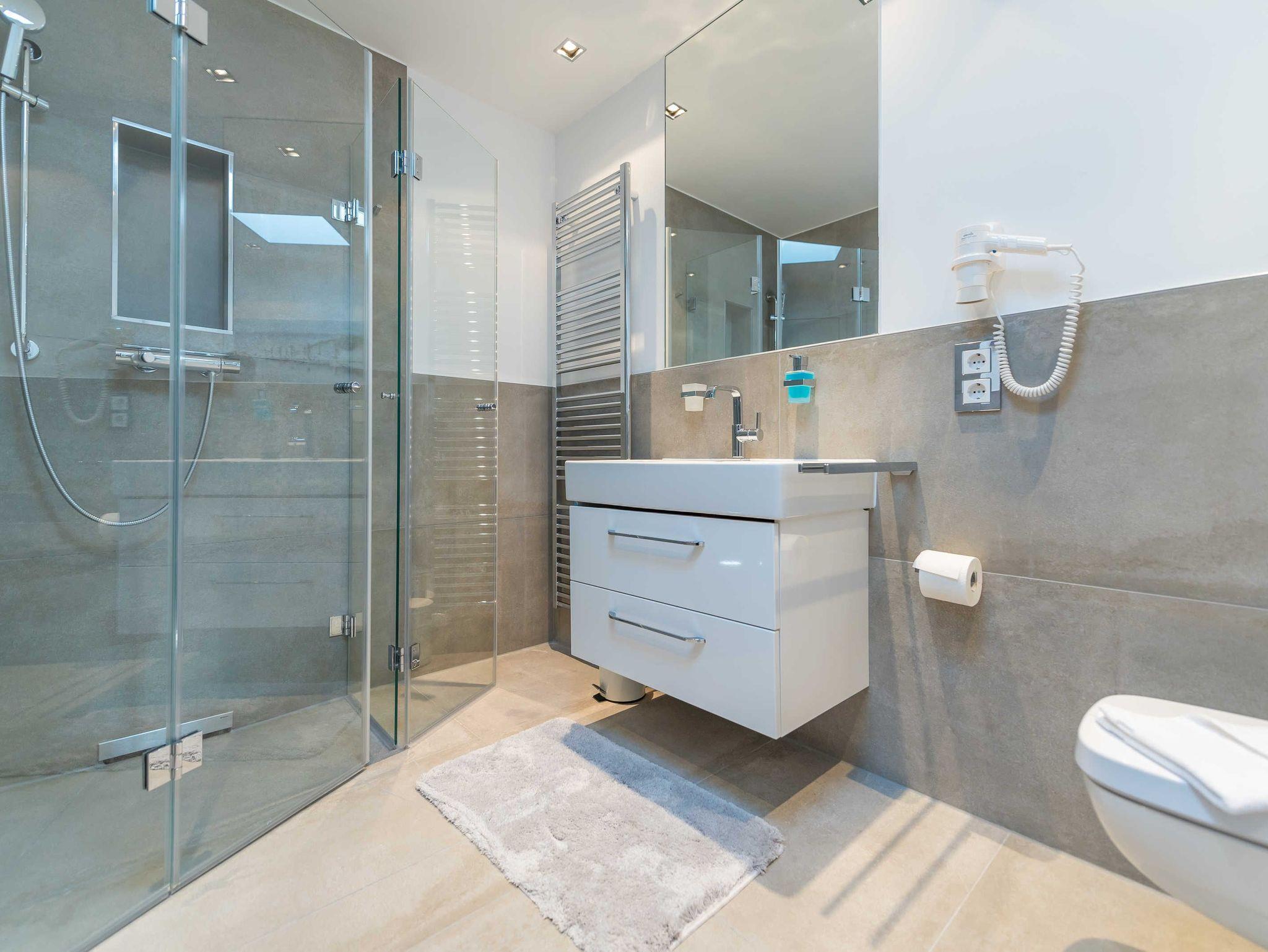 Die Bäder sind neben WC und großem Waschbecken mit hochwertigen Unterschränken und großen ebenerdigen Duschen, ein Bad zusätzlich mit Bidet, ausgestattet.