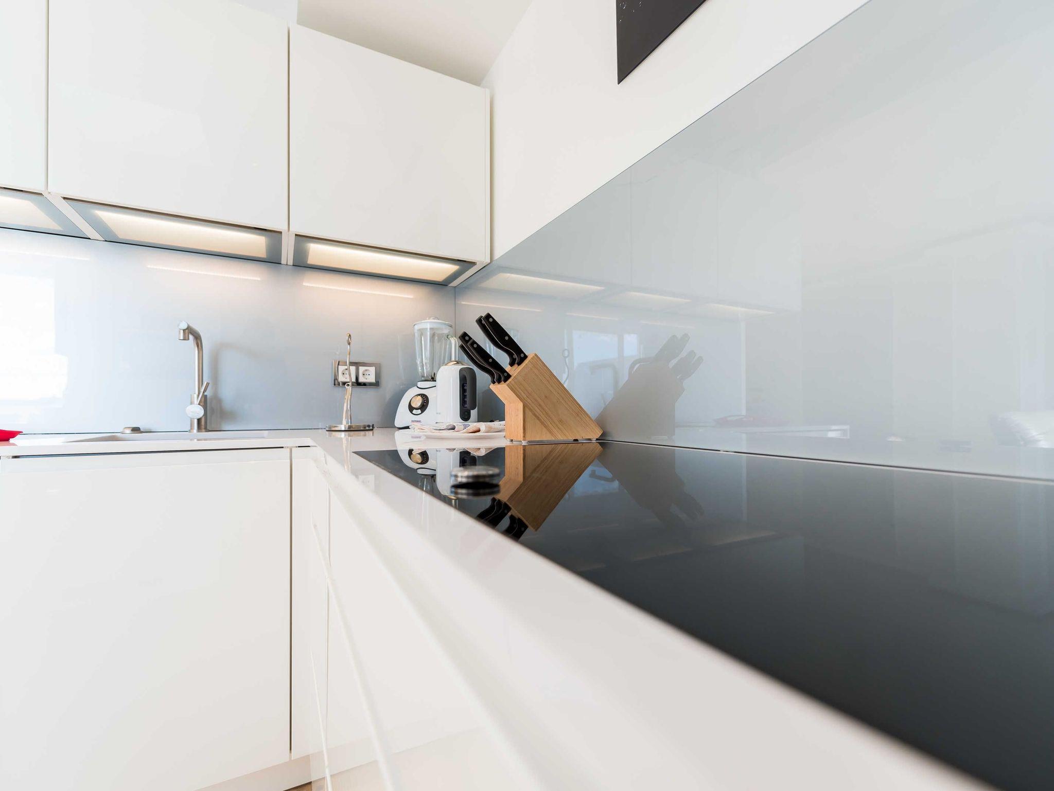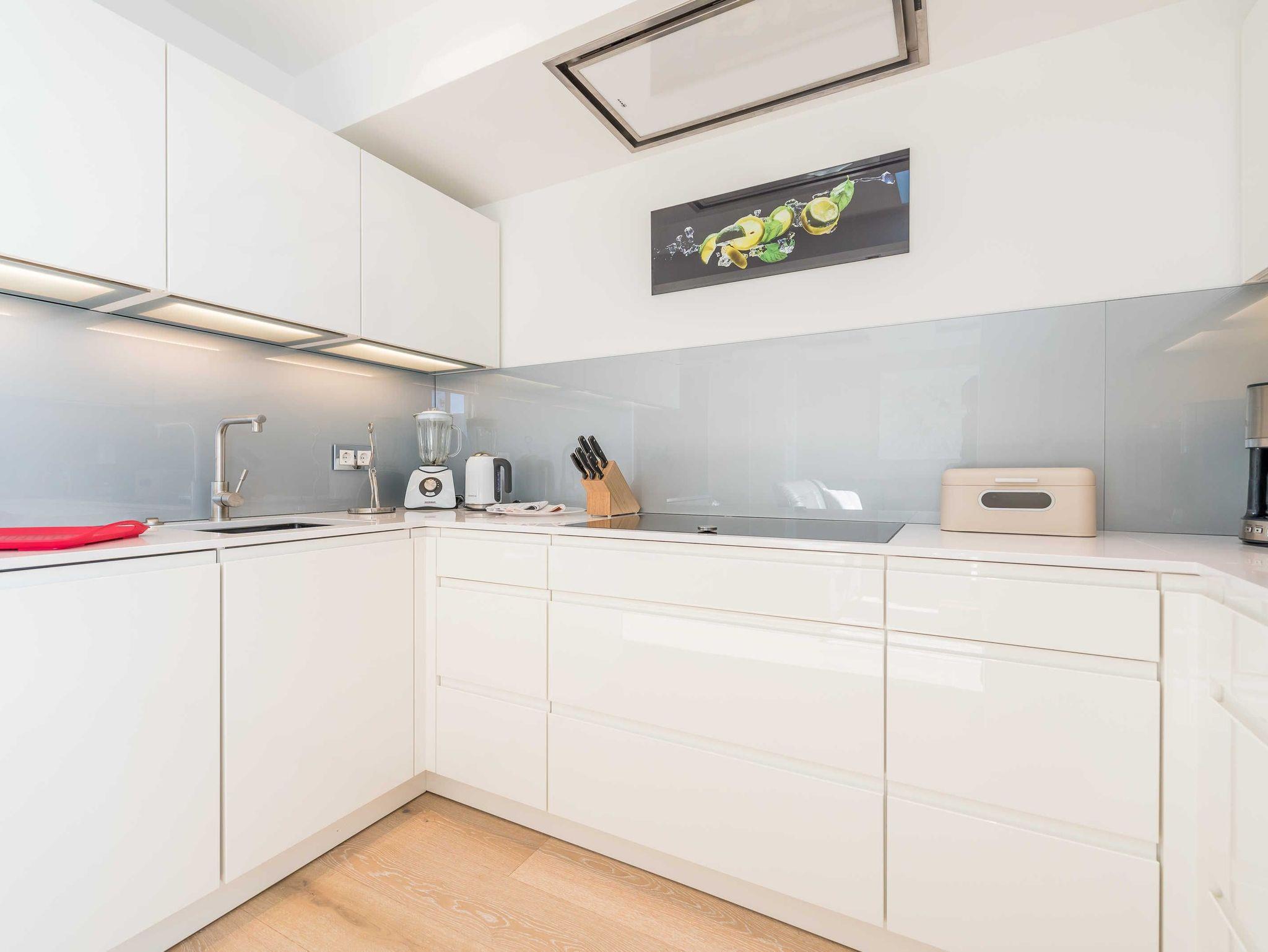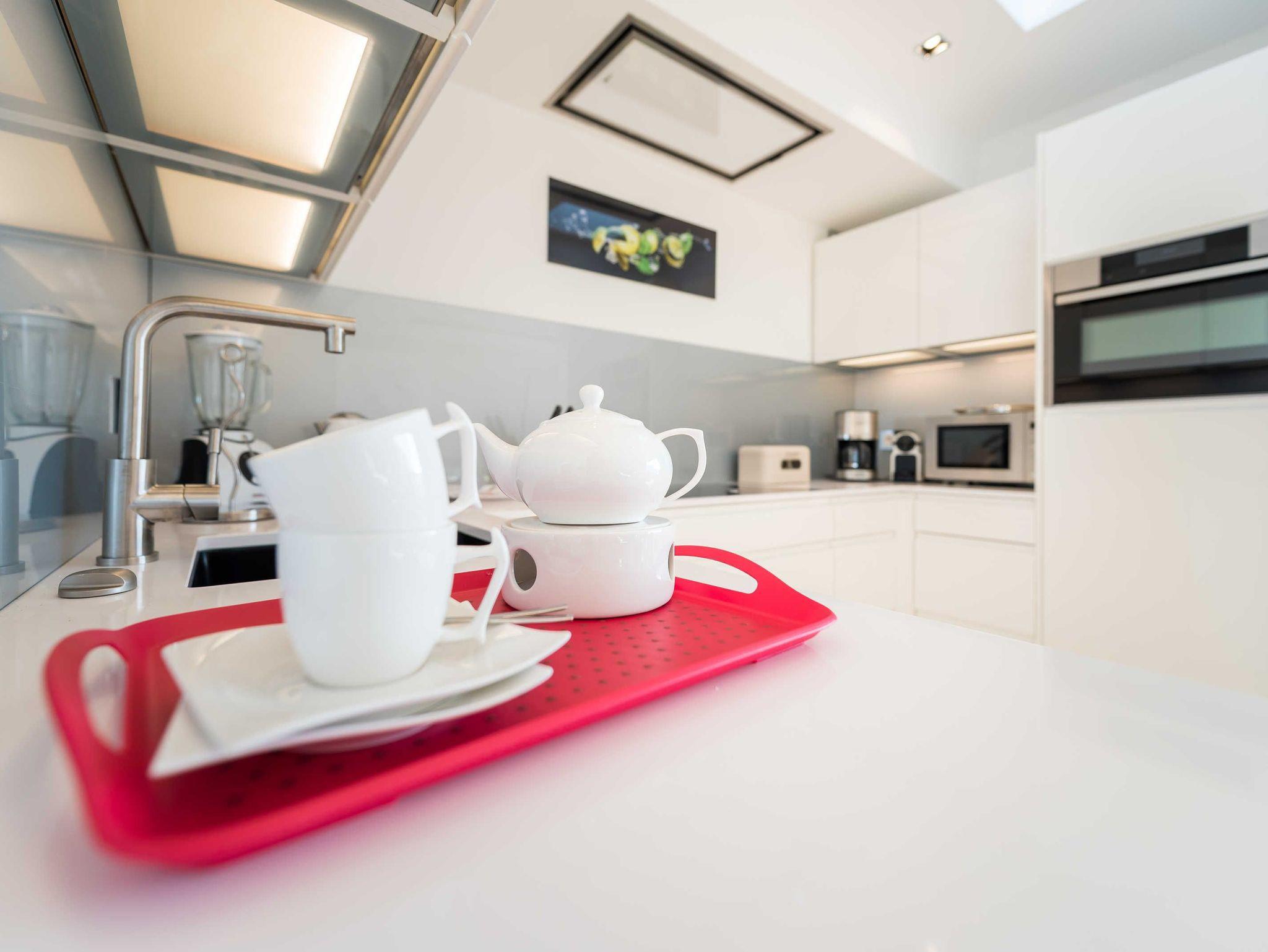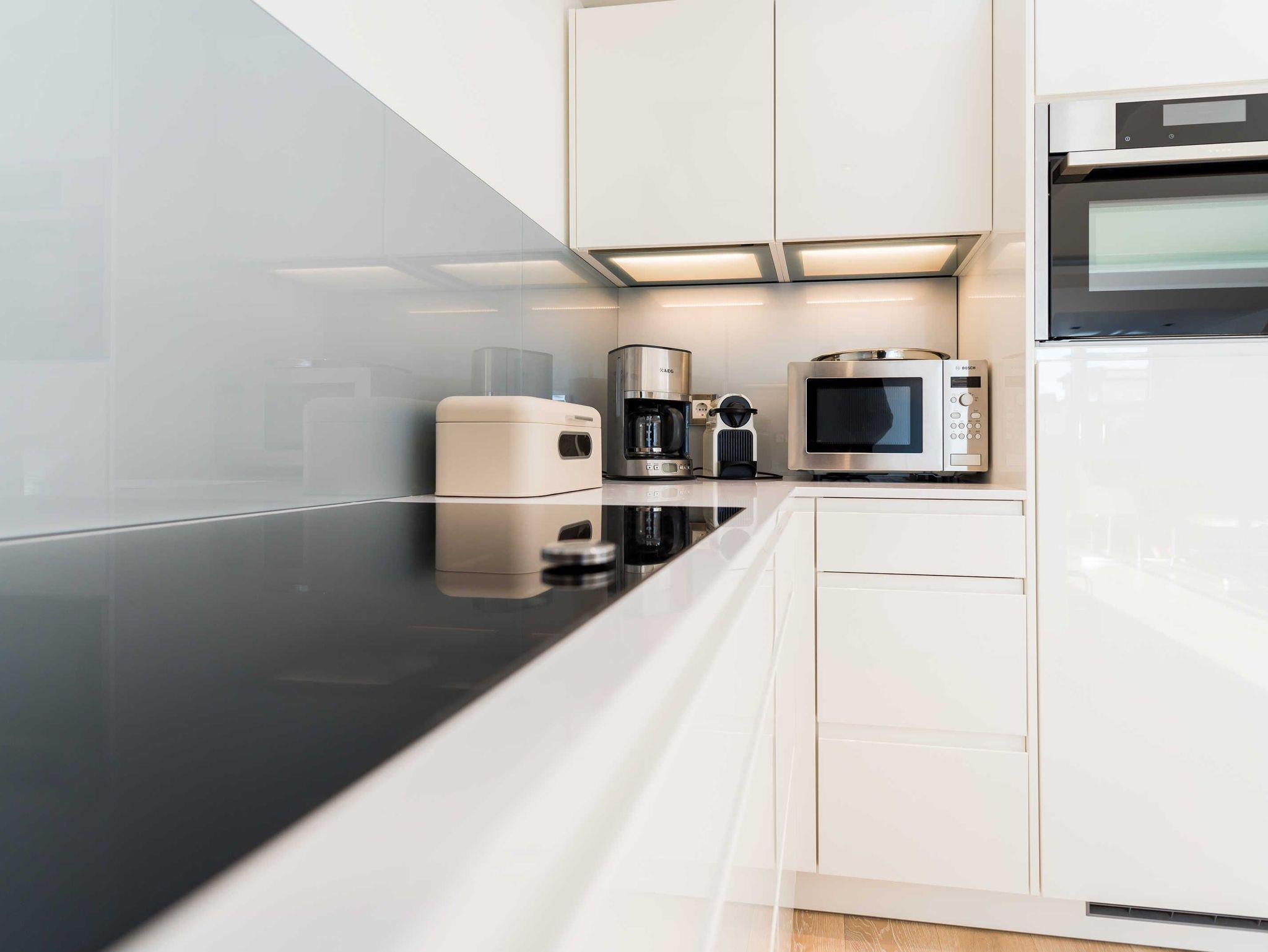 Die Küche verfügt über Mikrowelle, Backofen, Großraumgeschirrspüler, fernbedienbare Dunstabzugshaube, Induktionskochfeld, Sandwichmaker, Waffeleisen, Smoothiemaker, Kaffeemaschine, Nespressomaschine, Toaster, Wasserkocher, Mixer, Stabmixer sowie ausreichend Geschirr in modernem Design.