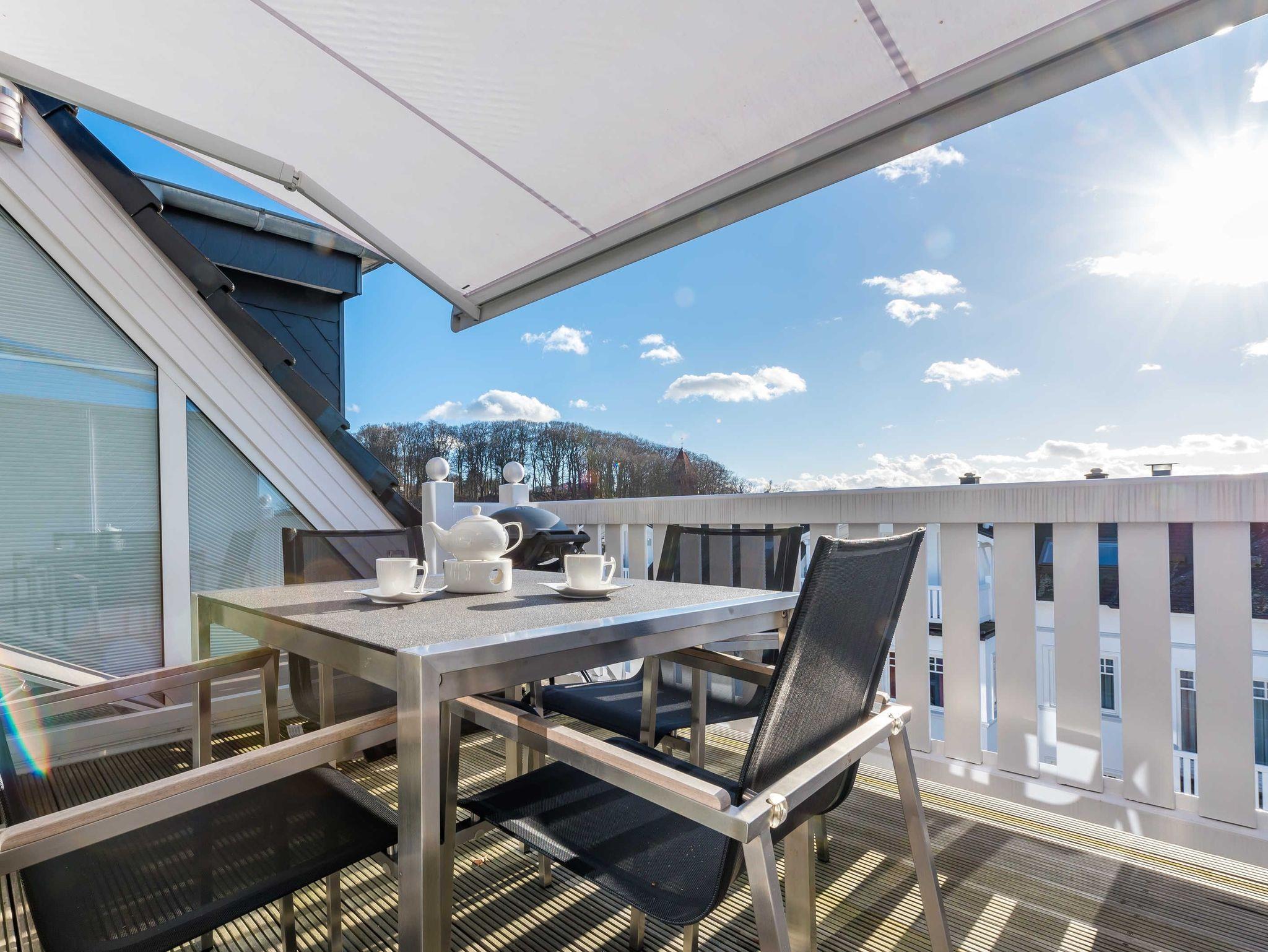 Ein besonderes Highlight ist die von 3 Seiten geschützte Dachterrasse mit hochwertiger Liege und entsprechenden Sitzmöglichkeiten, auf der man bei einem guten Glas Wein mit Blick über die Dächer von Binz den Tag bis spät in den Abend ausklingen lassen kann. Auf Wunsch sorgt eine Markise auf Knopfdruck für Beschattung.